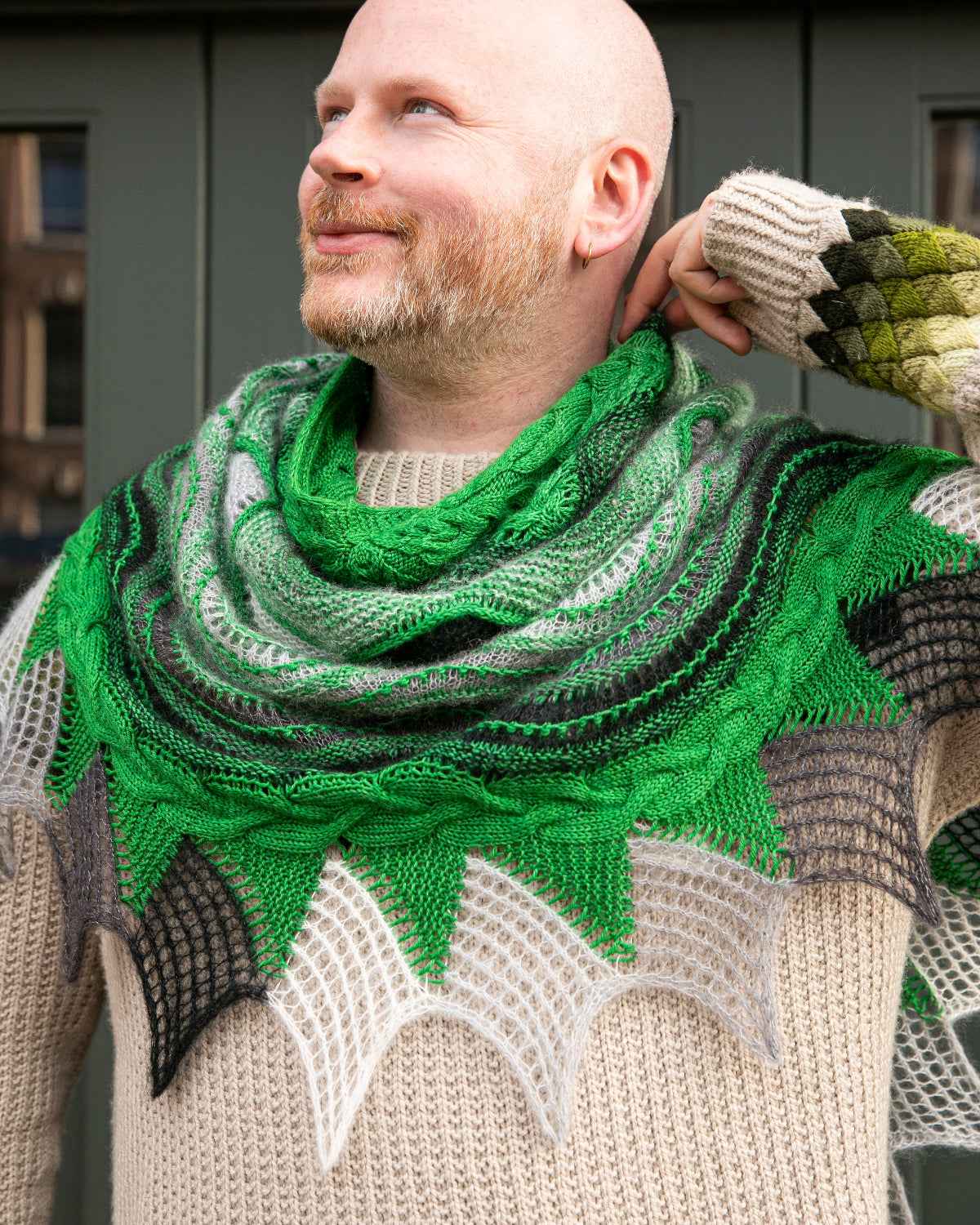 This pattern is available in sizes from XS to 5XL, and the Cycling Adventures kit provides enough yarn to knit it in any of these sizes! The Bubble Cardigan is knit top-down and has an oversized fit with drop shoulders. It uses the Bubble Stitch for the body, and brings in a beautiful solid colour for the collar, cuffs, and ribbing.