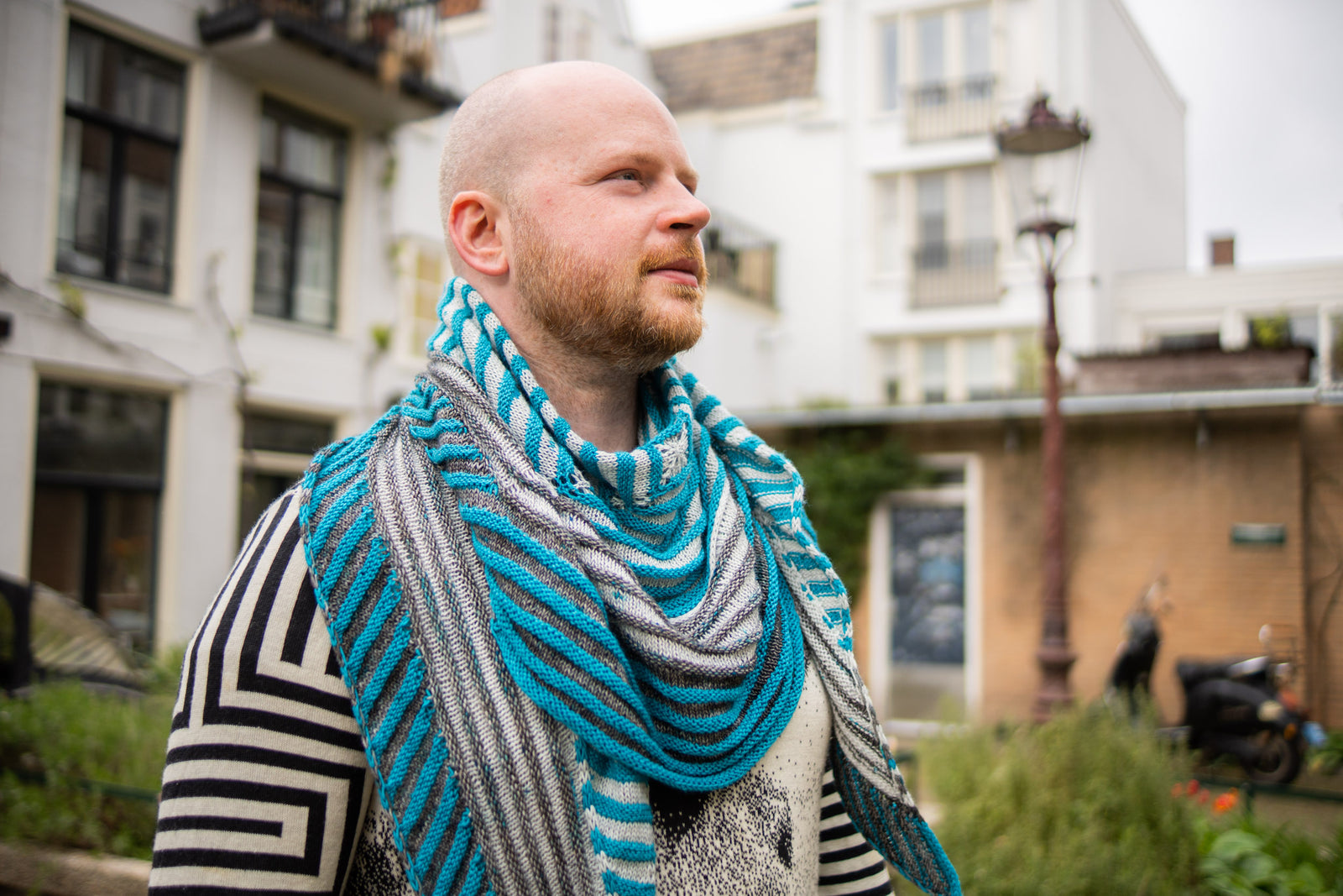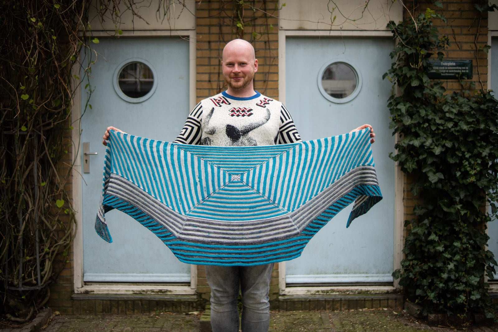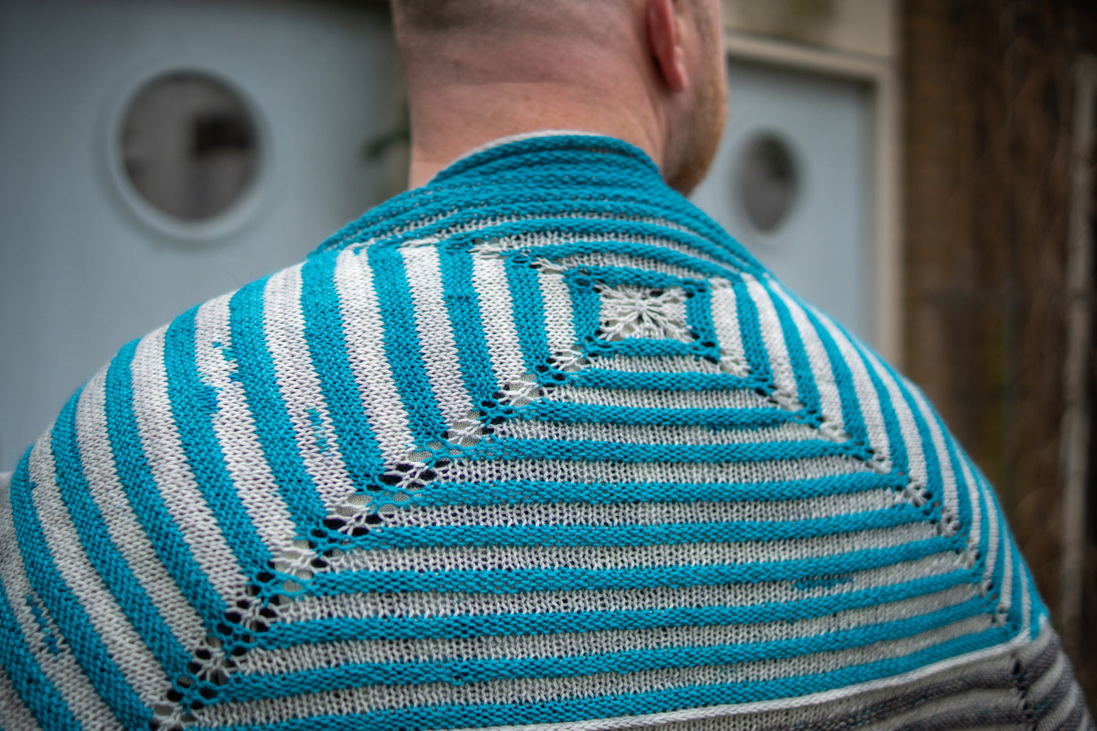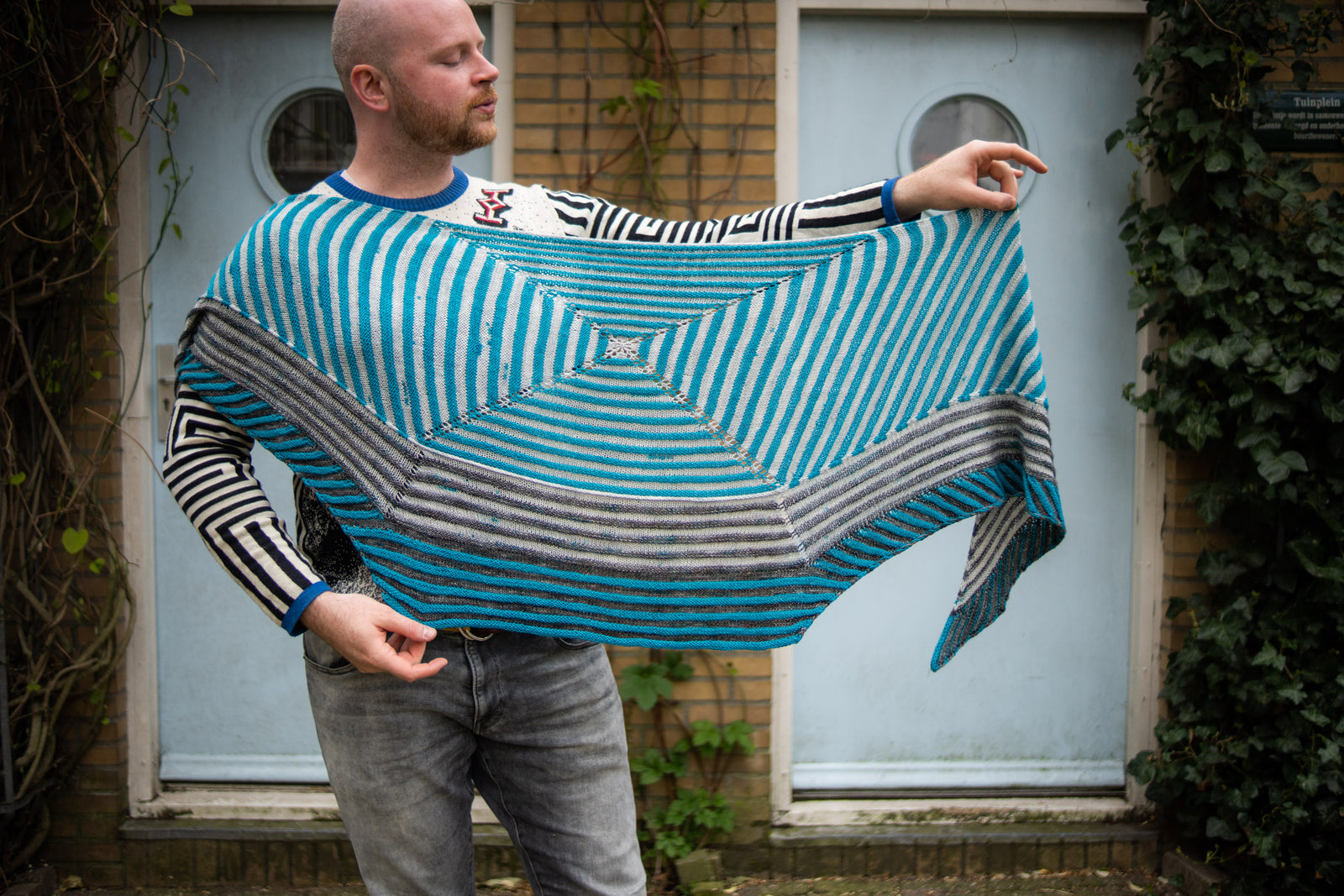 Yarn Requirements: 300g of fingering weight yarn in three coloursThis graphic striped shawl features three colours of fingering weight yarn. Begin in the centre and knit outward with eyelet increases for the square shape in Section 1. Continue to knit the wingtips for bold stripes. The other sections are knit by picking up stitches, so you don’t have to do any seaming. The angular stripes converge into a striking geometric shawl with simple clean lines and easy to knit rows.