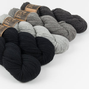 This beautifulWest Wool kit contains ten skeins of fingering weight yarn.With four skeins of a main colour and three gorgeous contrasting colours, this kit can be used for any of these Westknits shawls.