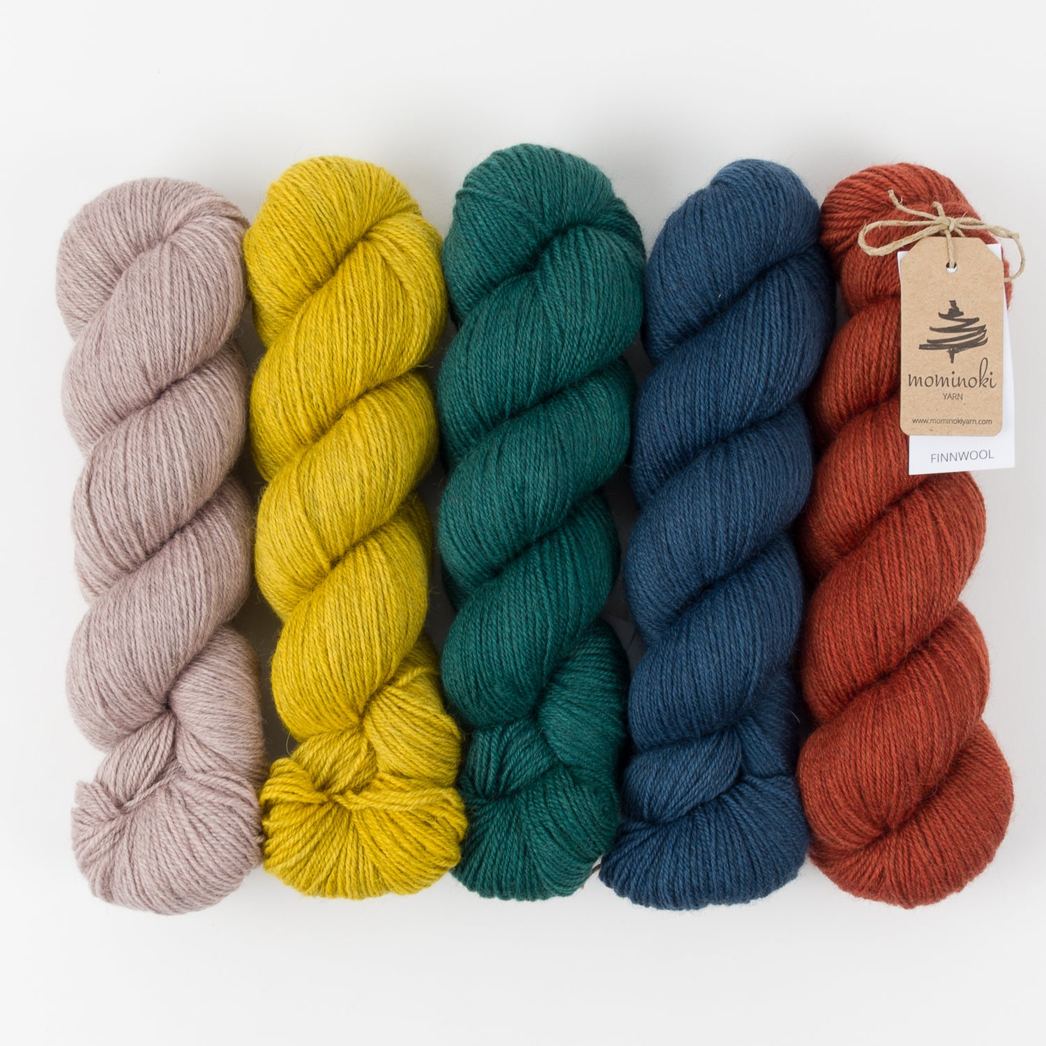 This beautifulMominoki Yarn kit contains five skeins of fingering weight yarn. If you need inspiration, it can be used to knit any of these Westknits shawls.