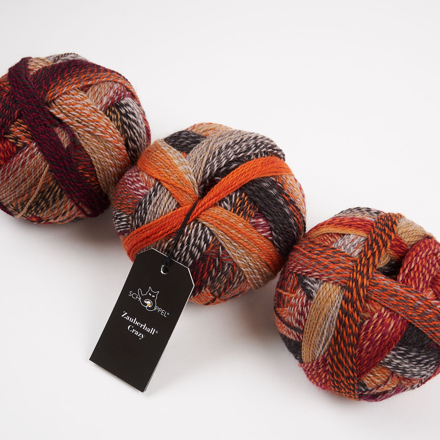 Self-striping Zauberball Crazy by Schoppel Wolle is a versatile fingering weight yarn that produces unique, non repeating colour blocks, perfect for fun accessories and shawls.