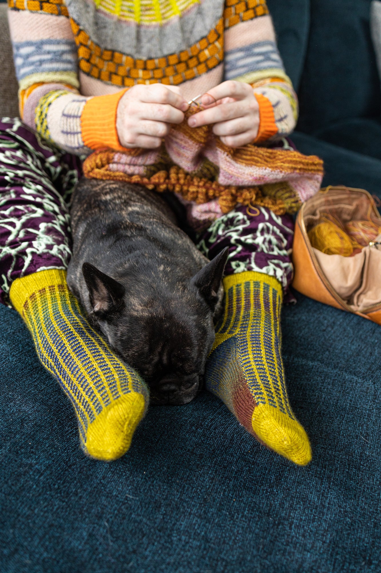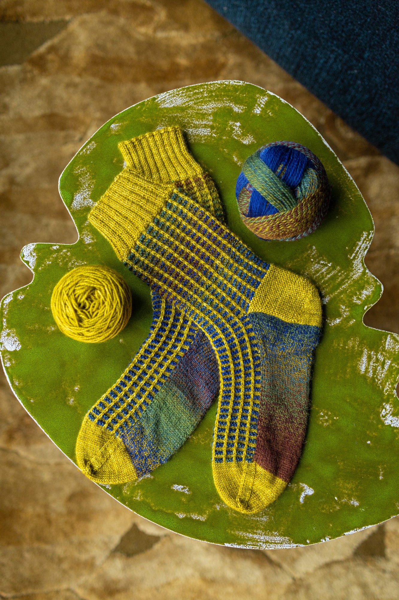 Choose your favourite kit featuring one skein of fingering weight Life in the Long Grass High Sock Twist paired with a self-striping ball of Schoppel-Wolle Zauberball Crazy for the Botanic Socks from Westknits! The socks begin with the ribbed cuff followed by stripes and slip stitches on the leg. You only work with one colour a time while working the simple slip stitch pattern. The top of the foot is knit flat with the same slip stitch columns. Then, the heel flap and heel turn are worked in a pop of colour. The gusset and sole of the sock are knitted flat in stockinette stitch while being seamlessly attached to the top foot fabric.