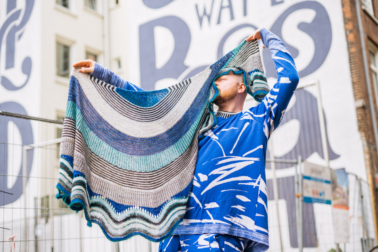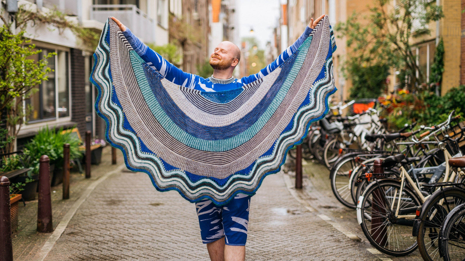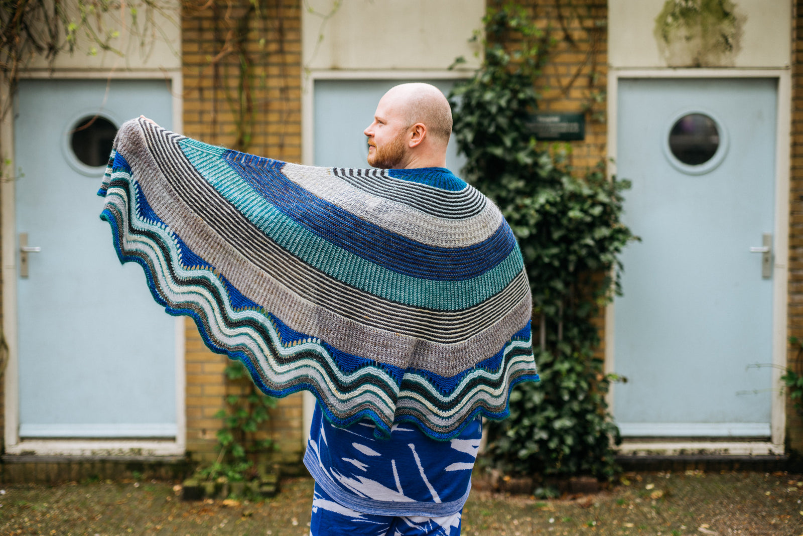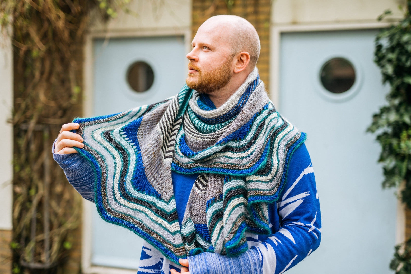 This semi-circular shawl is knit with fingering weight yarn for a large lightweight fabric. Seven colours stripe together as bands of brioche stitch mix together with simple striped sections. The textural changes yield an entertaining project with exciting colour changes.
