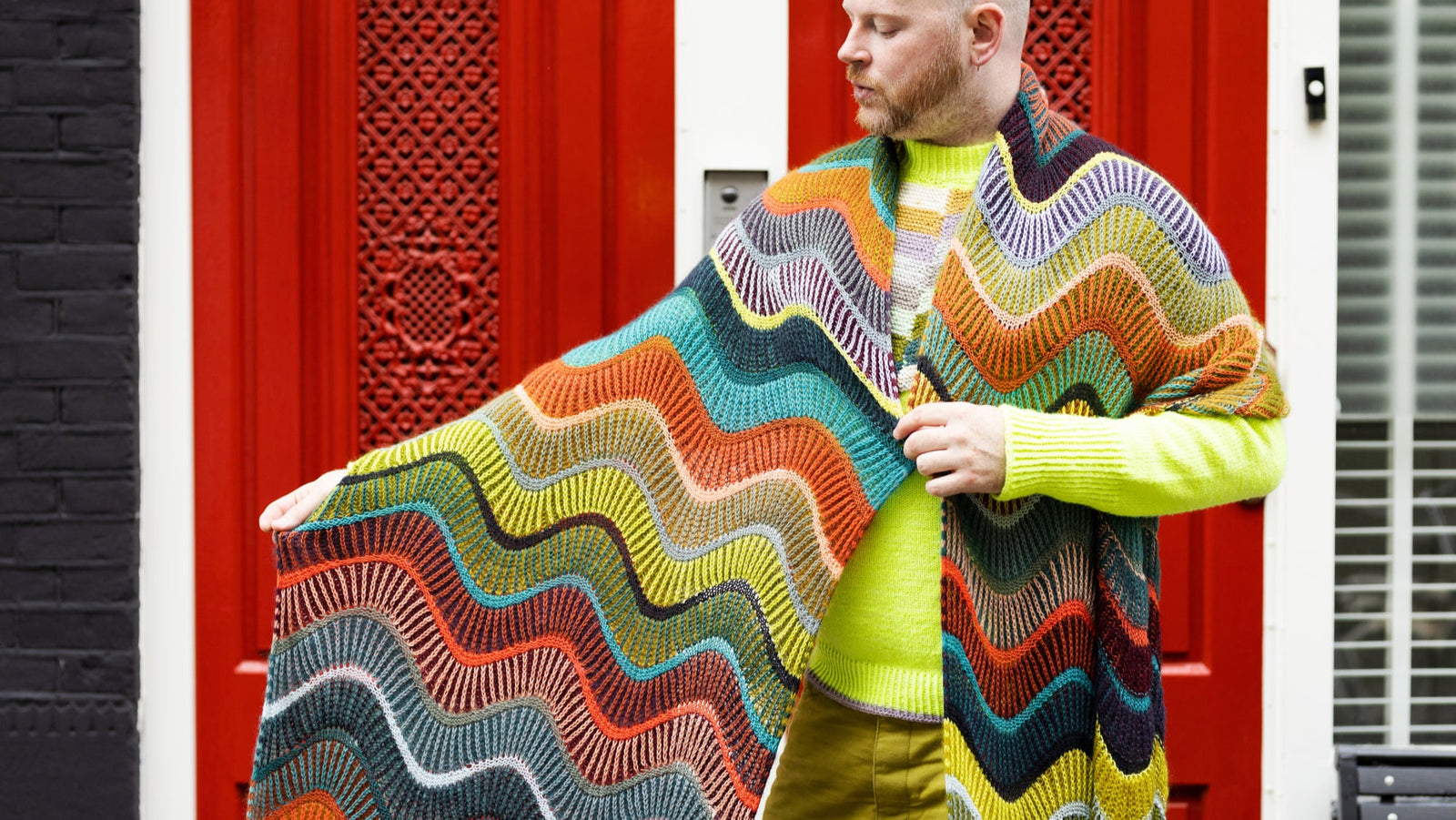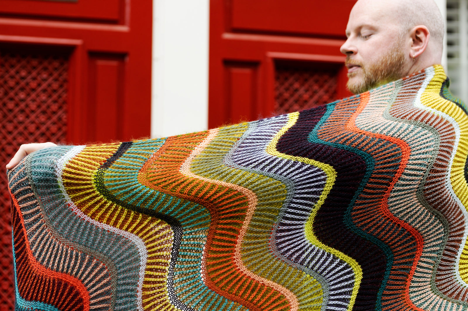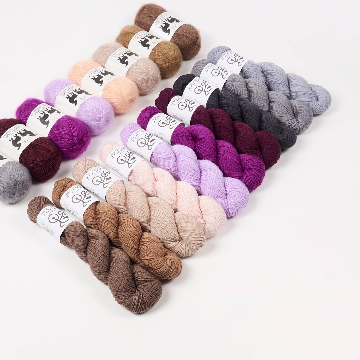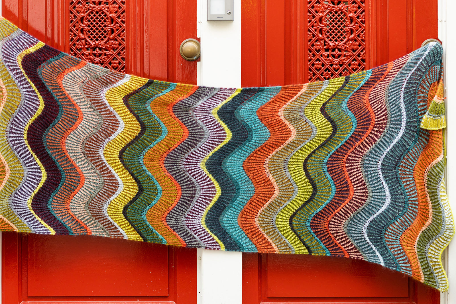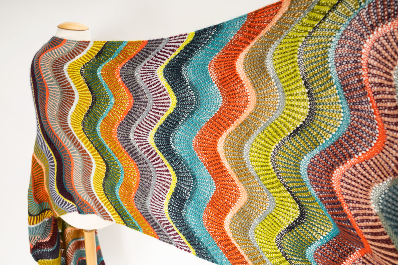 The Brioripple Wrap features wavy bands of two-colour brioche and reverse stockinette stripes. The background of each brioche section features two strands of mohair lace yarn held together in the same colour for a soft and fluffy effect. The foreground brioche colours and reverse stockinette stitch stripes are knitted with one strand of fingering weight wool. Choose your favourite West Wool kit featuring ten skeins of fingering weight Tricycle and eight skeins of fluffy mohair lace Glowair. The yarn in the kit is enough to knit a large wrap. You can customise your brioche colour combinations as well as the size of the wrap. You can also add fingering weight colour pops from your personal stash to create a one of a kind colourful fabric!