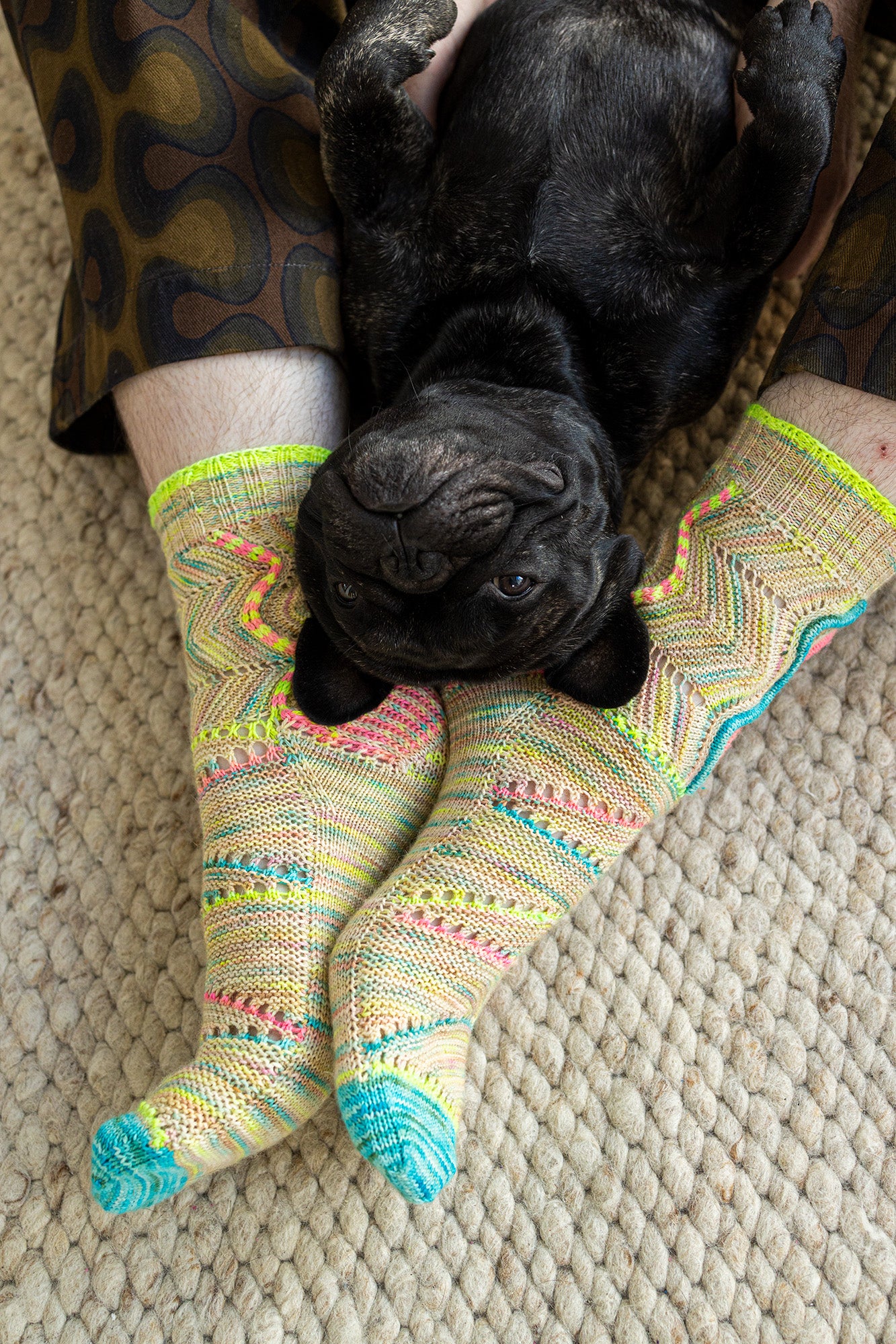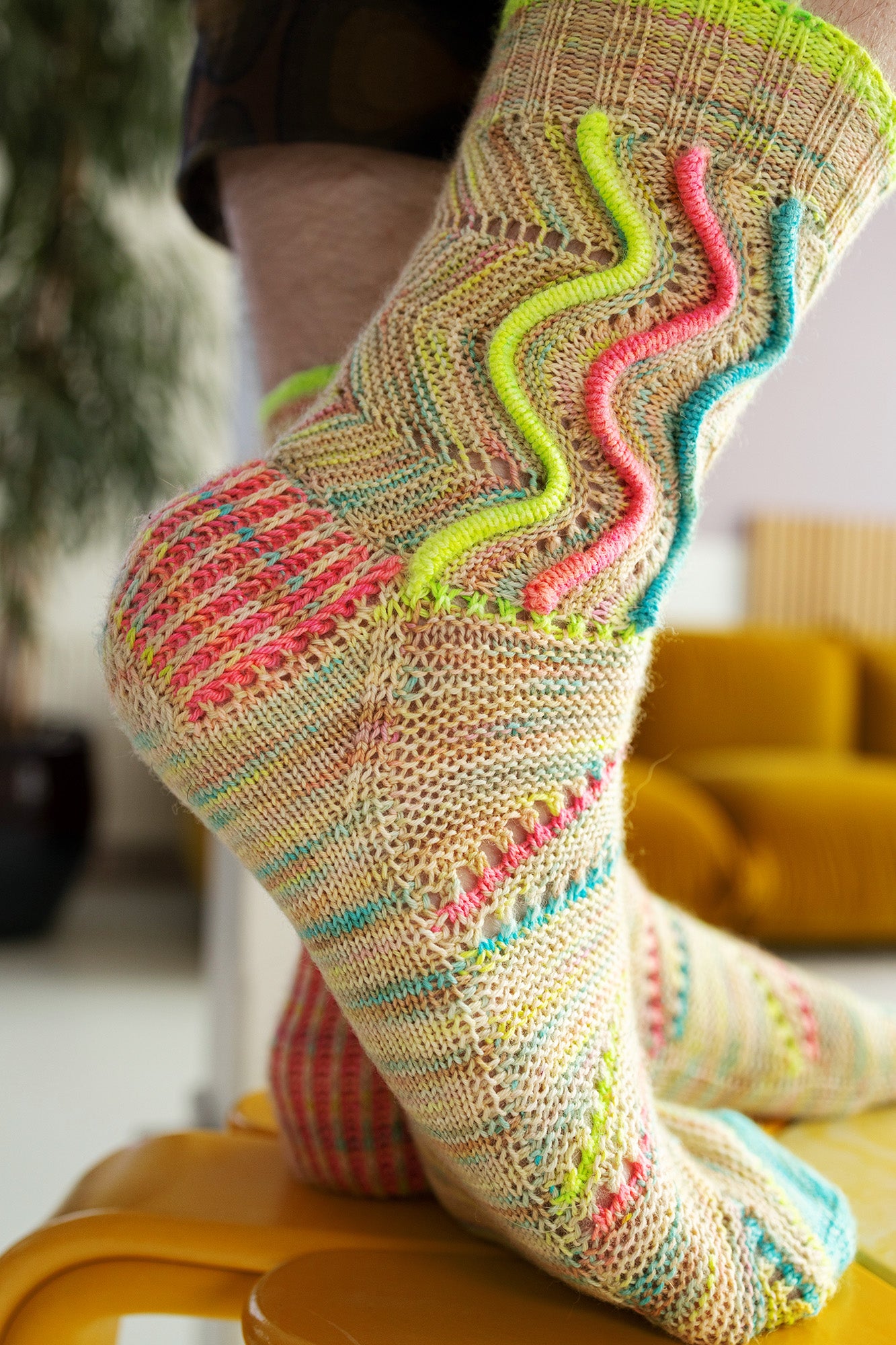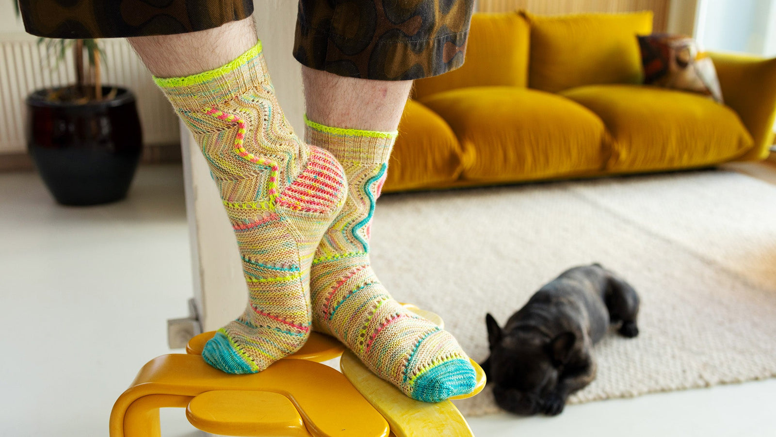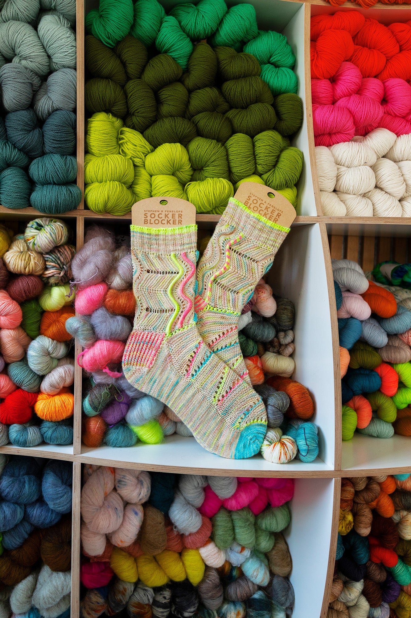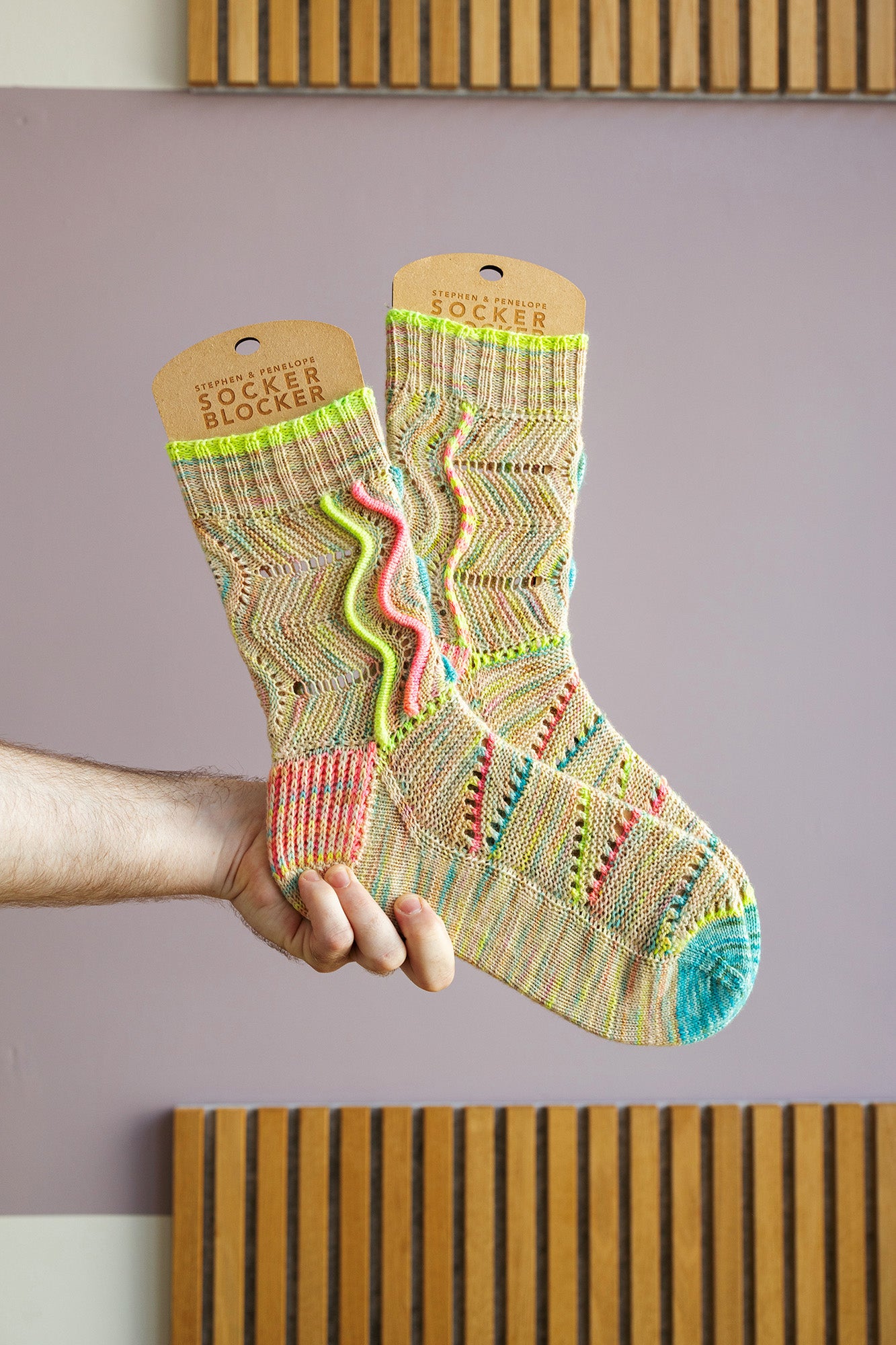 These snazzy socks were originally launched during the 2024 Westknits Surprise Sock Along! The unique modular construction knit flat is decorated with chevrons, waves, eyelets, and three dimensional welts in your contrast colours that really pop! For adventurous beginners who are new to knitting socks, Stephen's clear and concise video tutorials will guide you through each step of the pattern as you knit a truly unique pair of socks!