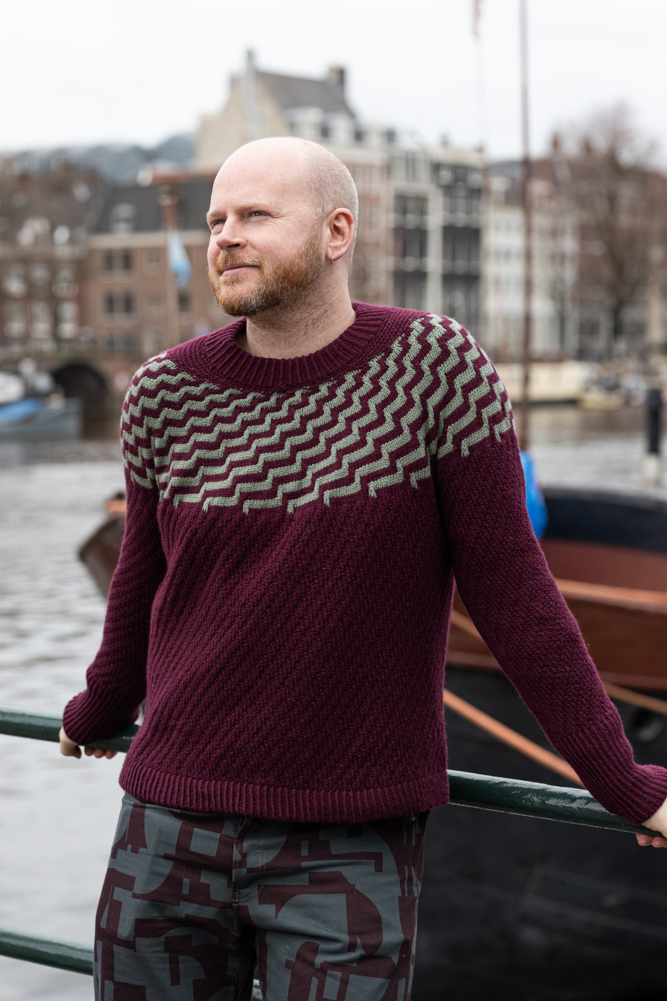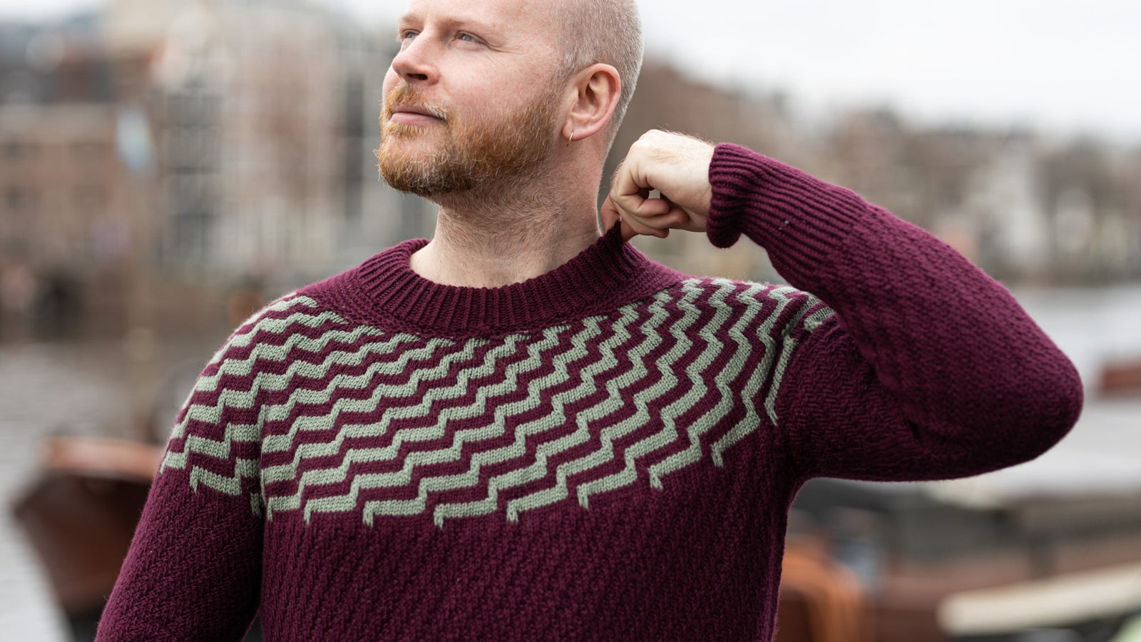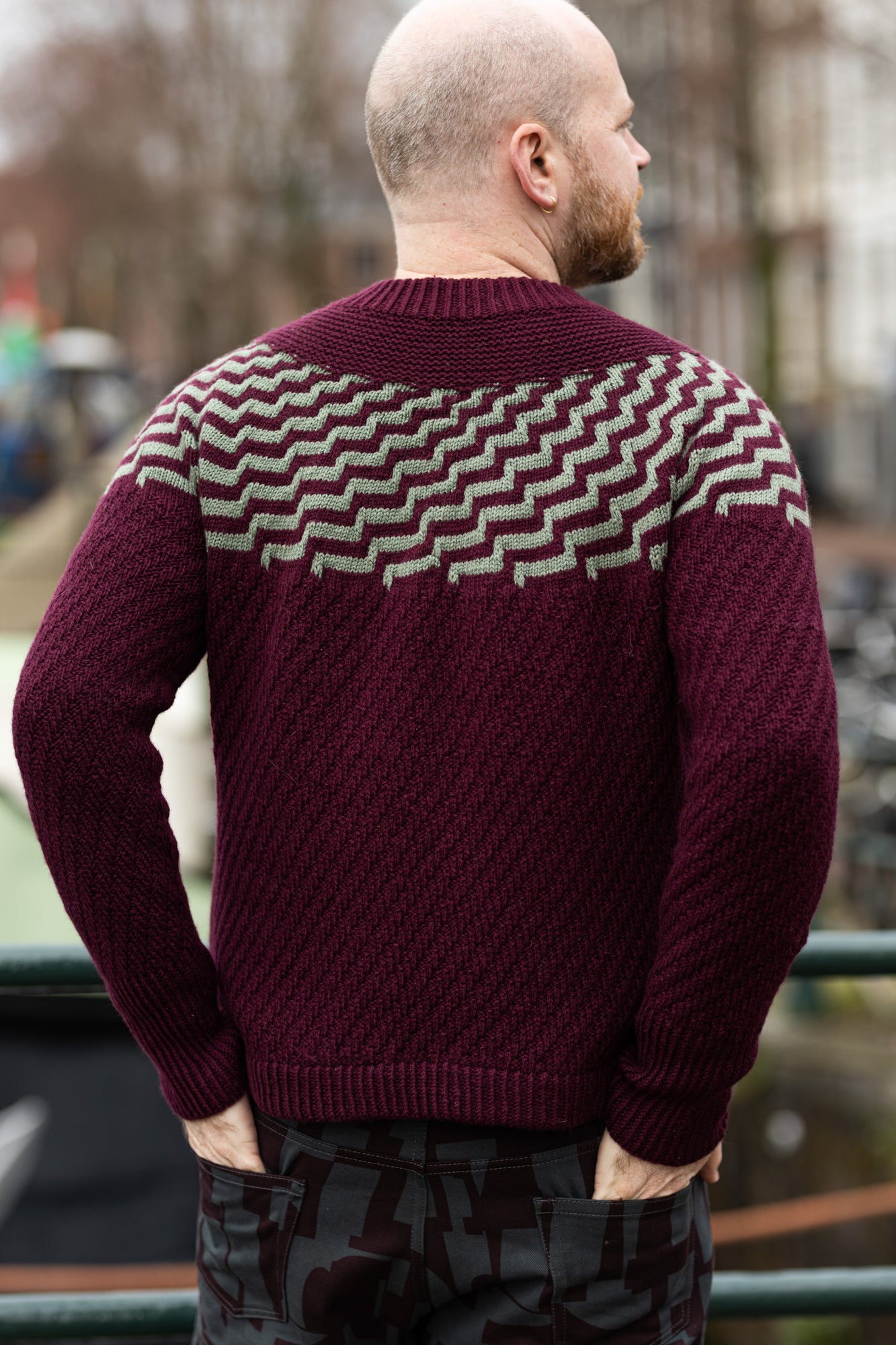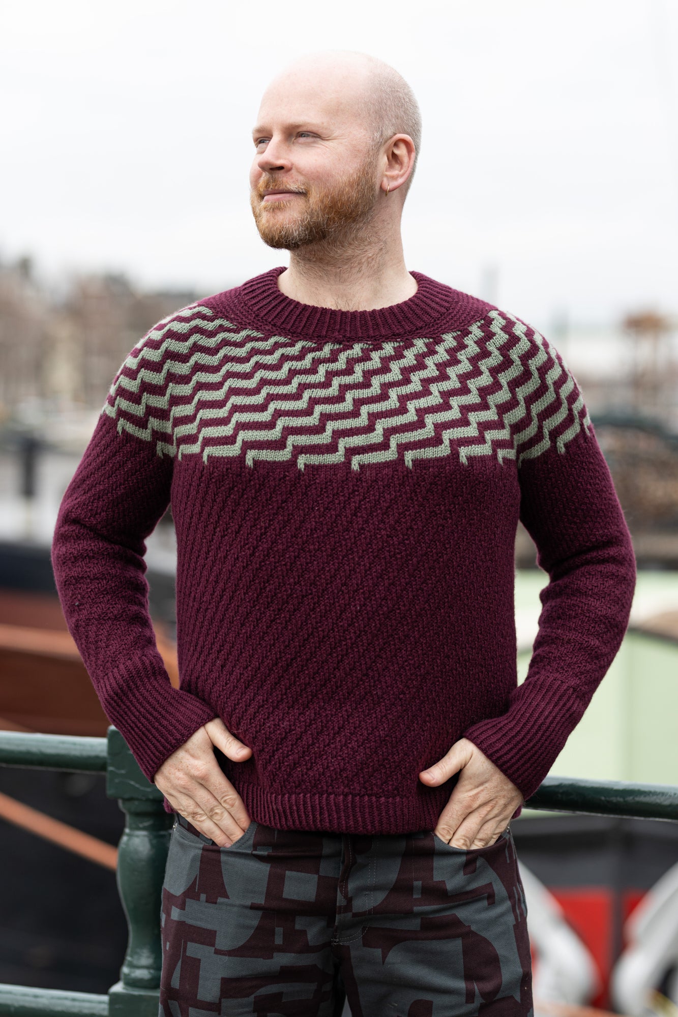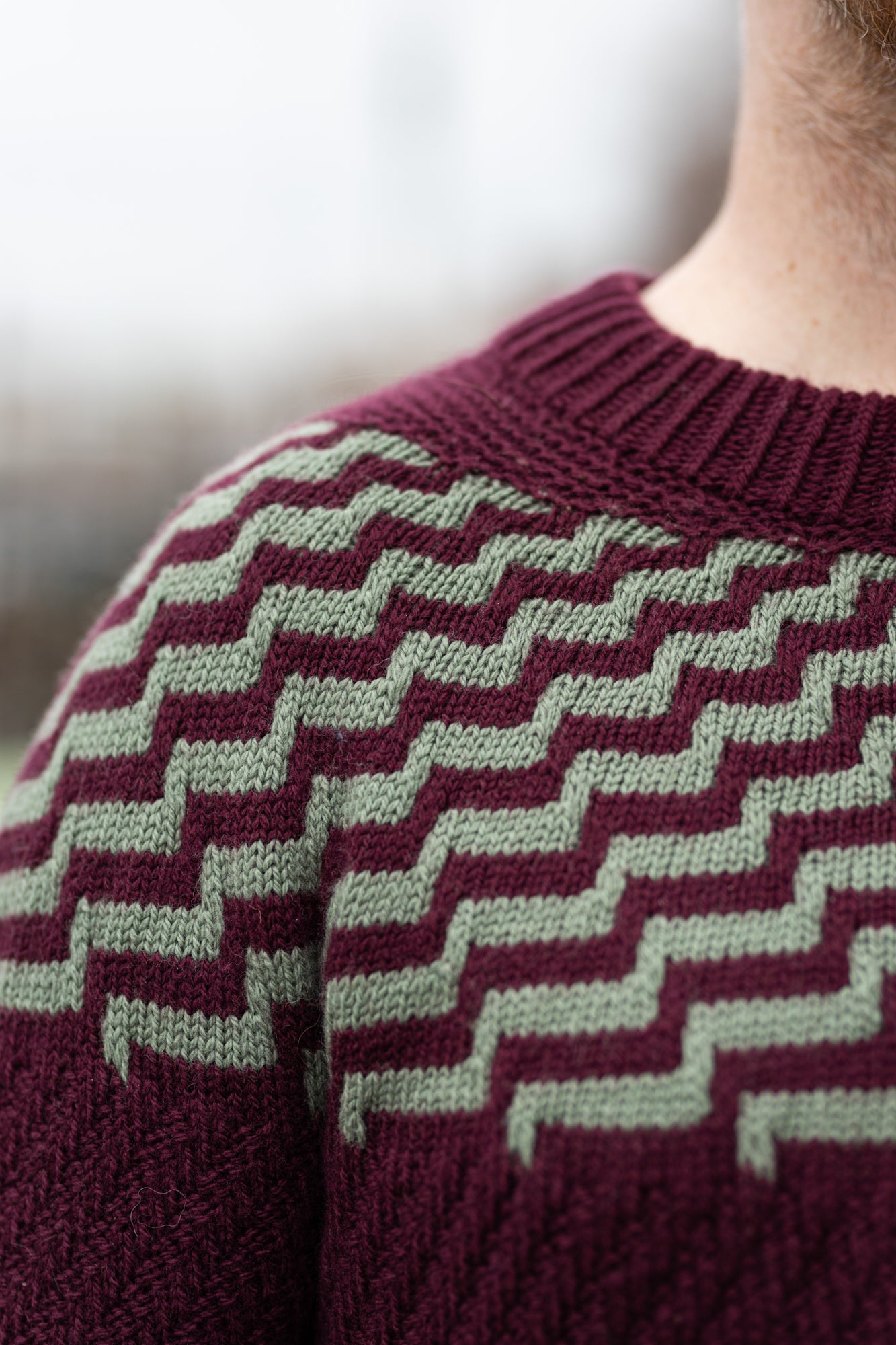 Choose your favourite two colour contrast in the delicious double knit Tandem from West Wool to knit this sensational top-down pullover. The neckline features a folded hem in twisted ribbing followed by garter stitch short rows to raise the back of the neck. Stripes and simple slip stitches form the geometric zig zag stripes across the yoke. The remaining fabric is knit in diagonal textured rib for the body and sleeves, with twisted ribbing to finish the cuffs and body for crisp clean edges. Have fun playing with colour and texture in this yoked Westknits sweater!