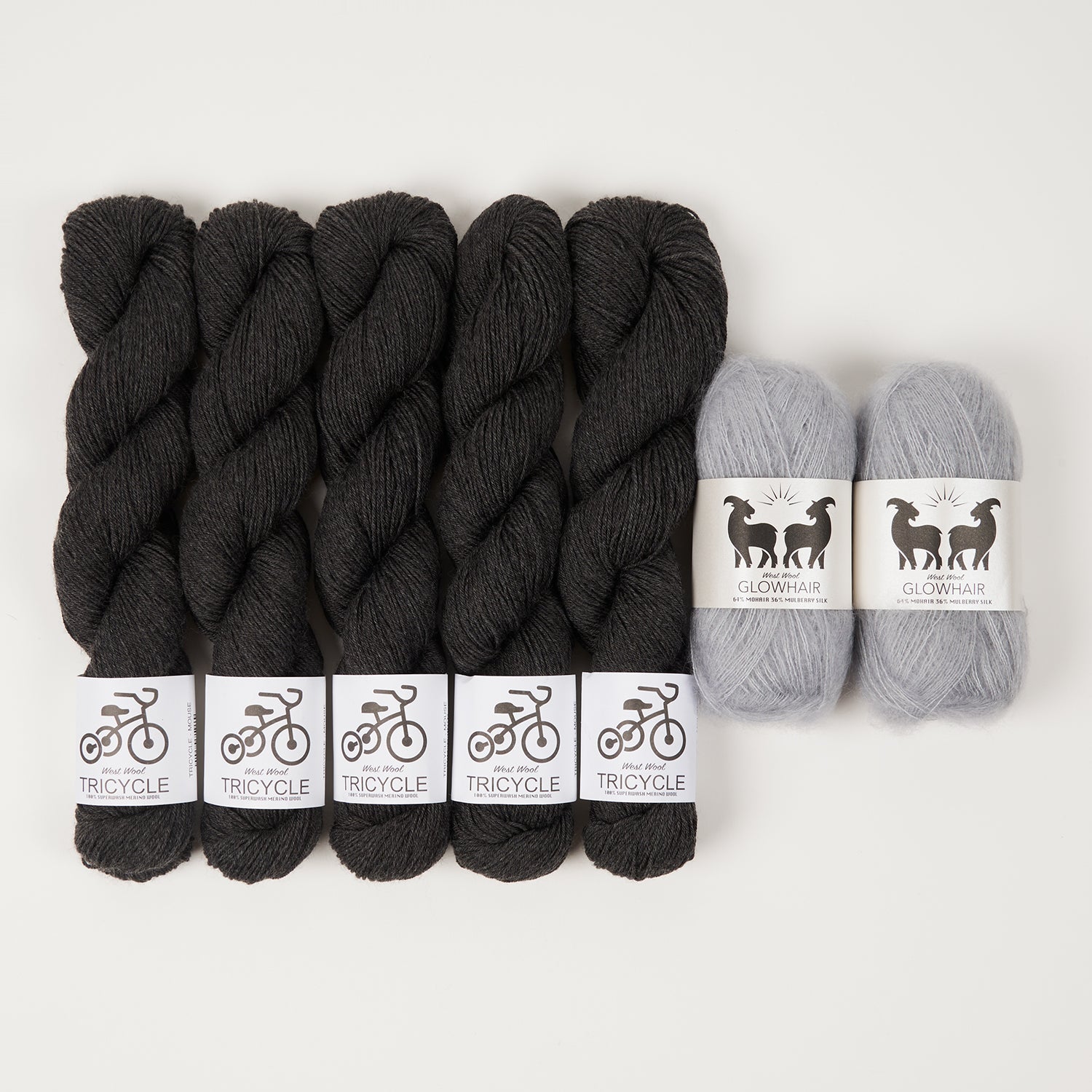 This gorgeous kit from West Wool features five skeins of fingering weight Tricycle paired with a contrasting colour of fluffy mohair lace Glowhair. If you need inspiration, it works perfectly for the Crescendo Crescent Shawl from Westknits!