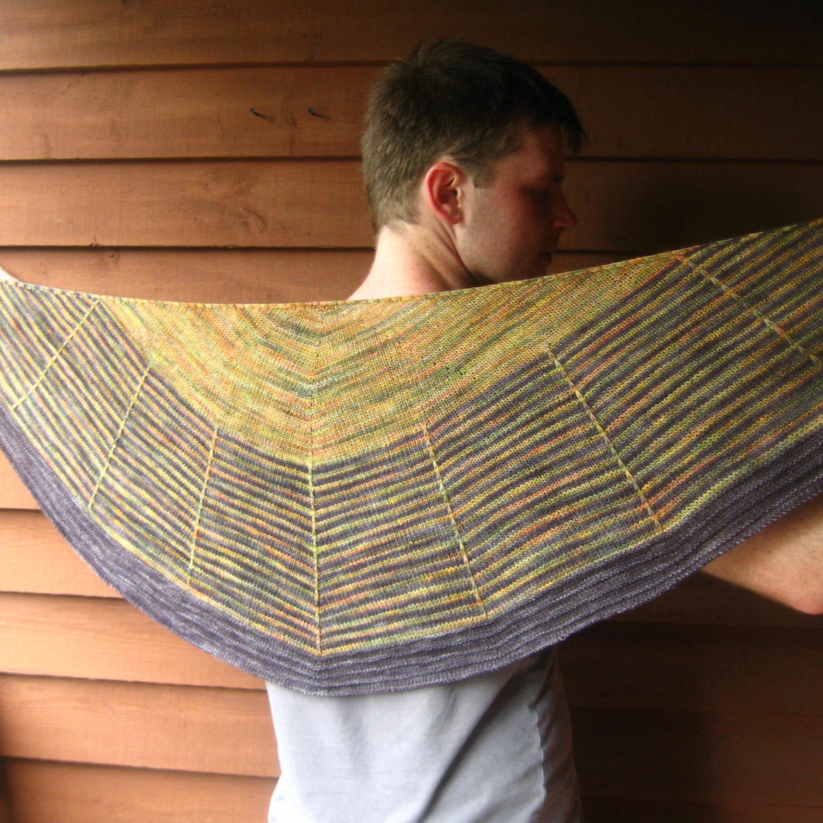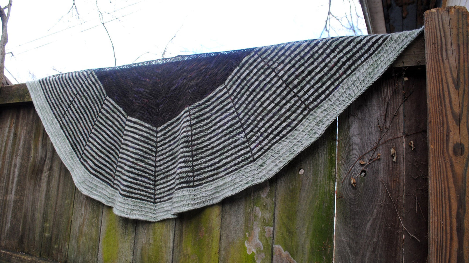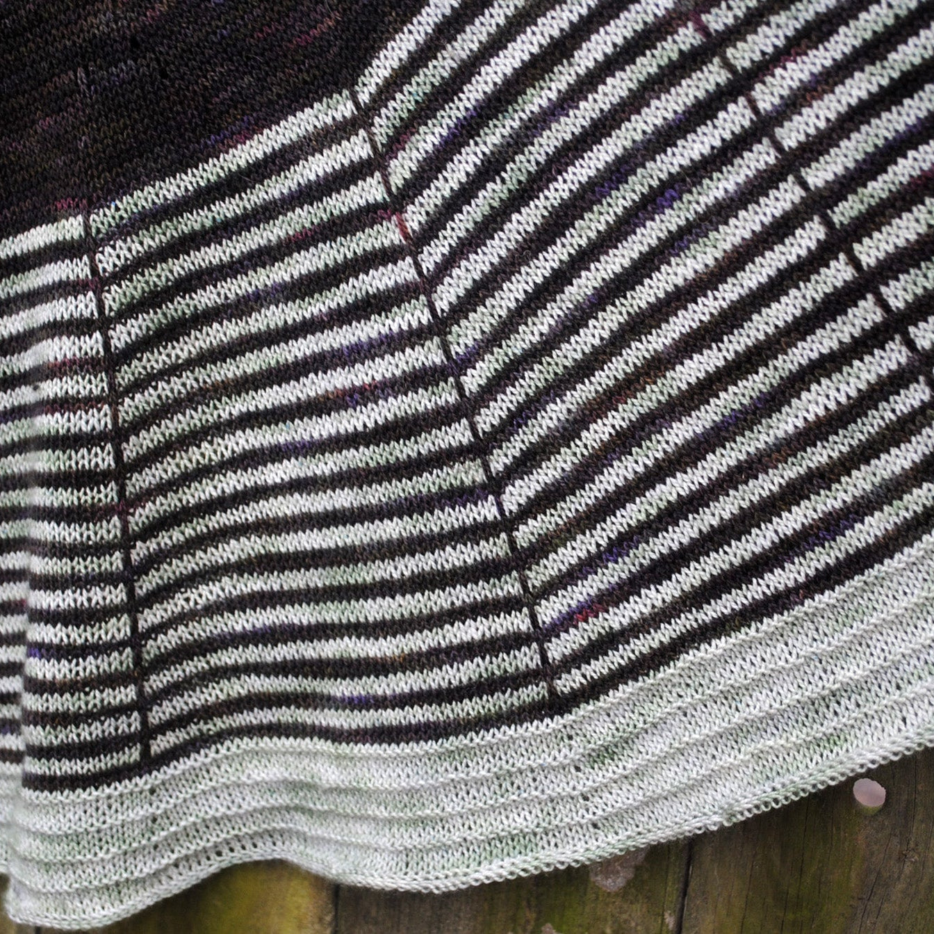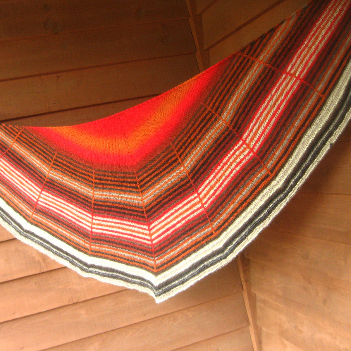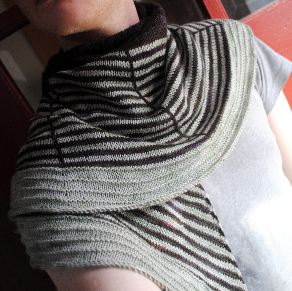 Daybreak is a semicircular shawl, featuring clear graphic stripes that echo a rising sun. The generous wingspan allows the fabric to drape comfortably around your shoulders and neck. There is plenty of room to play with colour in the three sections of this arched shawl.