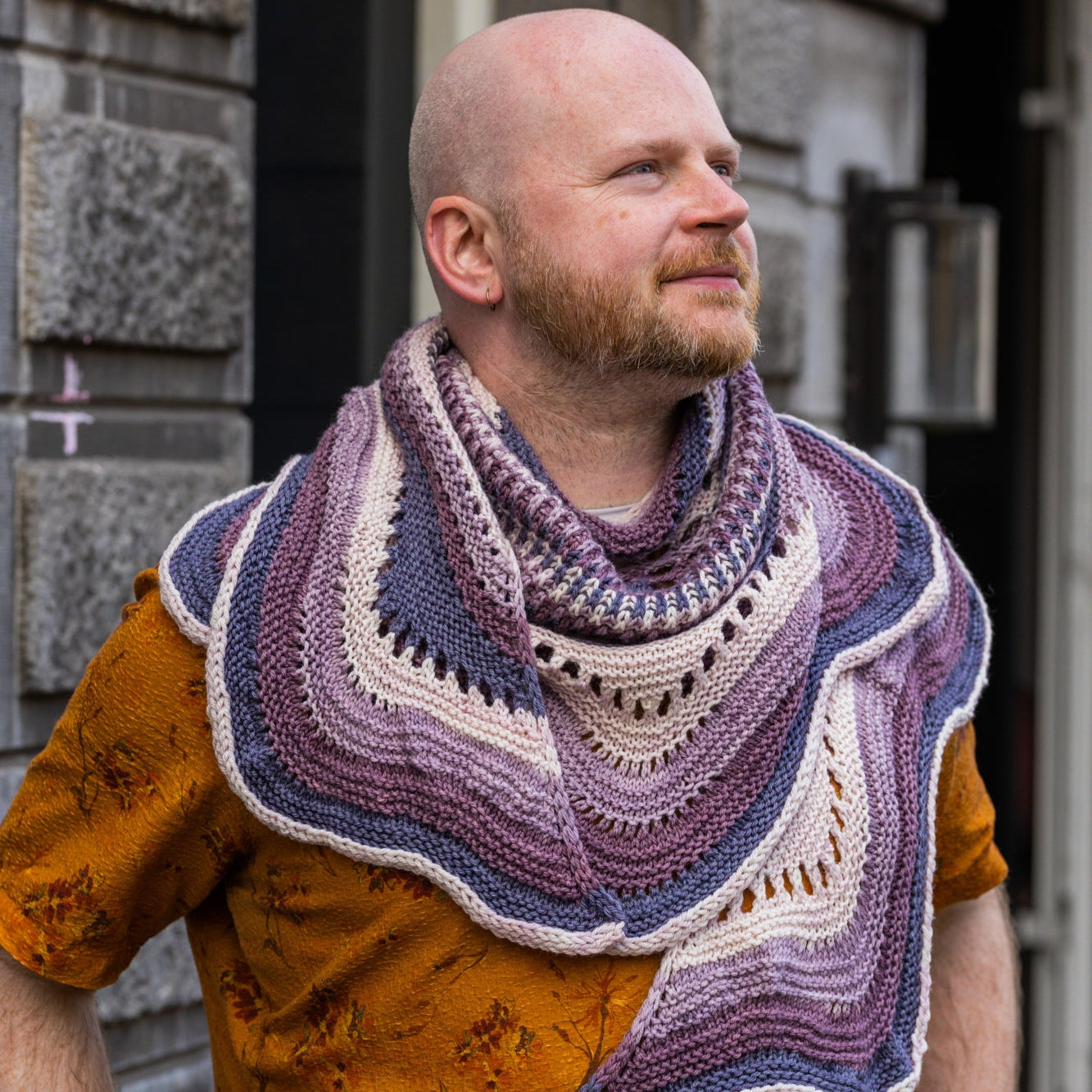 signature kitTo knit the Eyelet Journey Shawl, you can choose your favourite kit featuring four skeins of DK weight yarn in four different shades. This top-down constructions begins with stripes, eyelets, and short rows to for a smooth semi-circle shape with a generous wingspan length. Syncopated brioche stitch is followed by more short rows and a final wavy border. Have fun knitting this adventurous shawl filled with fun details and entertaining stitches!