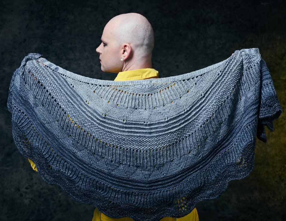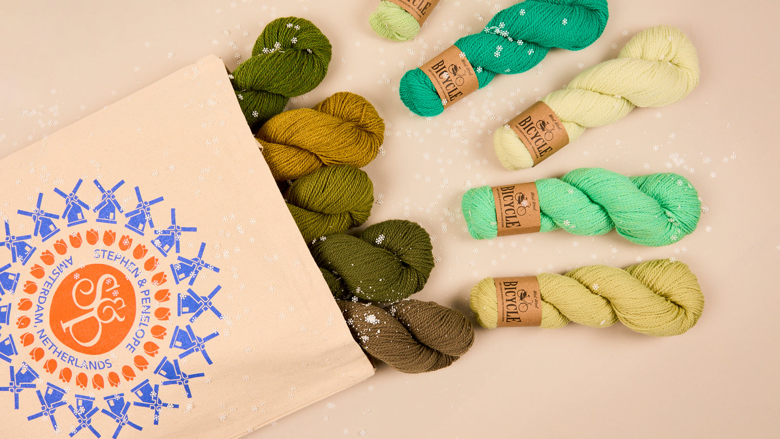 • Stack of Painting Shawl books by Stephen West. Green books piled up and stools with a knitted shawls brightly displayed in the background.