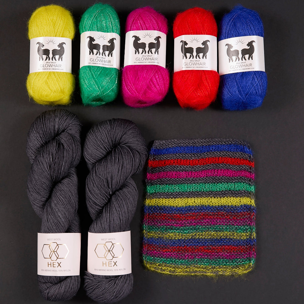 This year's Glow Along features the ethereal Mohair Mobile Shawl from Westknits! This official kit from West Wool includes two skeins of hand-dyed fingering weight Hex and five shades of fluffy lace weight Glowhair in a contrasting colour palette.