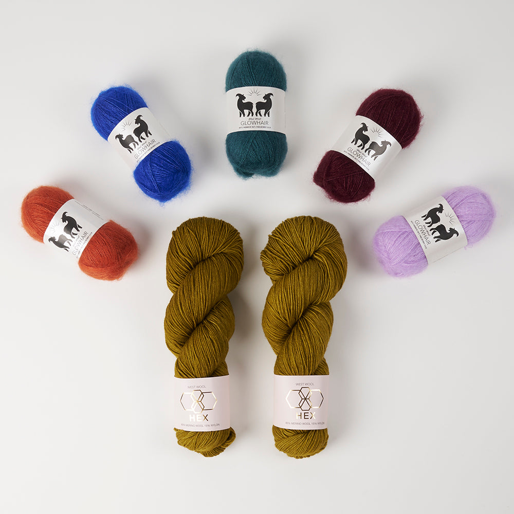 This year's Glow Along features the ethereal Mohair Mobile Shawl from Westknits! This official kit from West Wool includes two skeins of hand-dyed fingering weight Hex and five shades of fluffy lace weight Glowhair in a contrasting colour palette.
