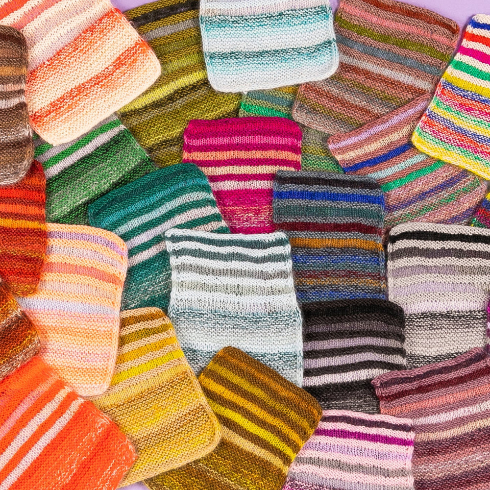 The swatches do not include this specific kit! They show the main colour held together with each lace weight mohair silk contrast colour for mohair marled moments. The swatches do not represent the finished Mohair Mobile Shawl, it's a mystery!