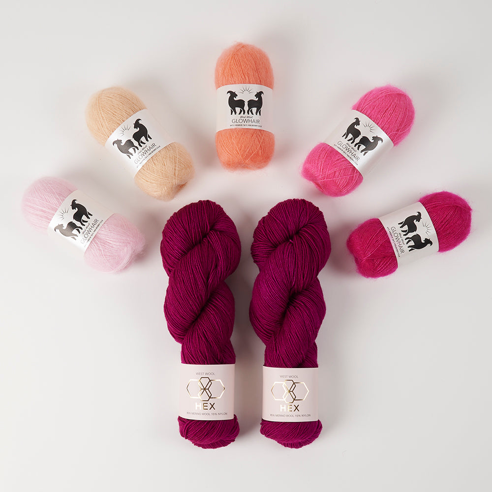 This year's Glow Along features the ethereal Mohair Mobile Shawl from Westknits! This official kit from West Wool includes two skeins of hand-dyed fingering weight Hex and five shades of fluffy lace weight Glowhair in a contrasting colour palette.