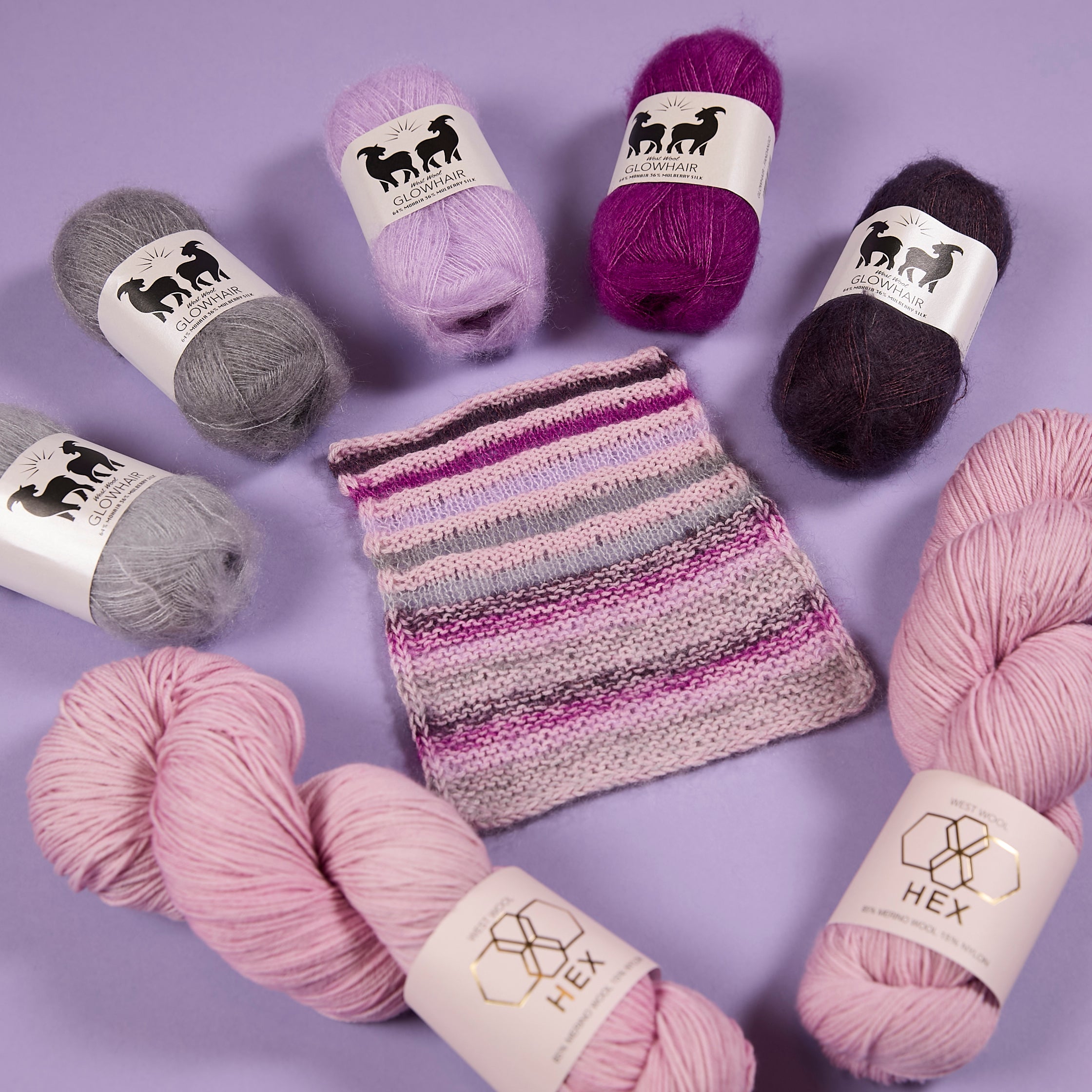 This year's Glow Along features the ethereal Mohair Mobile Shawl from Westknits! This official kit from West Wool includes two skeins of hand-dyed fingering weight Hex and five shades of fluffy lace weight Glowhair in a contrasting colour palette.