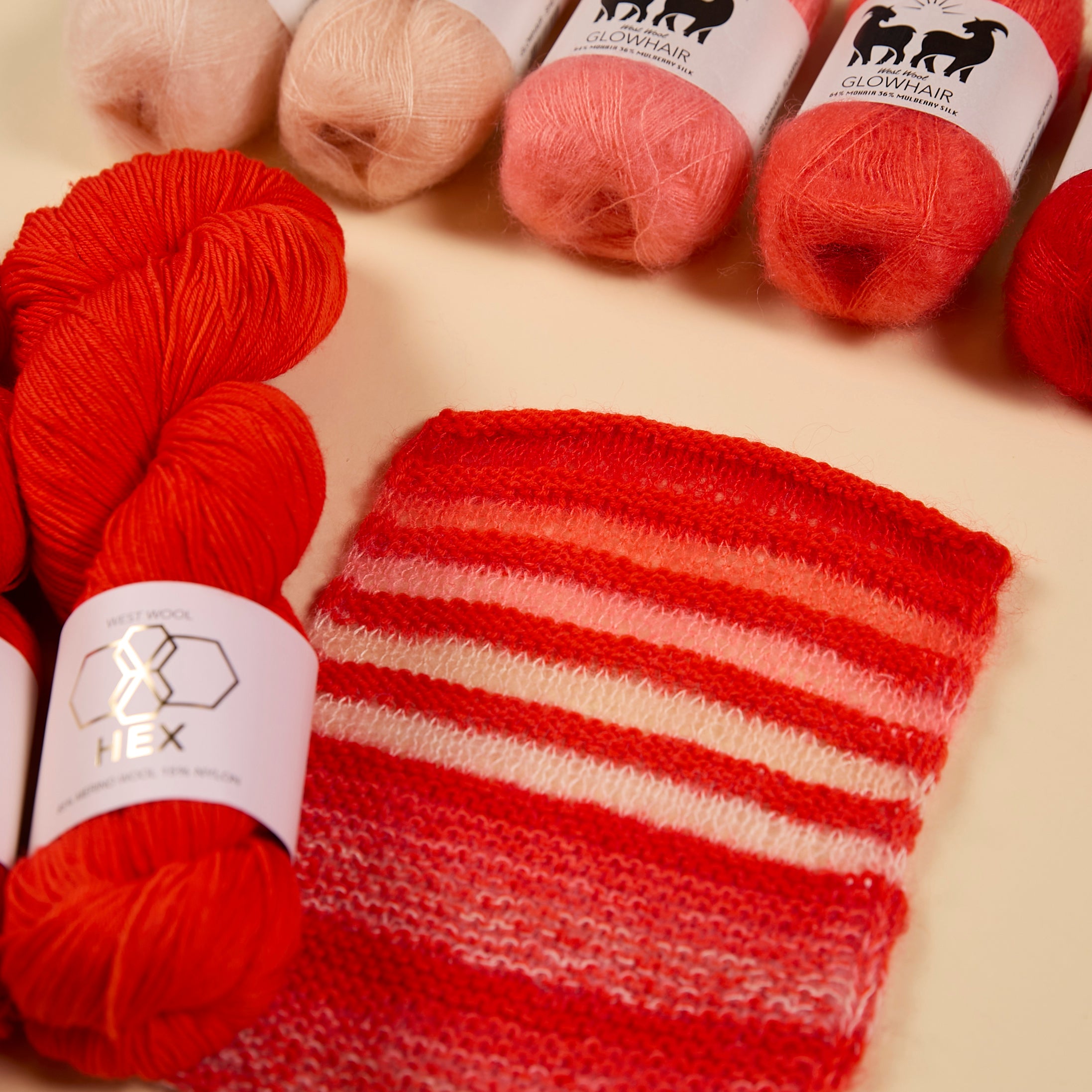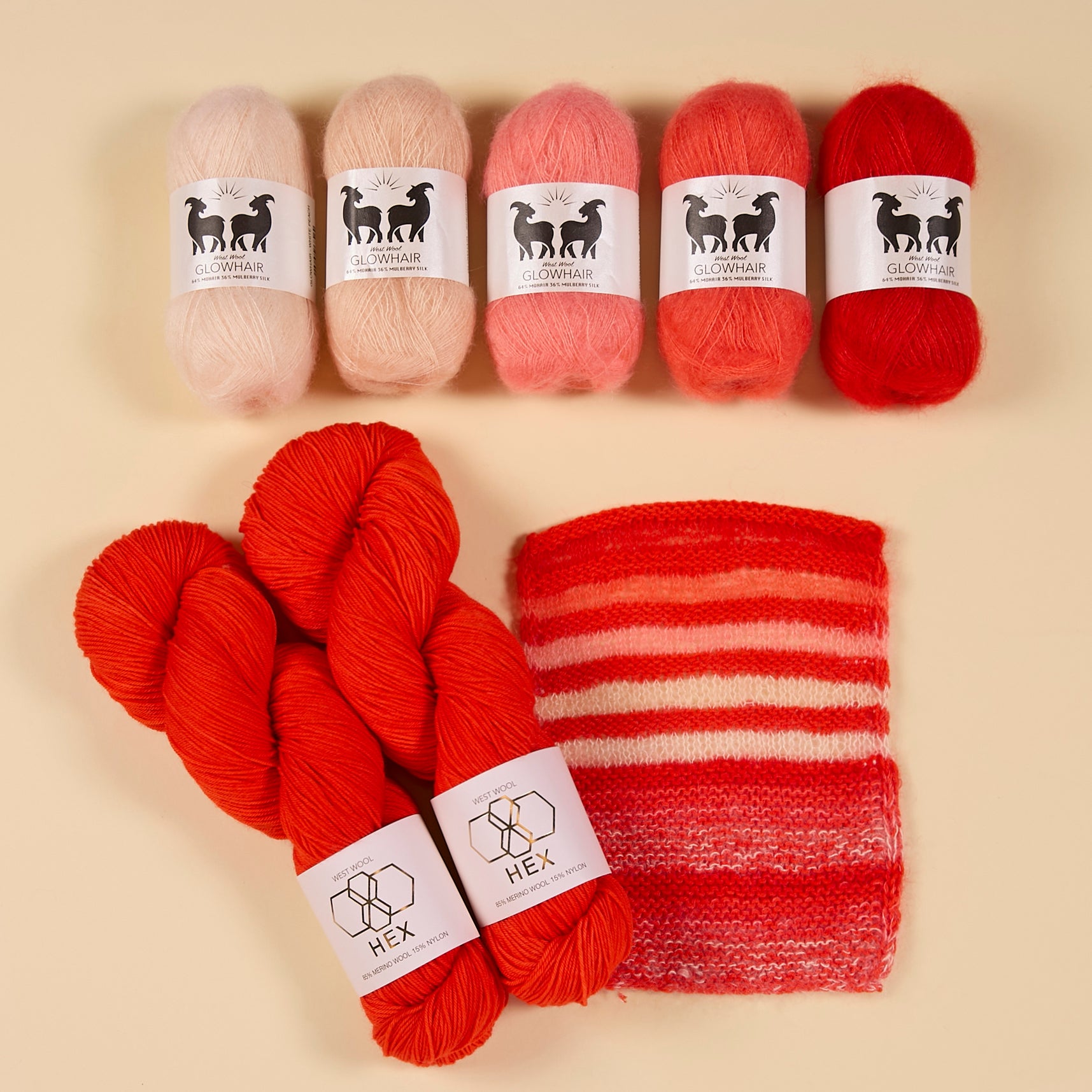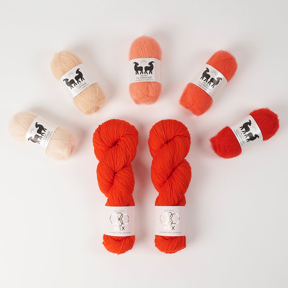 This year's Glow Along features the ethereal Mohair Mobile Shawl from Westknits! This official kit from West Wool includes two skeins of hand-dyed fingering weight Hex and five shades of fluffy lace weight Glowhair in a contrasting colour palette.