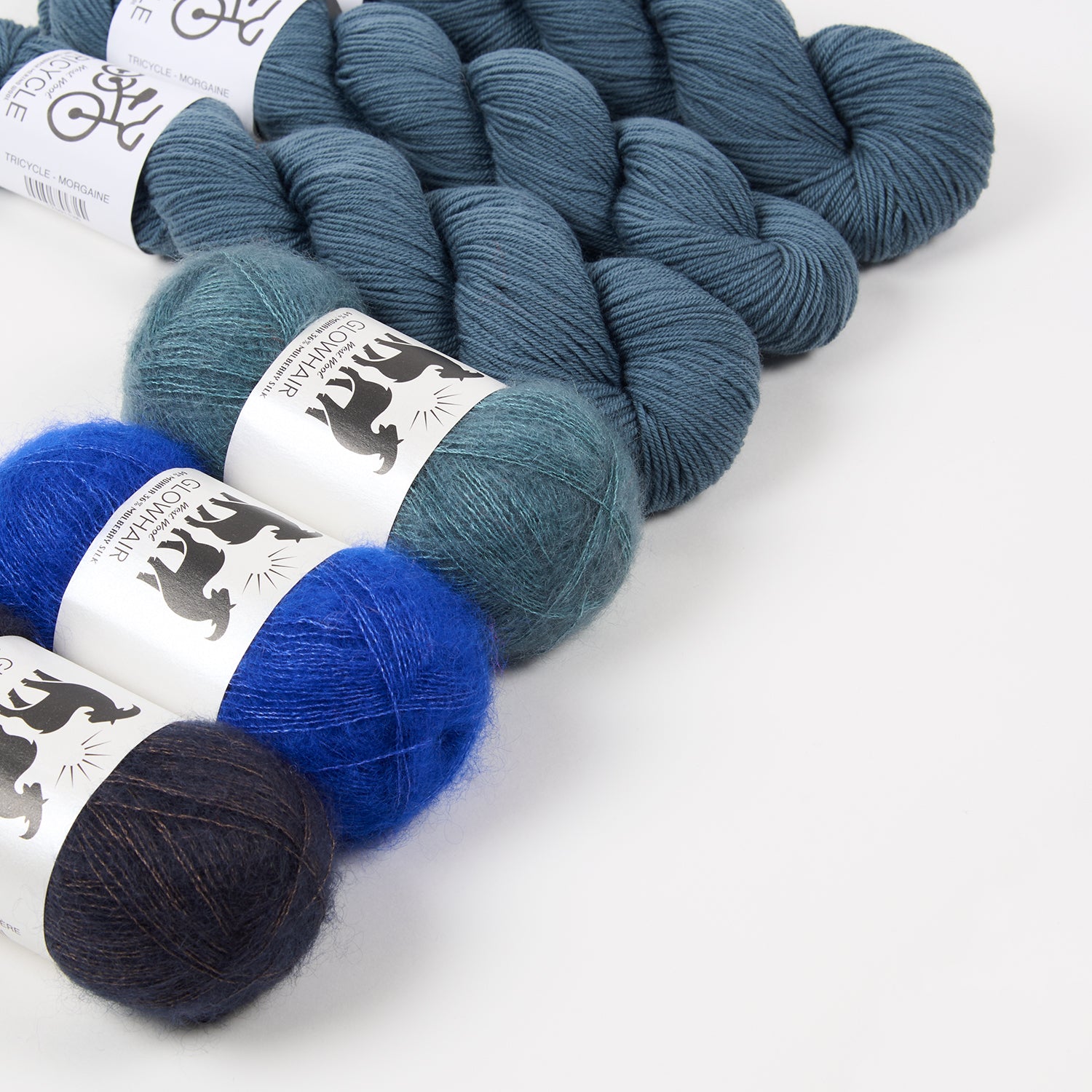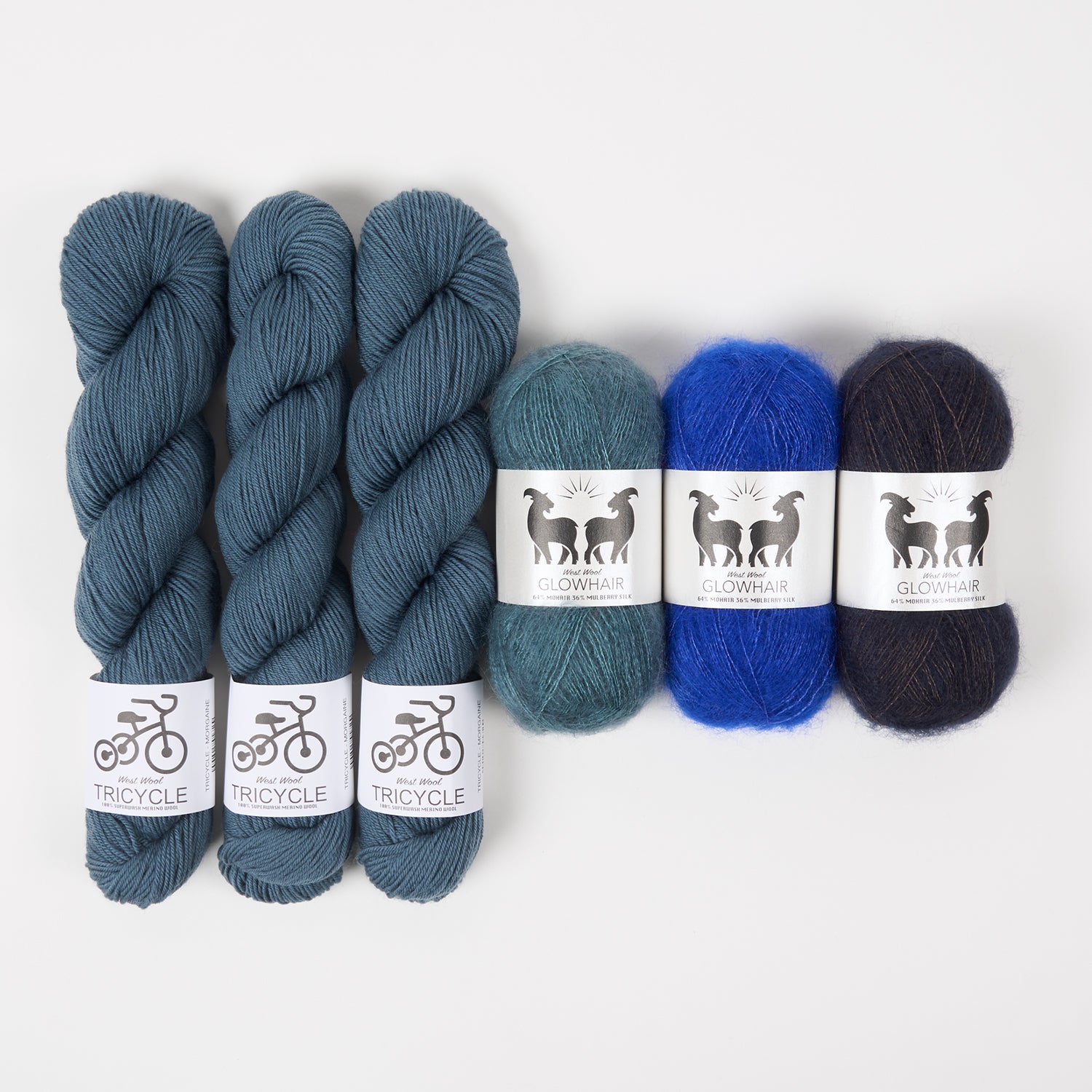 This stunning kit from West Wool contains three skeins of fingering weight yarn in a single colour and three balls of mohair in three contrasting colours. If you need inspiration, it can be used to knit the gorgeous Glowhair Frost Cowl from Westknits.