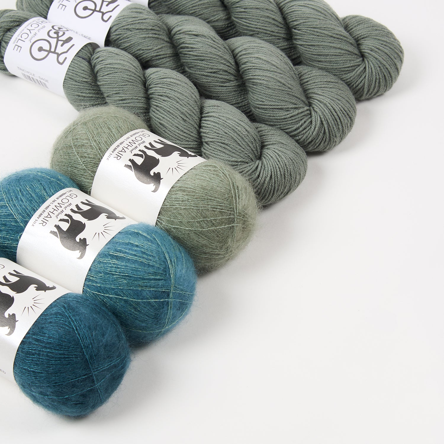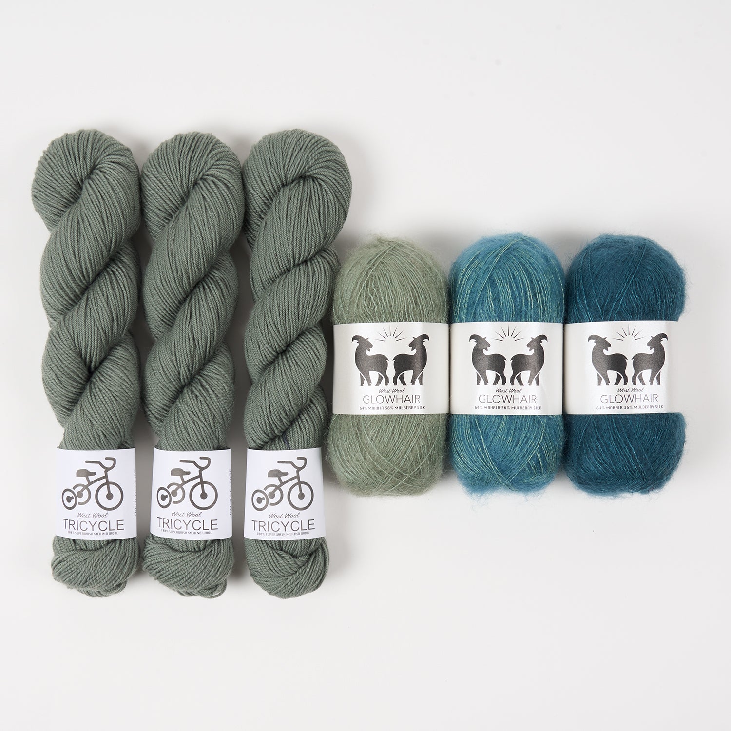 This stunning kit from West Wool contains three skeins of fingering weight yarn in a single colour and three balls of mohair in three contrasting colours. If you need inspiration, it can be used to knit the gorgeous Glowhair Frost Cowl from Westknits.