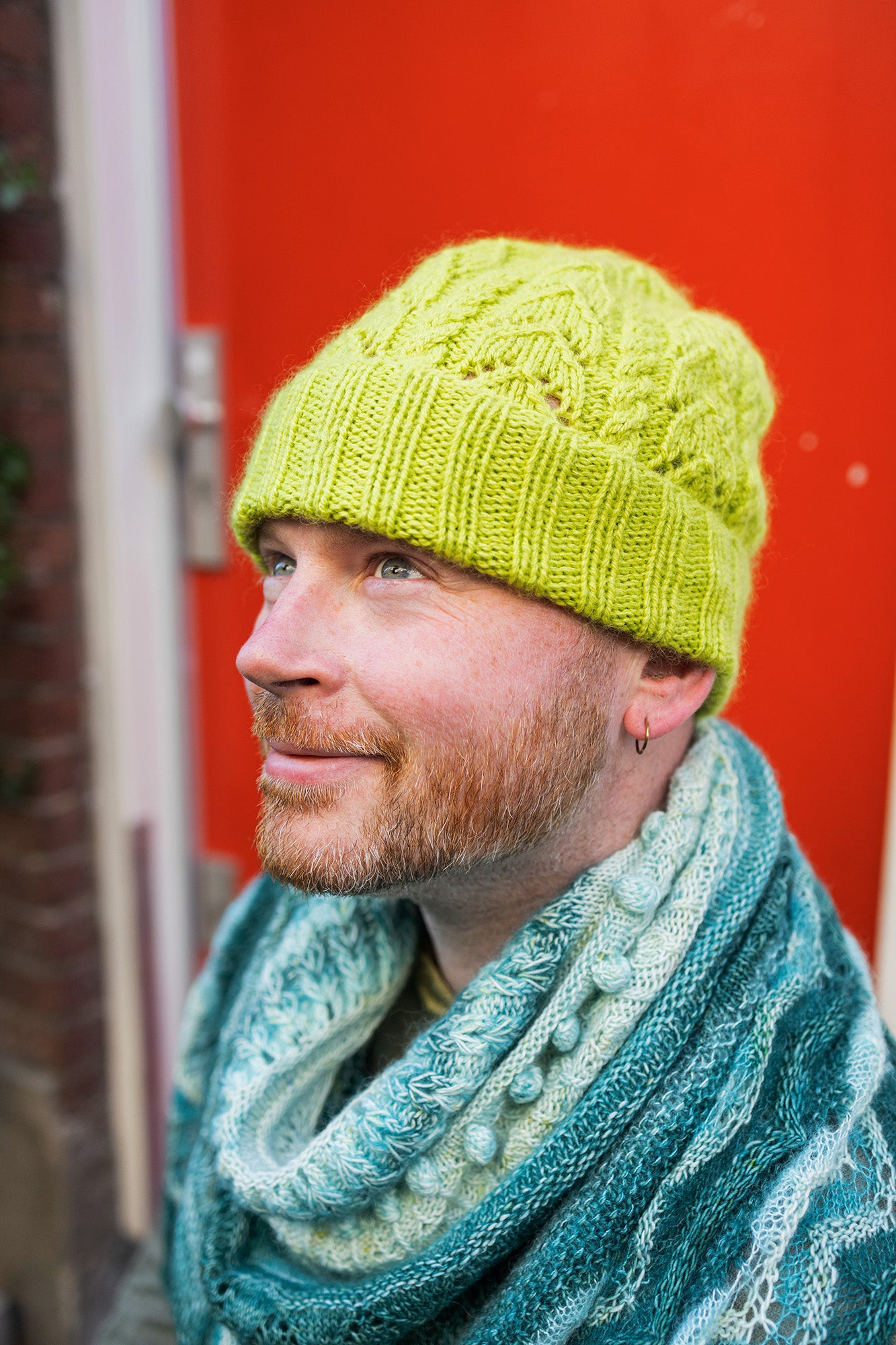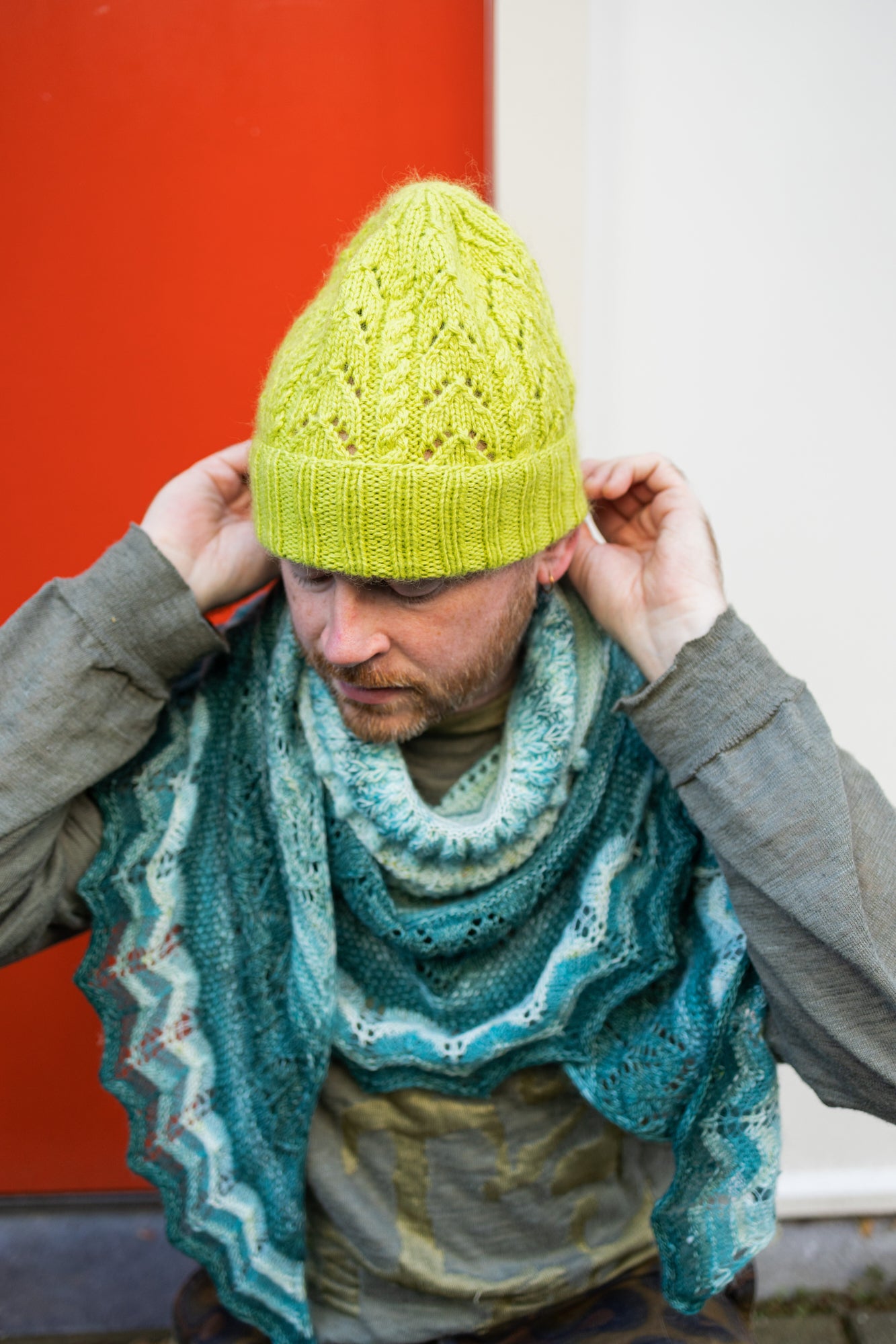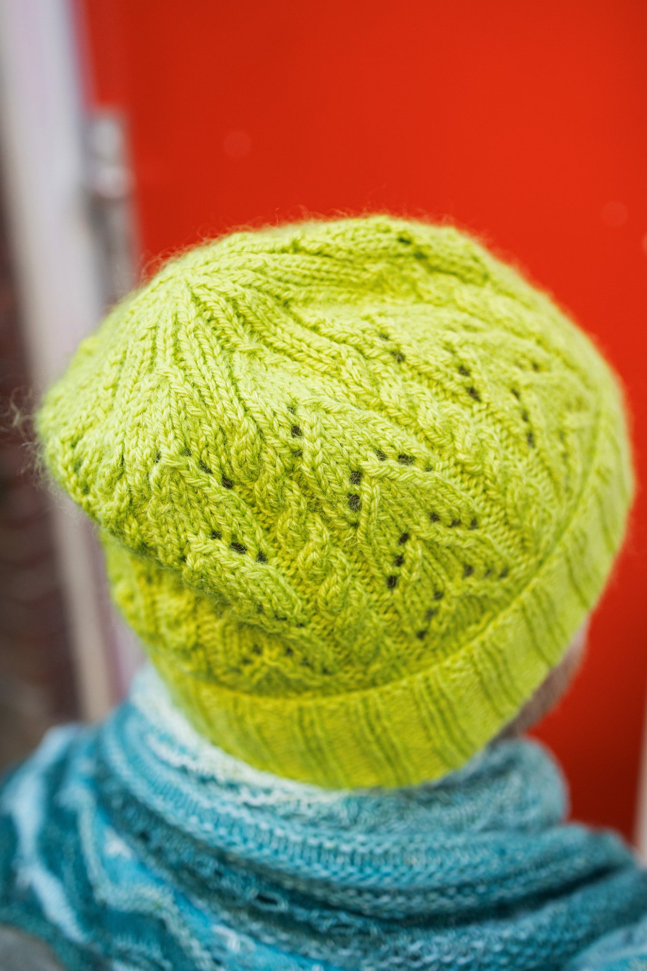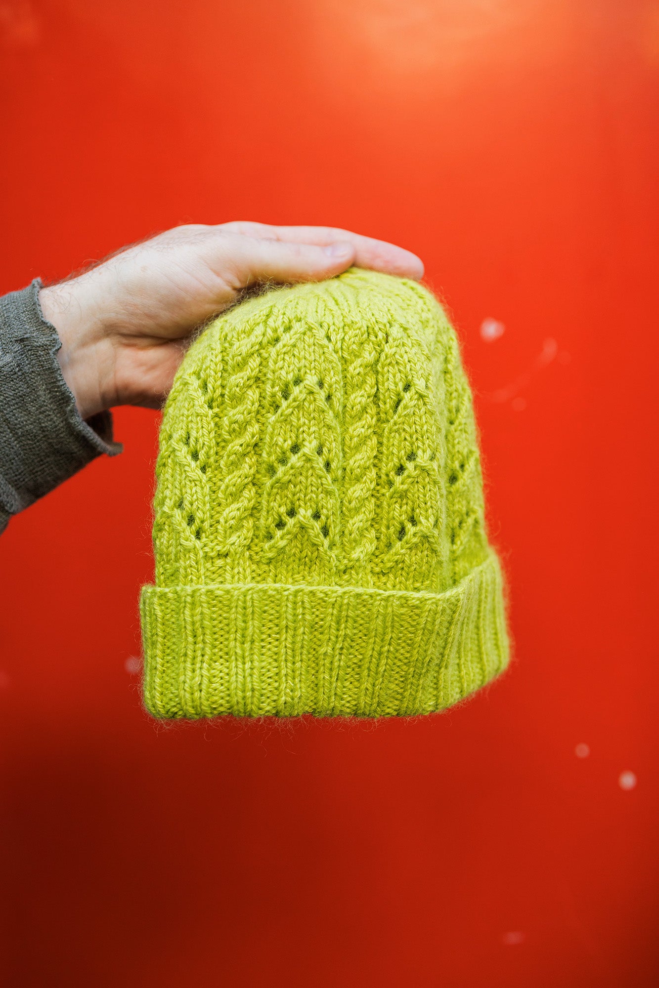 Choose your favourite stunning solid colour of West Wool's deliciously squishy DK Tandem and hold it together with a matching strand of lace weight Glowhair. The mohair adds a frothy halo to the hat while you work the beautiful lace and cable pattern. This quick-to-knit hat makes a perfect gift!