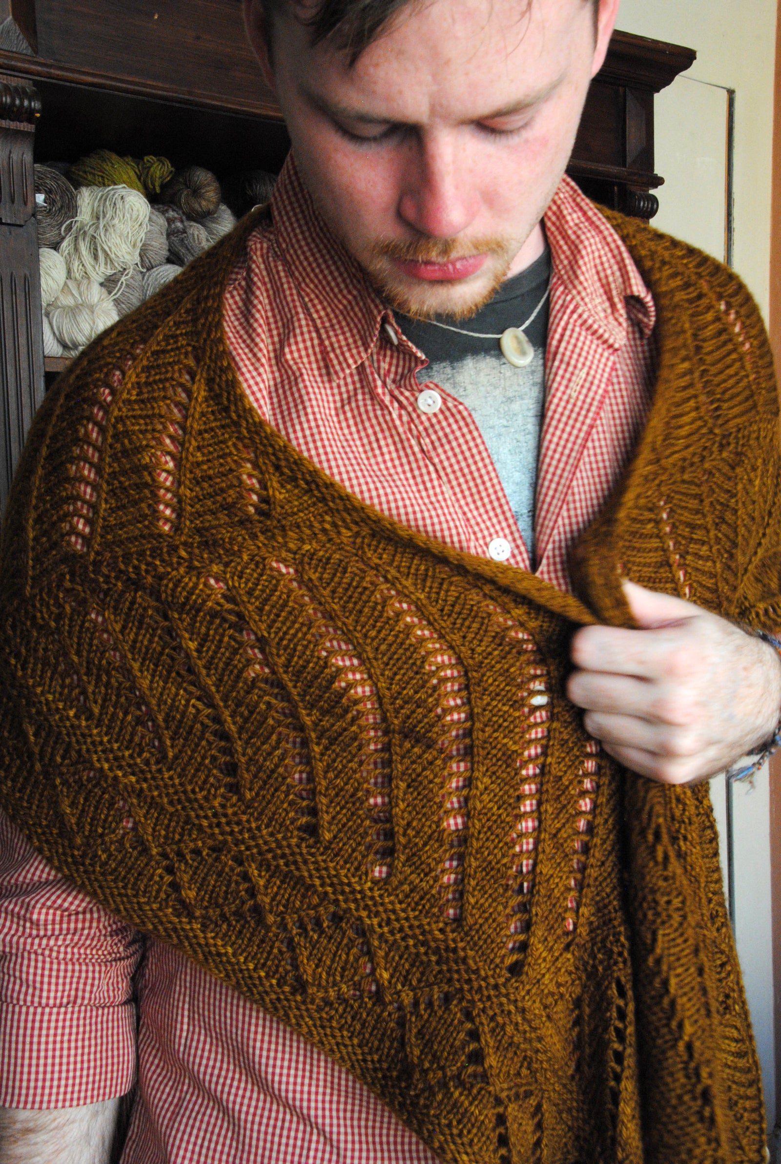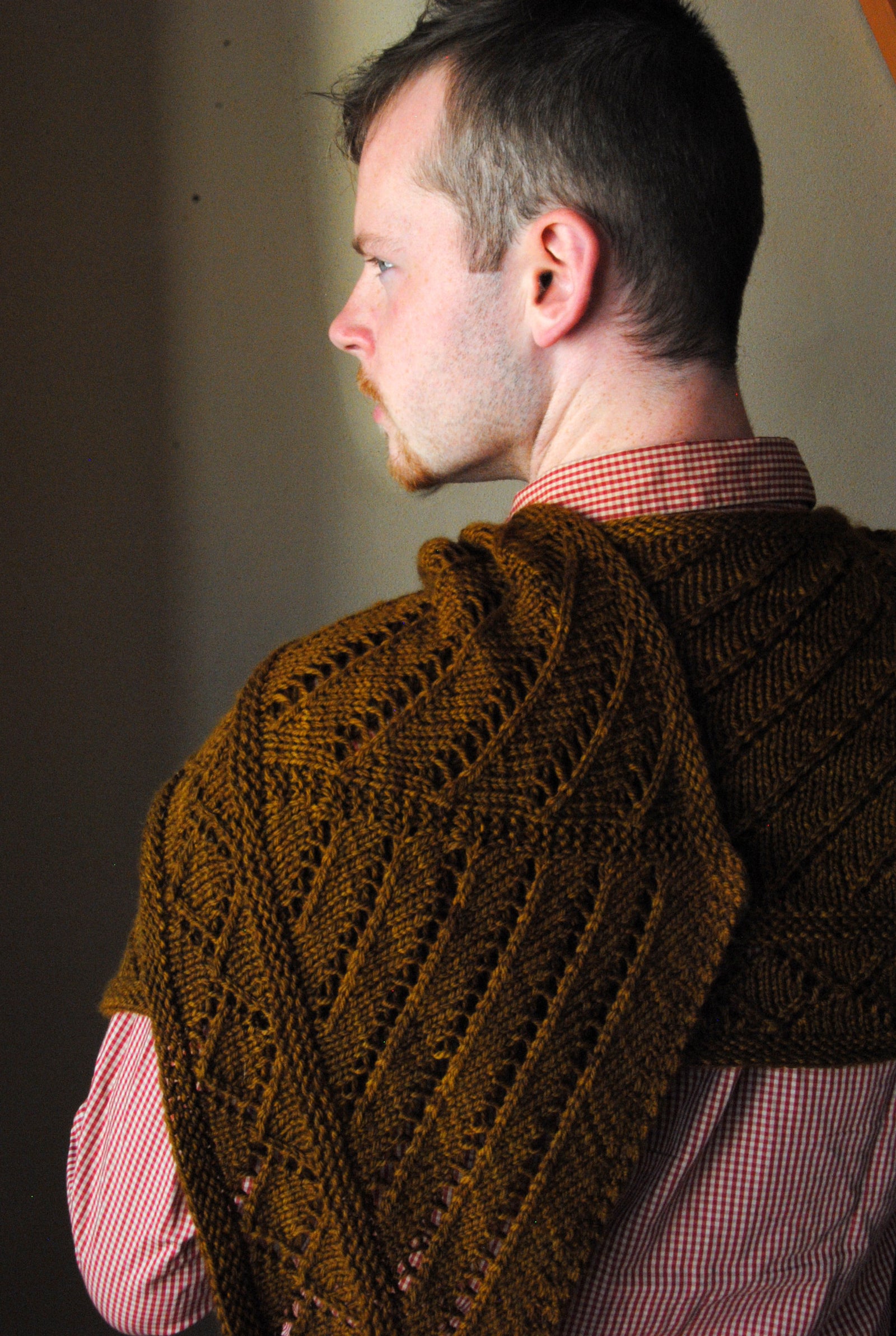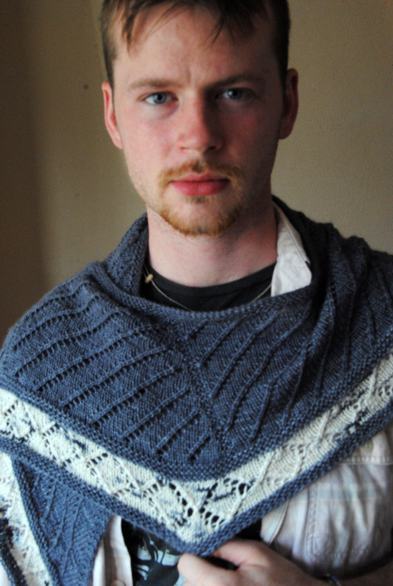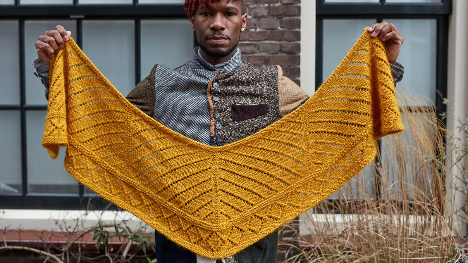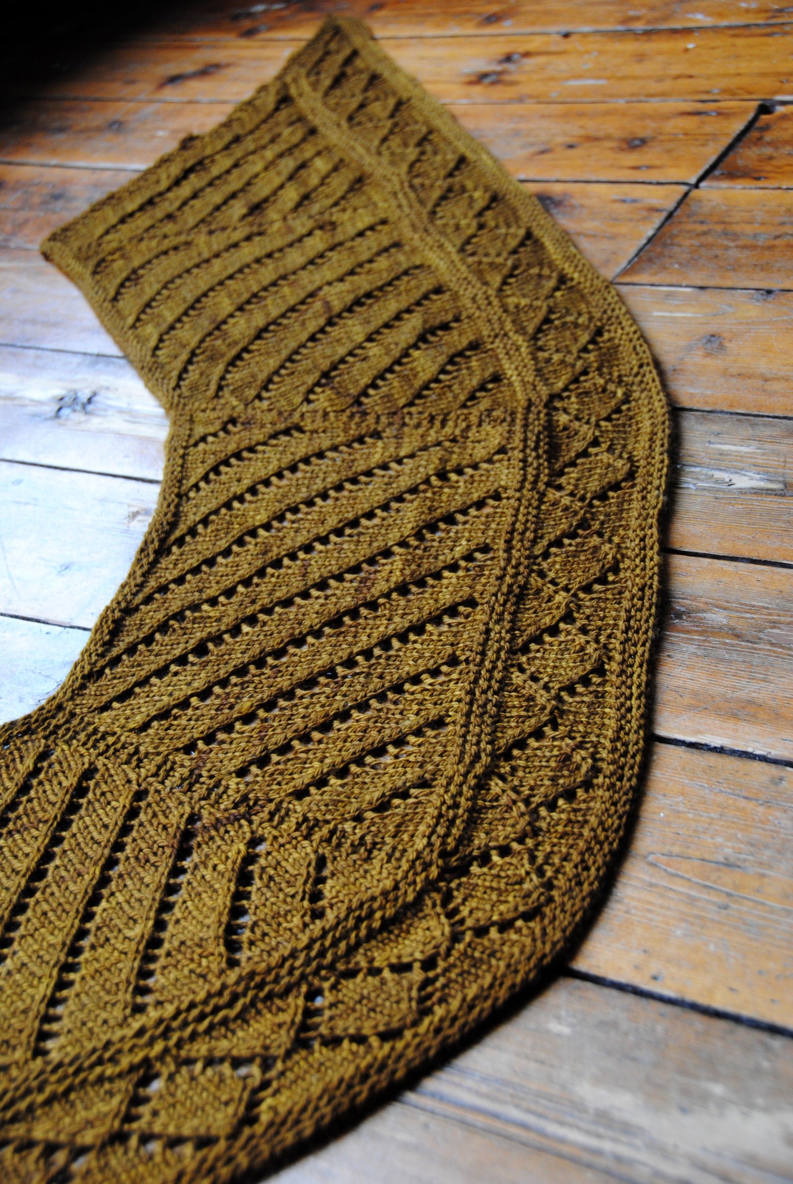 Gyllis is an architectural lace scarf knit length-wise. Choose a colour of DK weight yarn held together with lace weight mohair silk for a fluffy fabric or knit a simple version with one strand of DK weight wool. Simple lace is worked in sections divided by different locations of increases that give the fabric a dramatic arched shape. The resulting shawl drapes effortlessly around the shoulders.