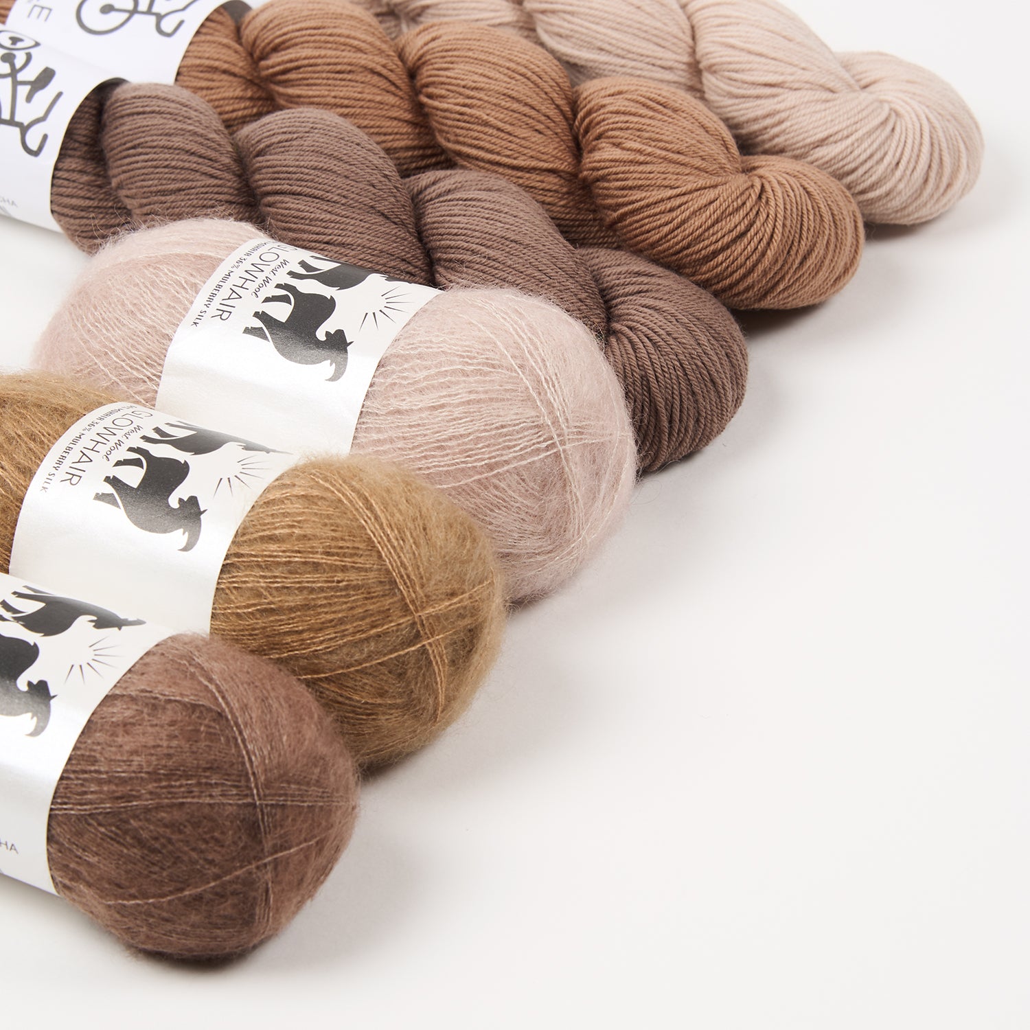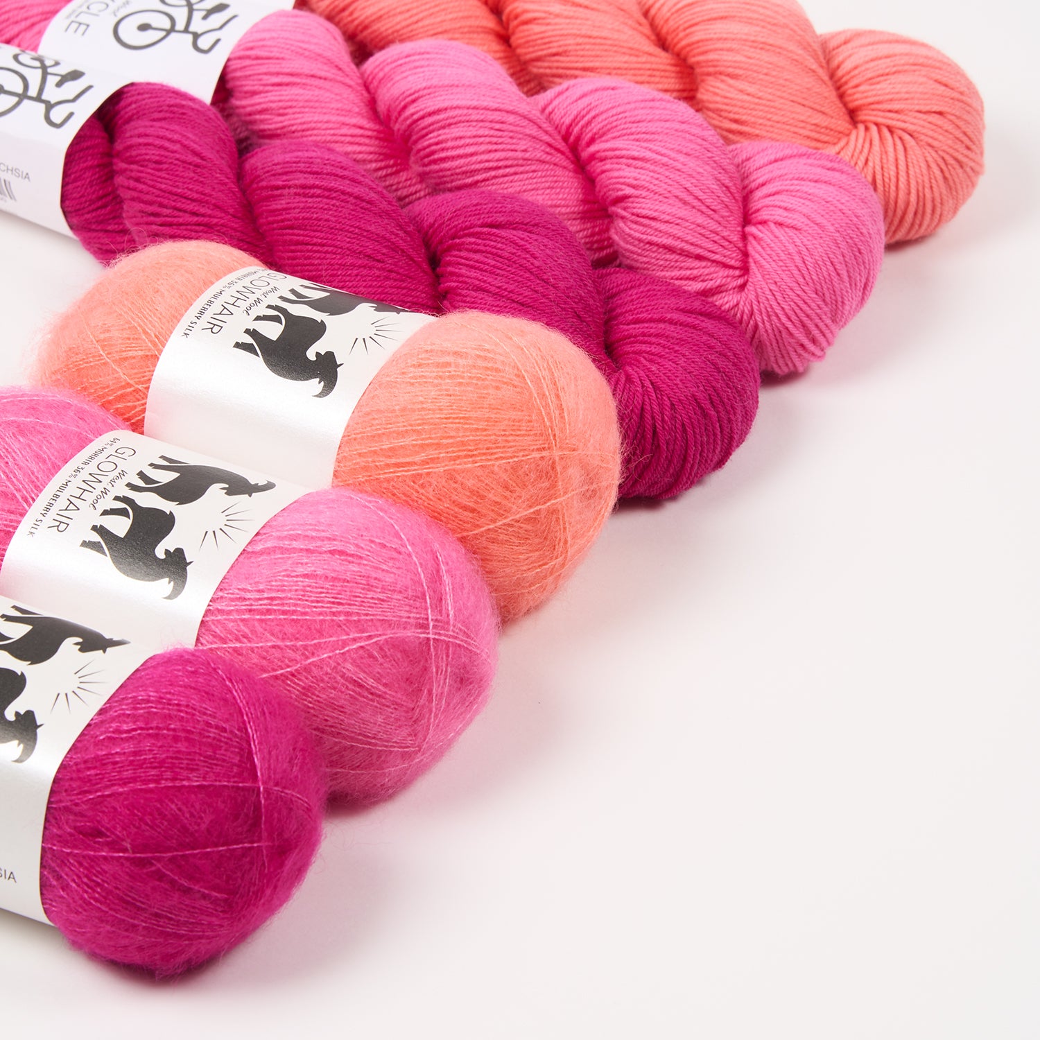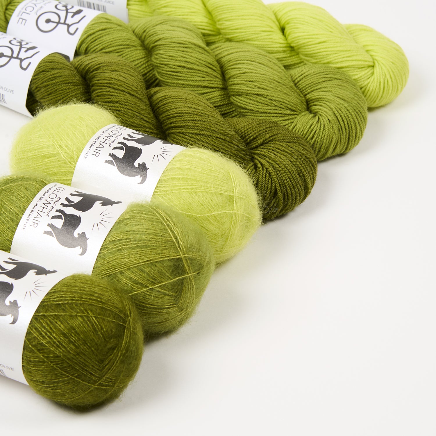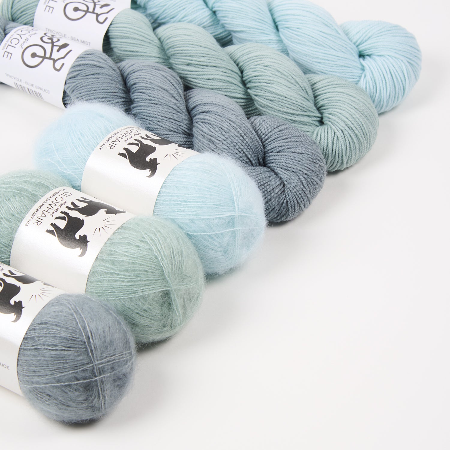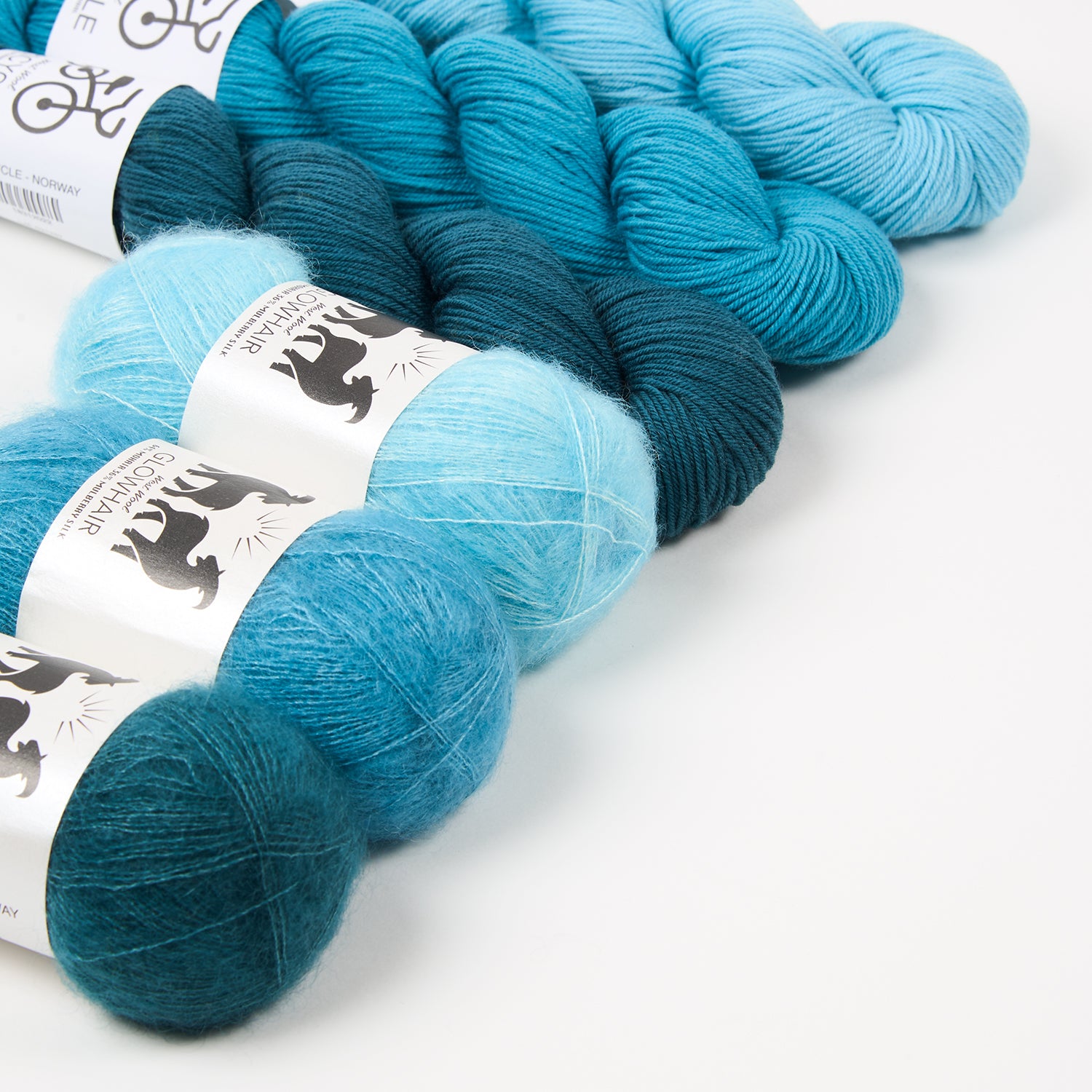 These stunning kits from West Wool were assembled especially for the Glowhair Frost Shawl!