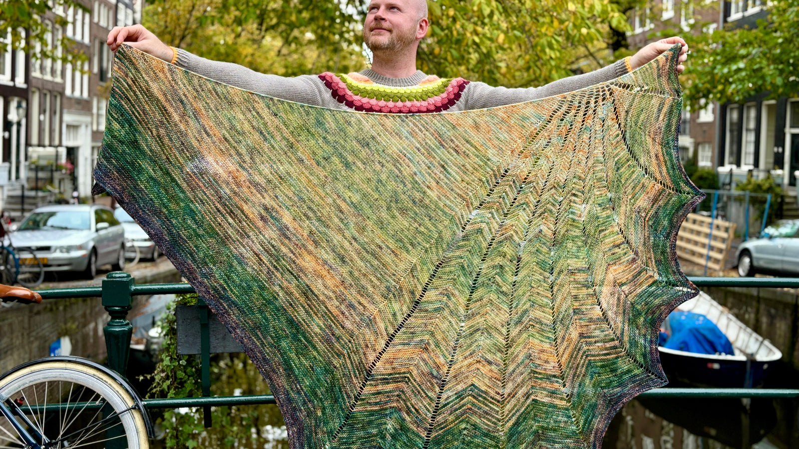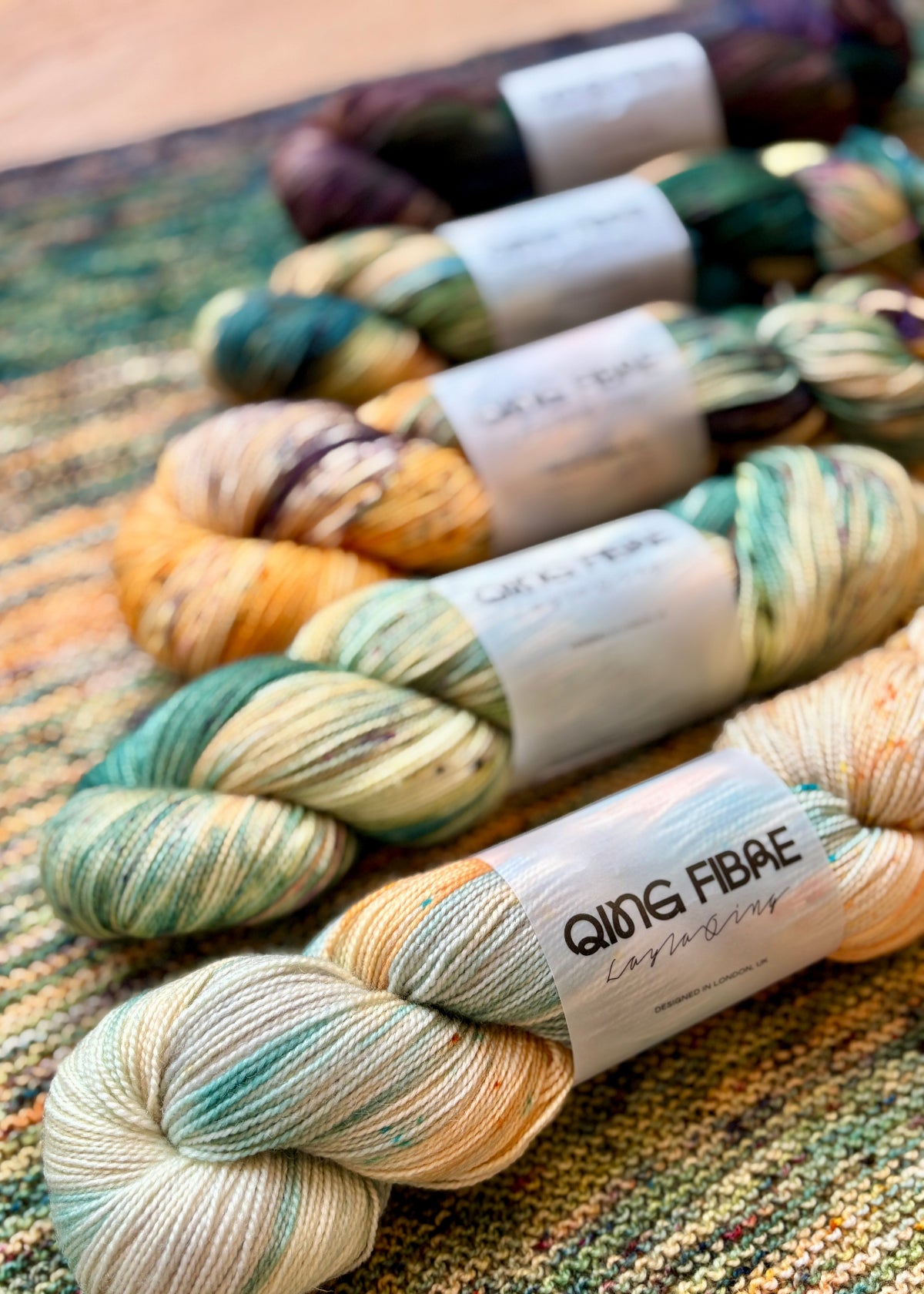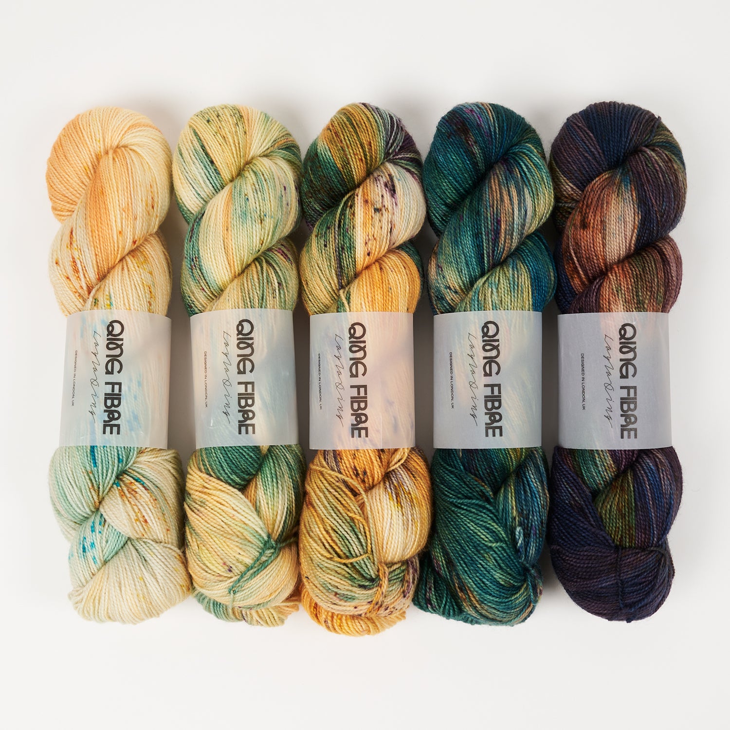 This stunning kit from Qing Fibre has five skeins of fingering weight yarn. This fantastic fade was custom dyed in collaboration with Stephen West.