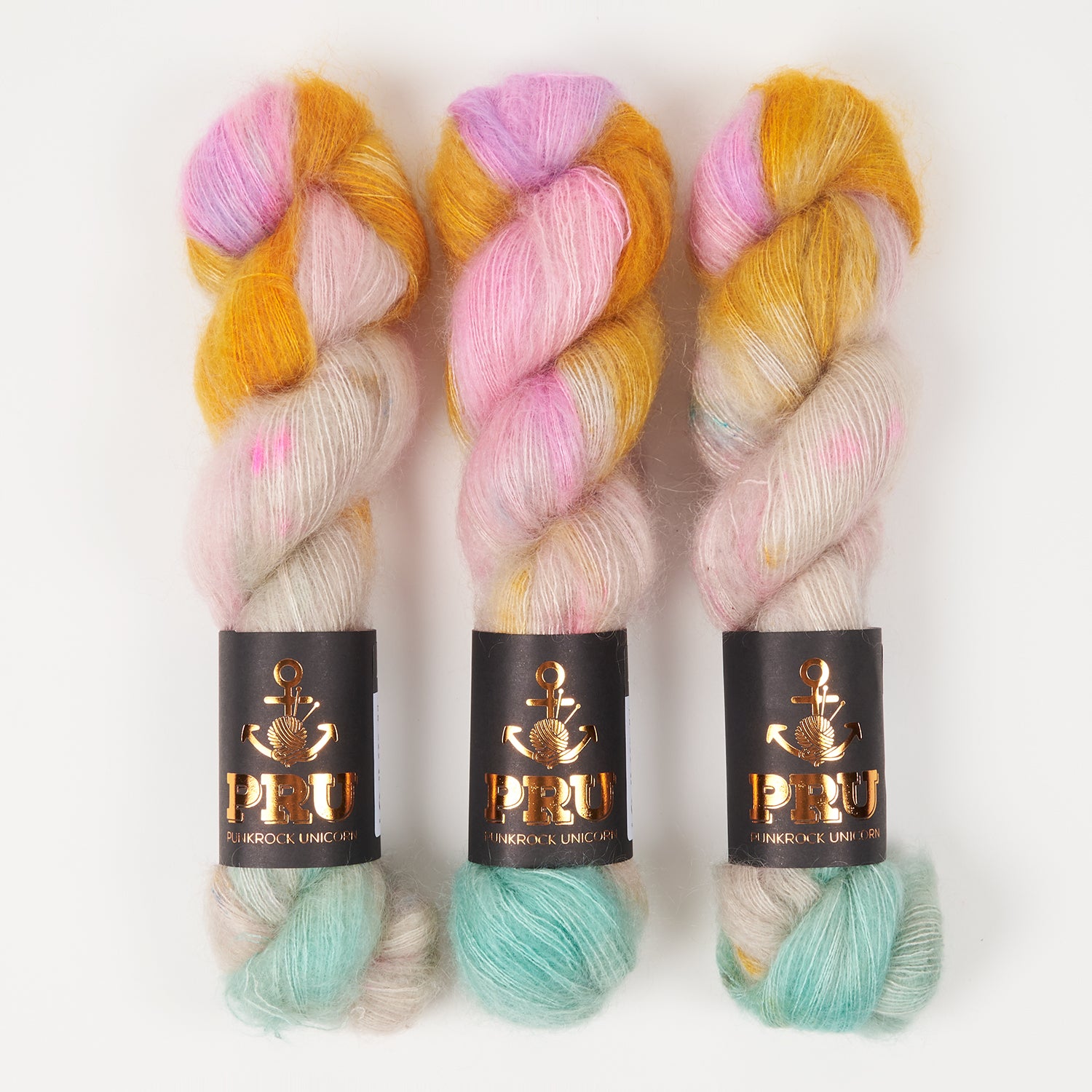 This lace weight yarn from Punk Rock Unicorn is ideal for dream like floating fabrics or adding a fun textural pop when held together with other yarns.