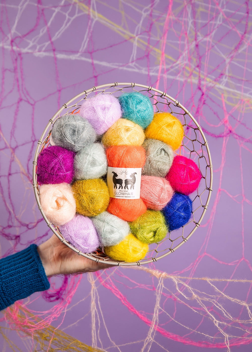 Looking for the perfect palette? Take a look at our Mohair Mix yarn bundles chosen especially for the Glow Along. If you already have a main colour or you are building your own kit, get 2 skeins (100g each) of fingering weight wool in the same colour for your main colour. Then, add one of our Mohair Mix yarn bundles for your 5 mohair contrast colours!