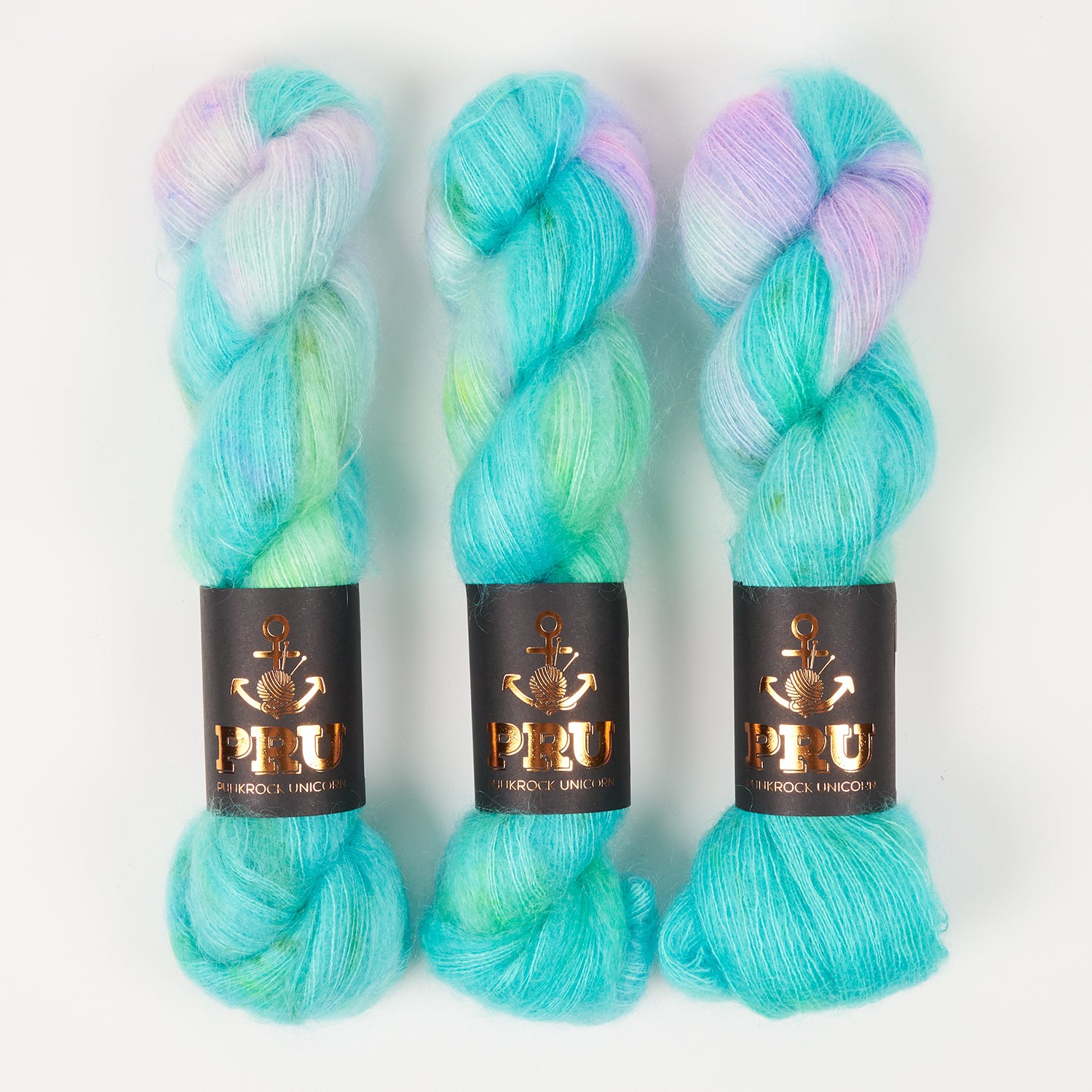This lace weight yarn from Punk Rock Unicorn is ideal for dream like floating fabrics or adding a fun textural pop when held together with other yarns.