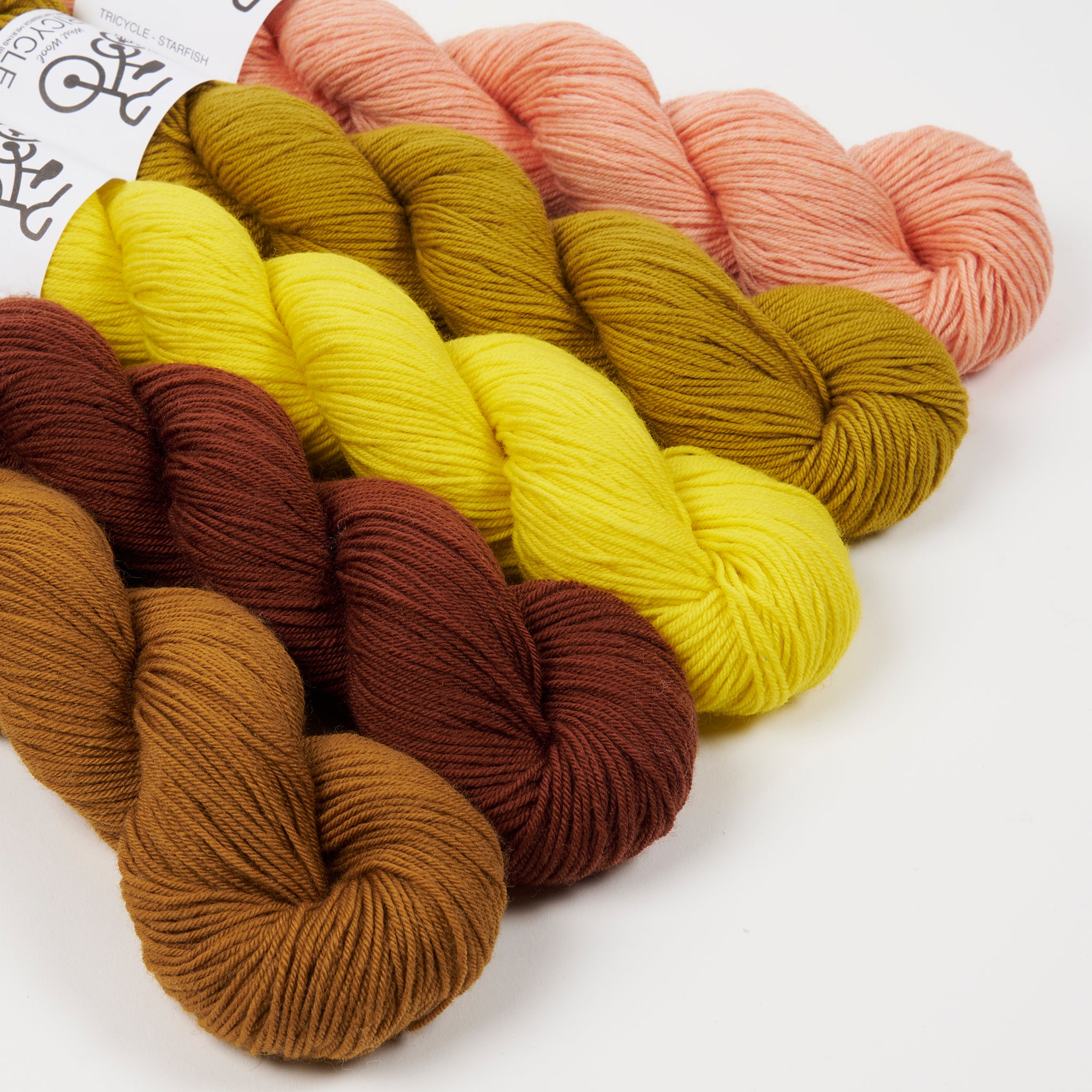 This beautiful West Wool kit contains ten skeins of fingering weight yarn. If you're looking for project inspiration, it will work up perfectly for any of these Westknits shawls.