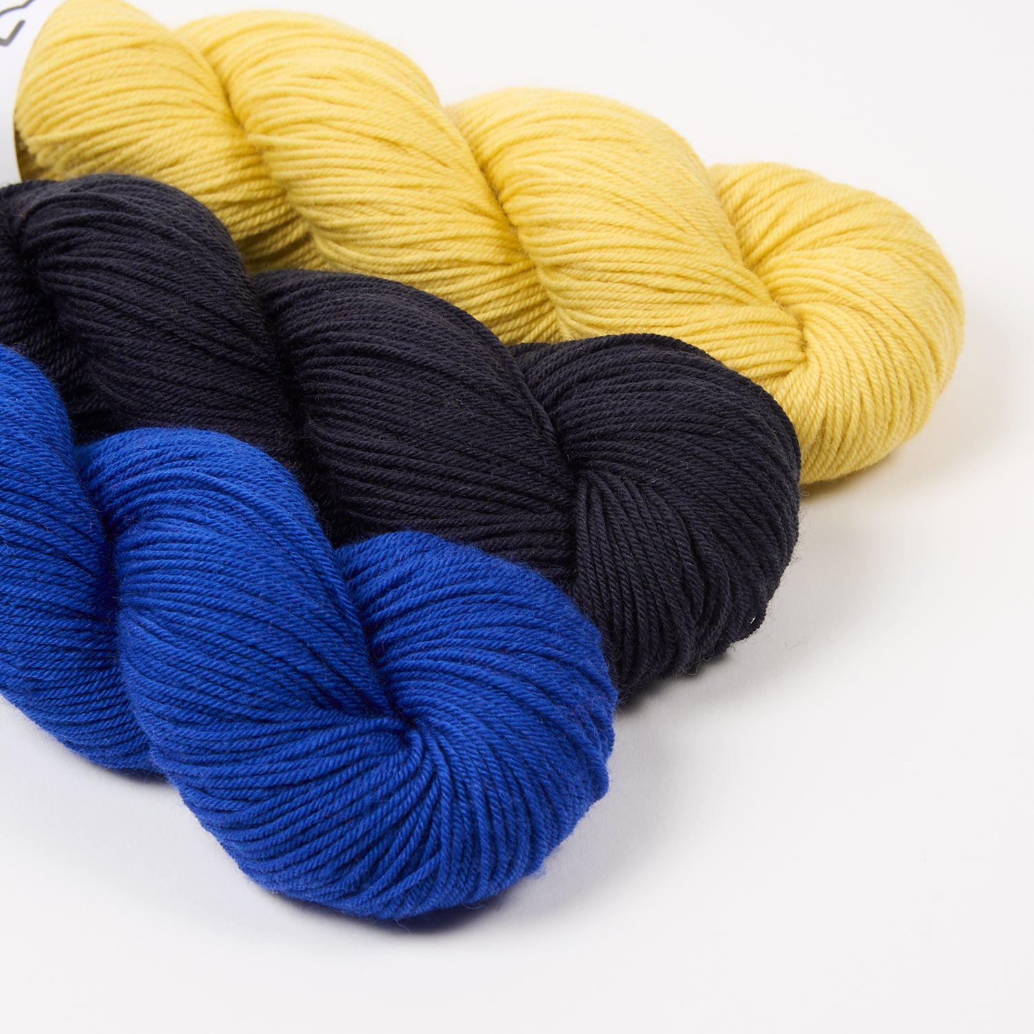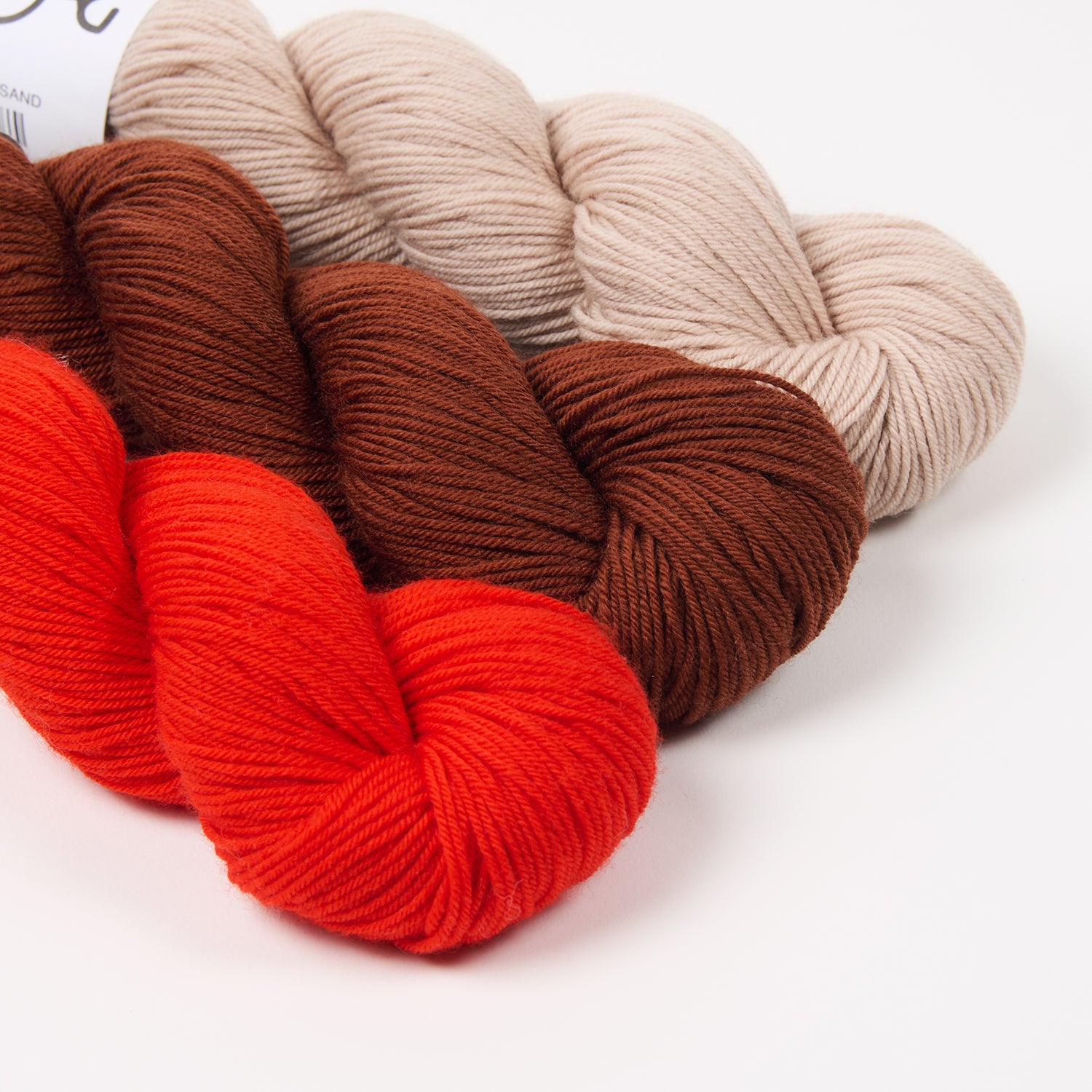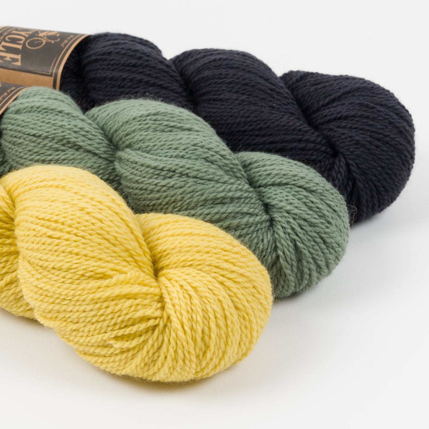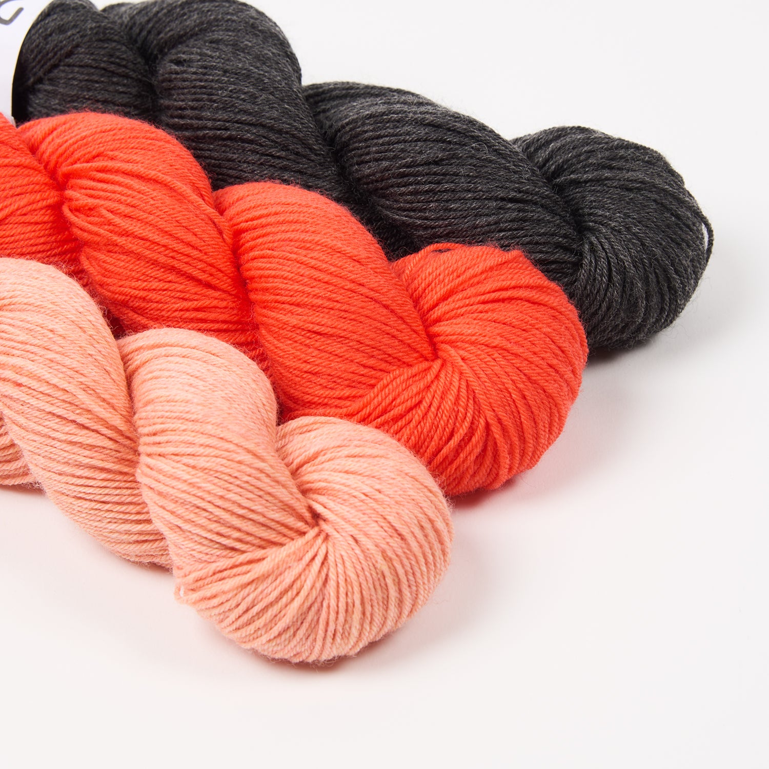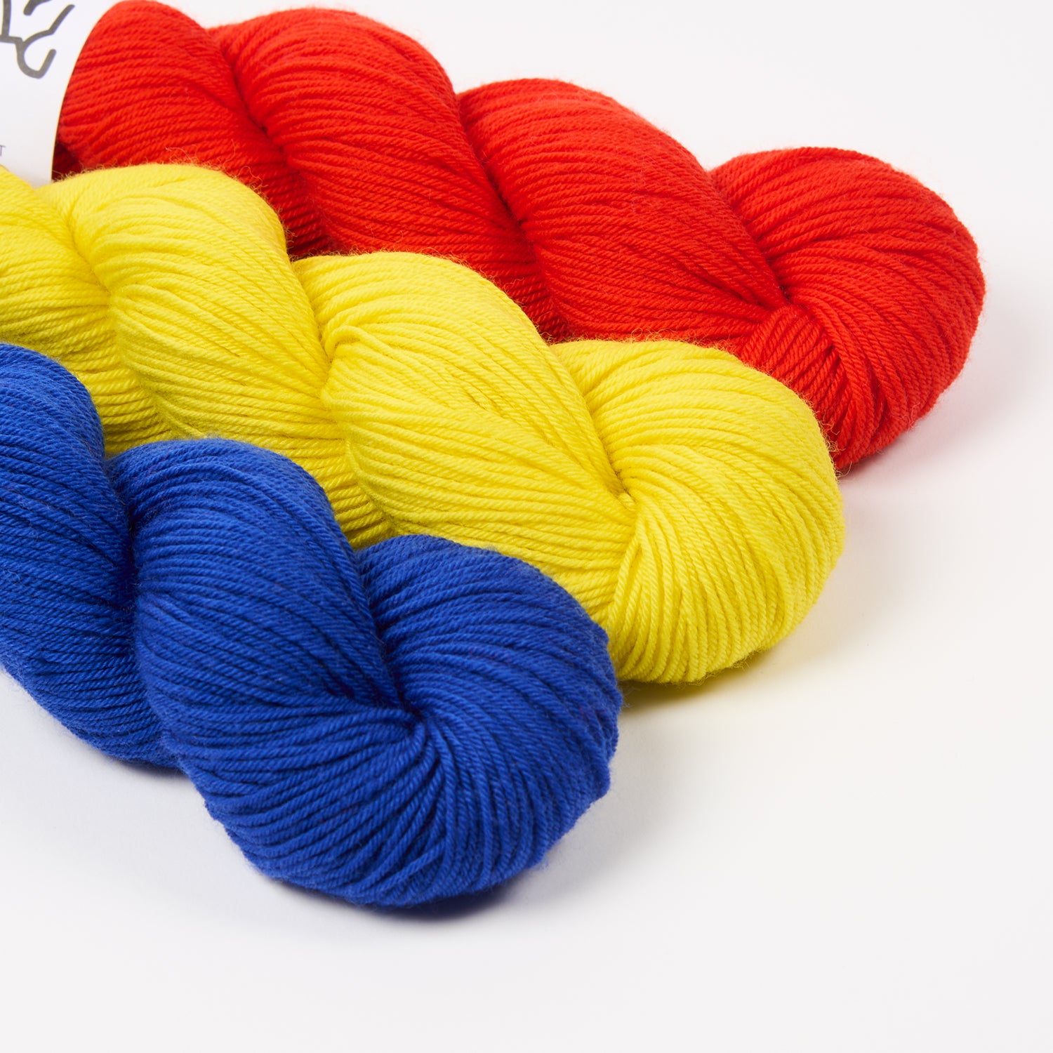 Yarn Requirements: Three skeins of fingering weight yarn in three colours.