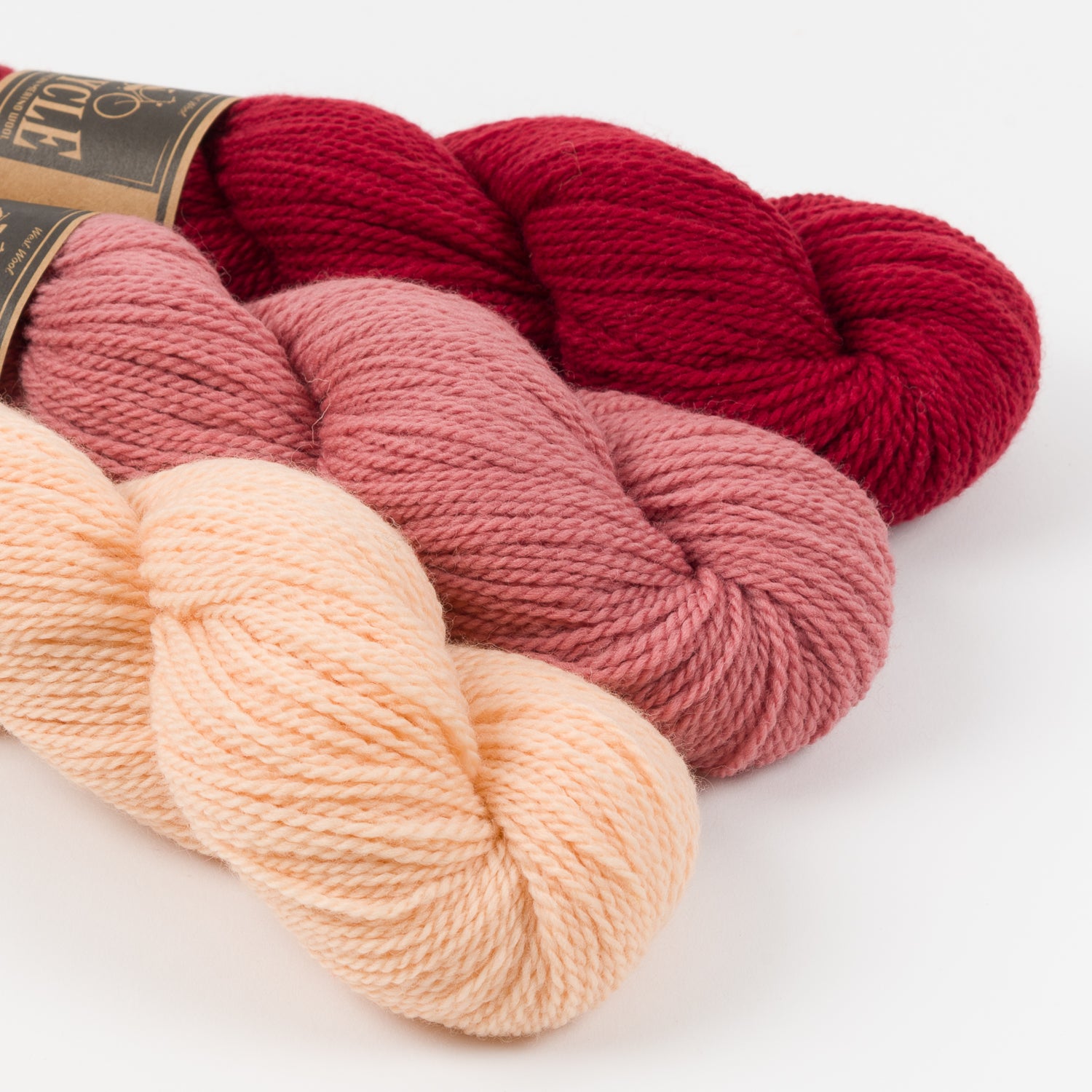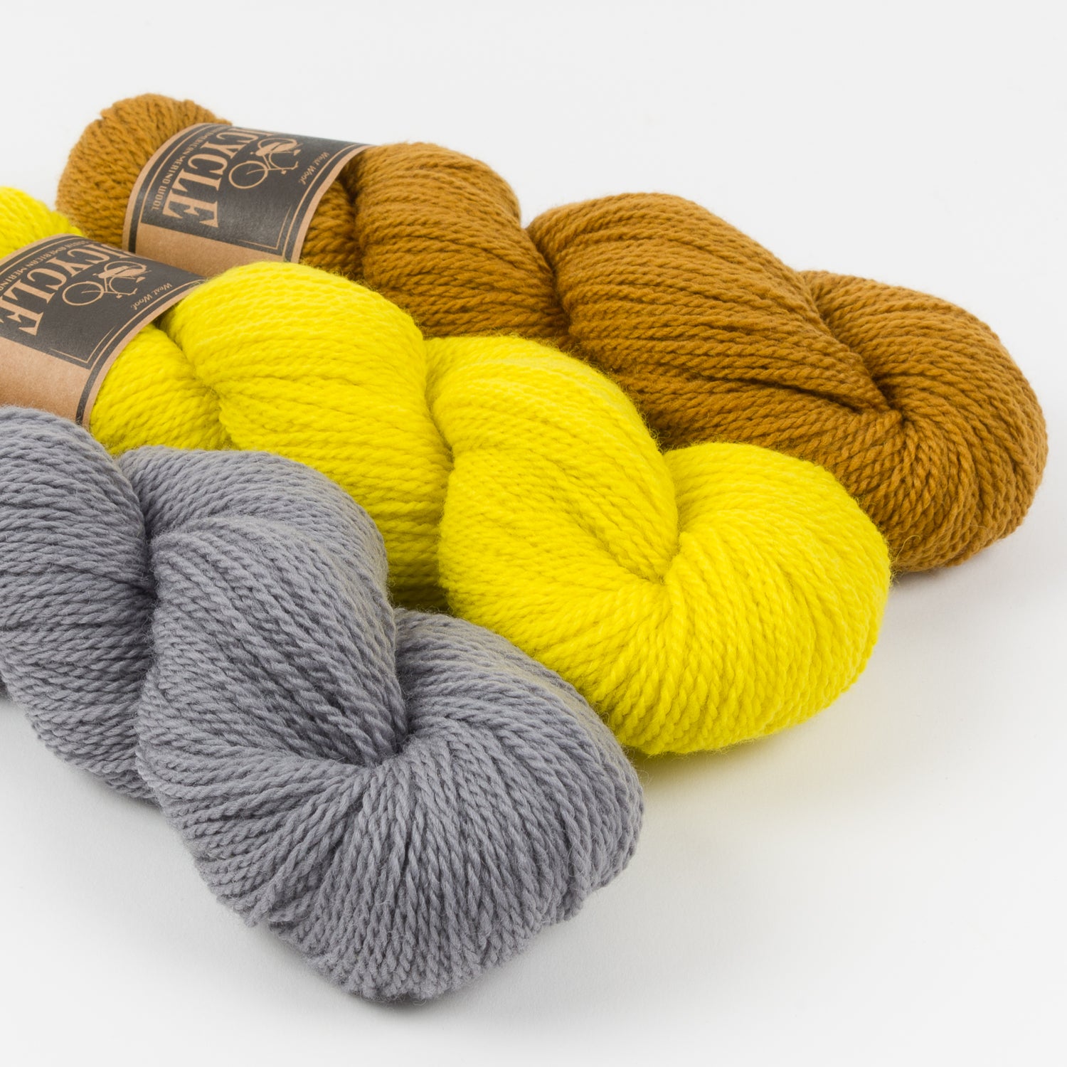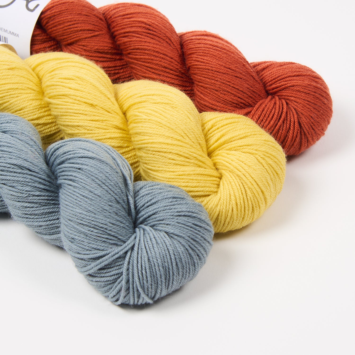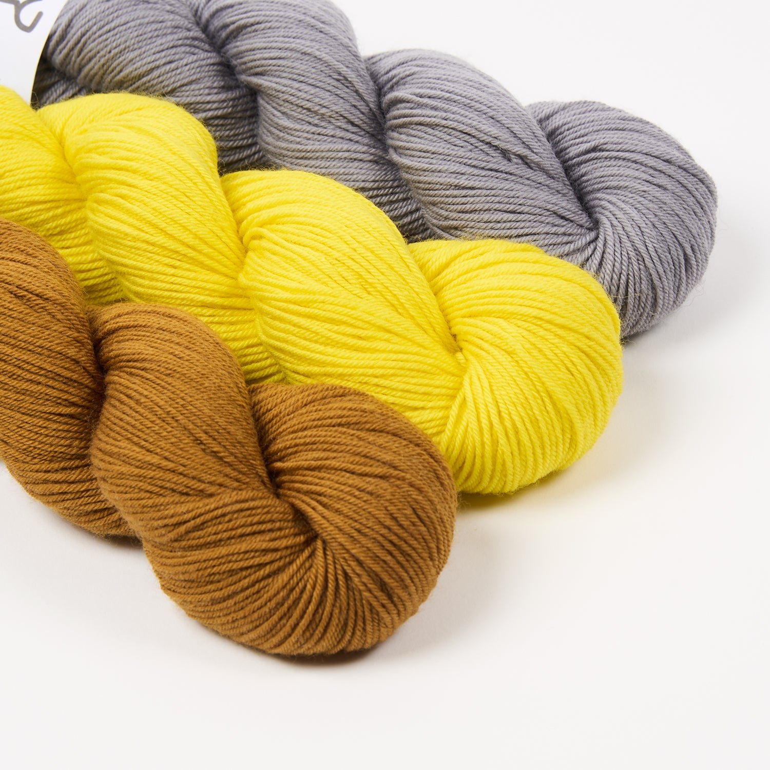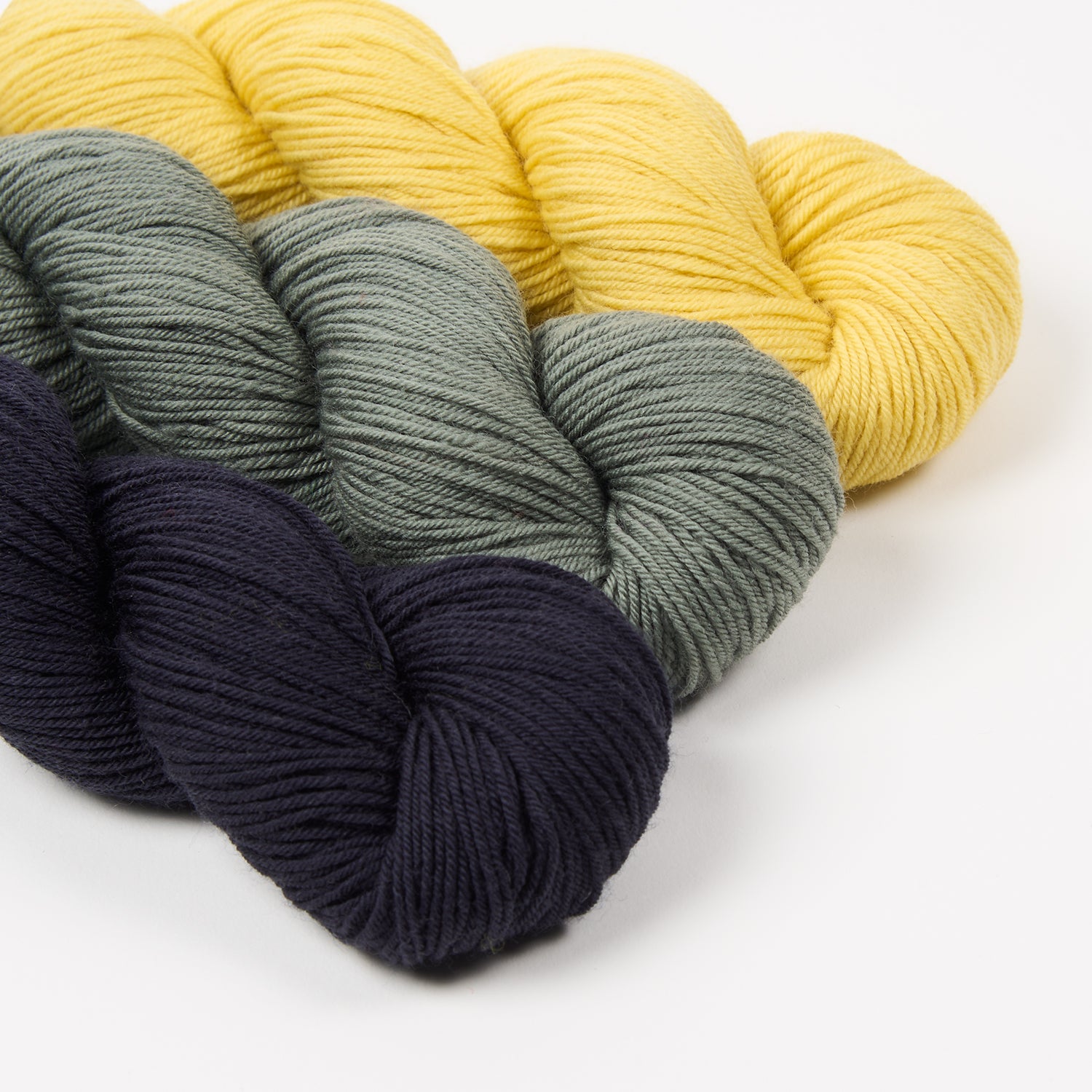 Yarn Requirements: Three skeins of fingering weight yarn in three colours.