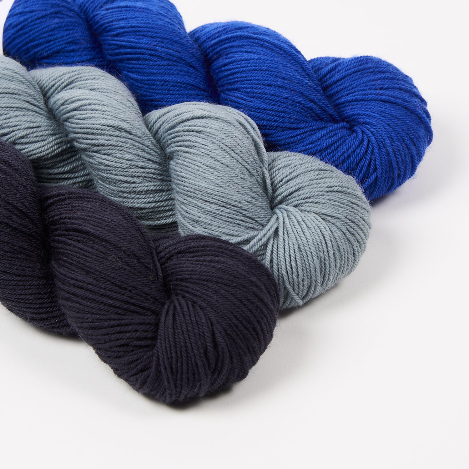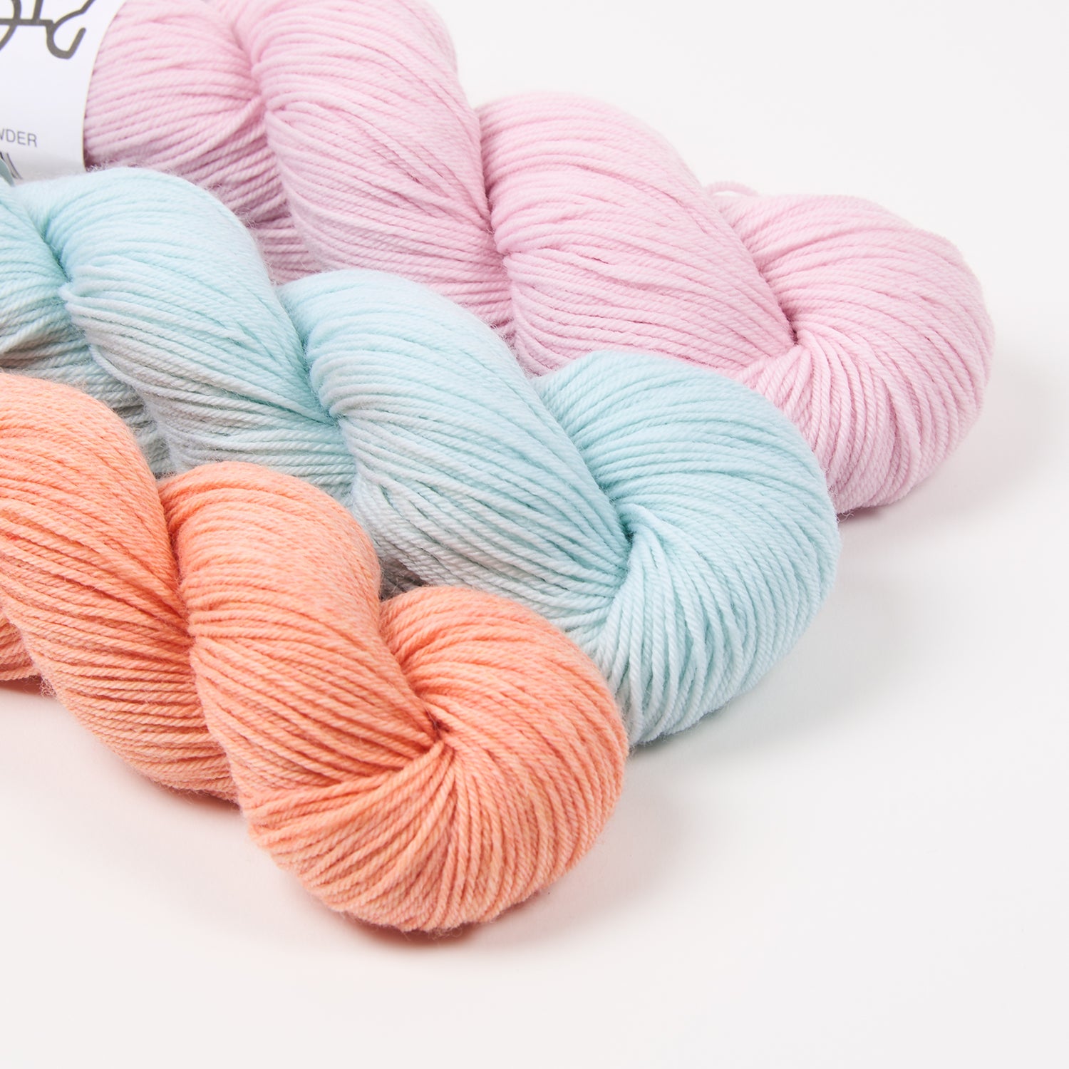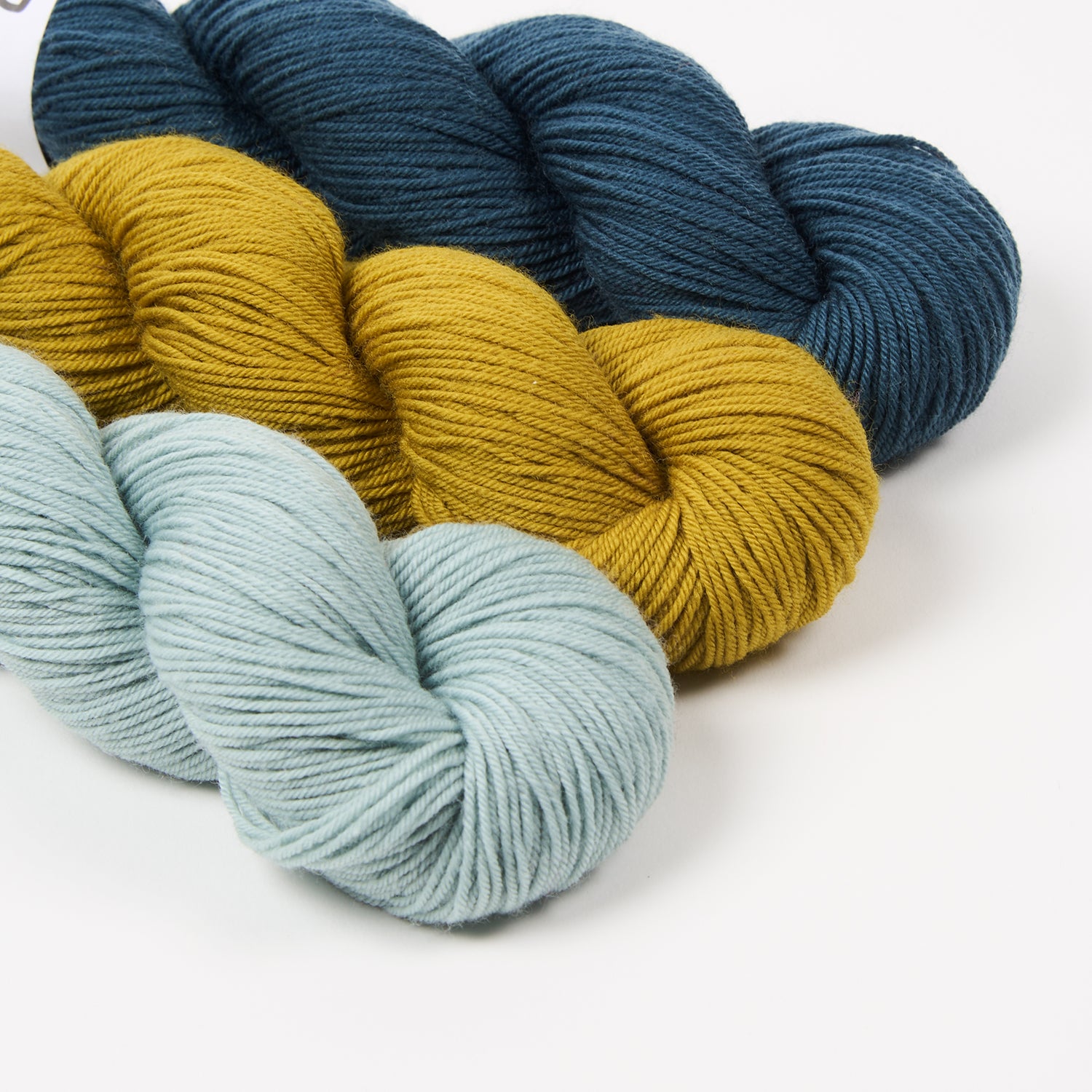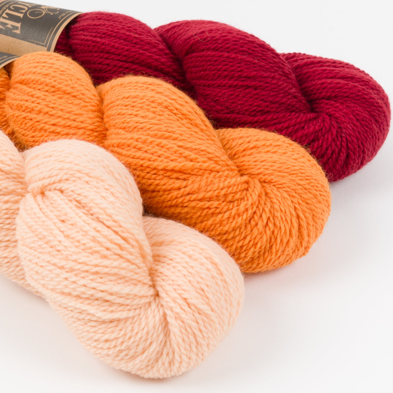 Yarn Requirements: Three skeins of fingering weight yarn in three colours.