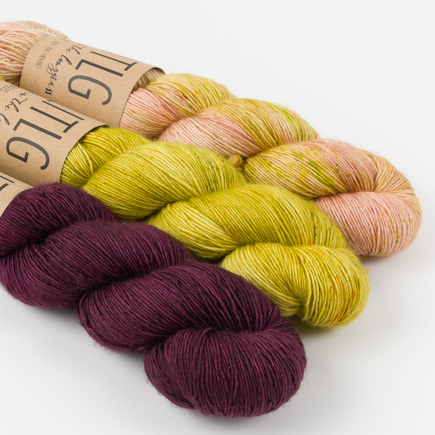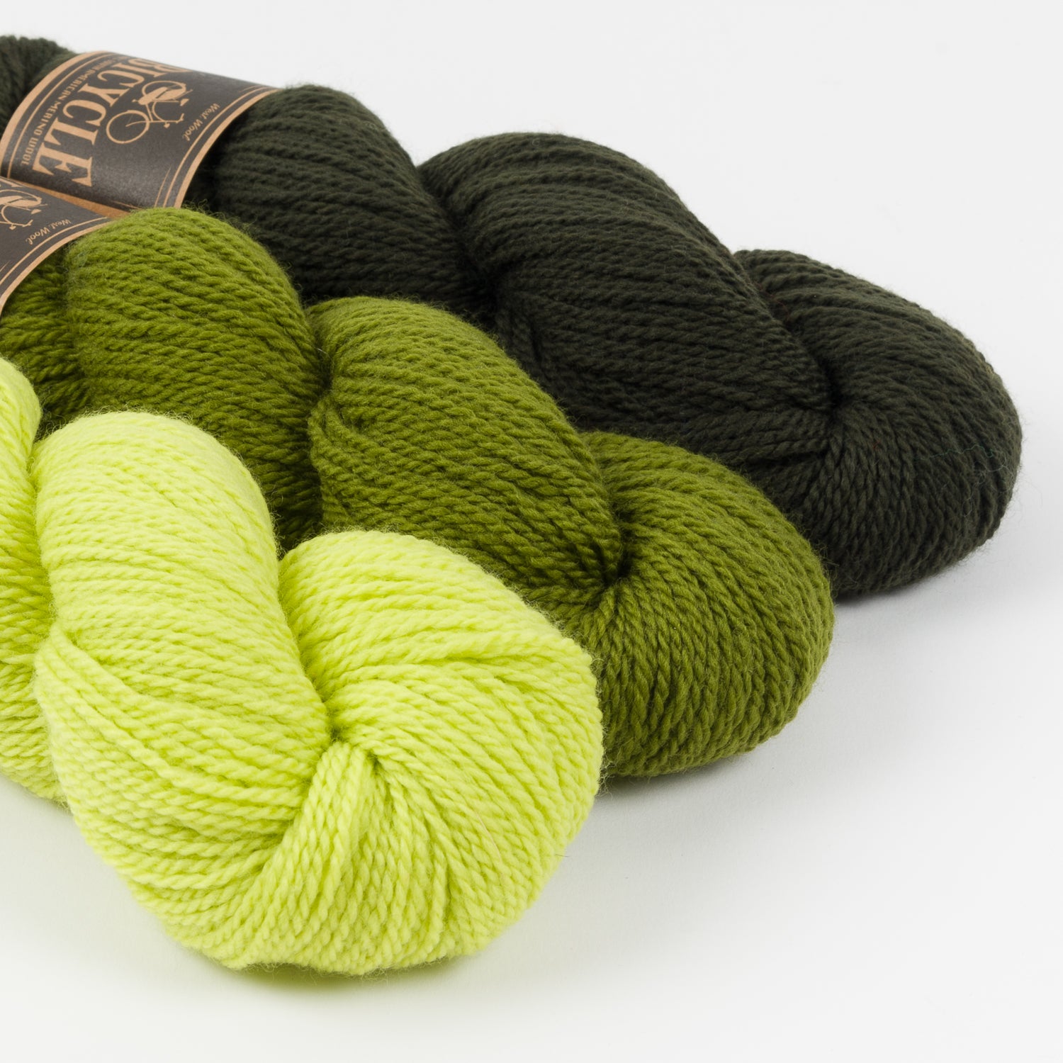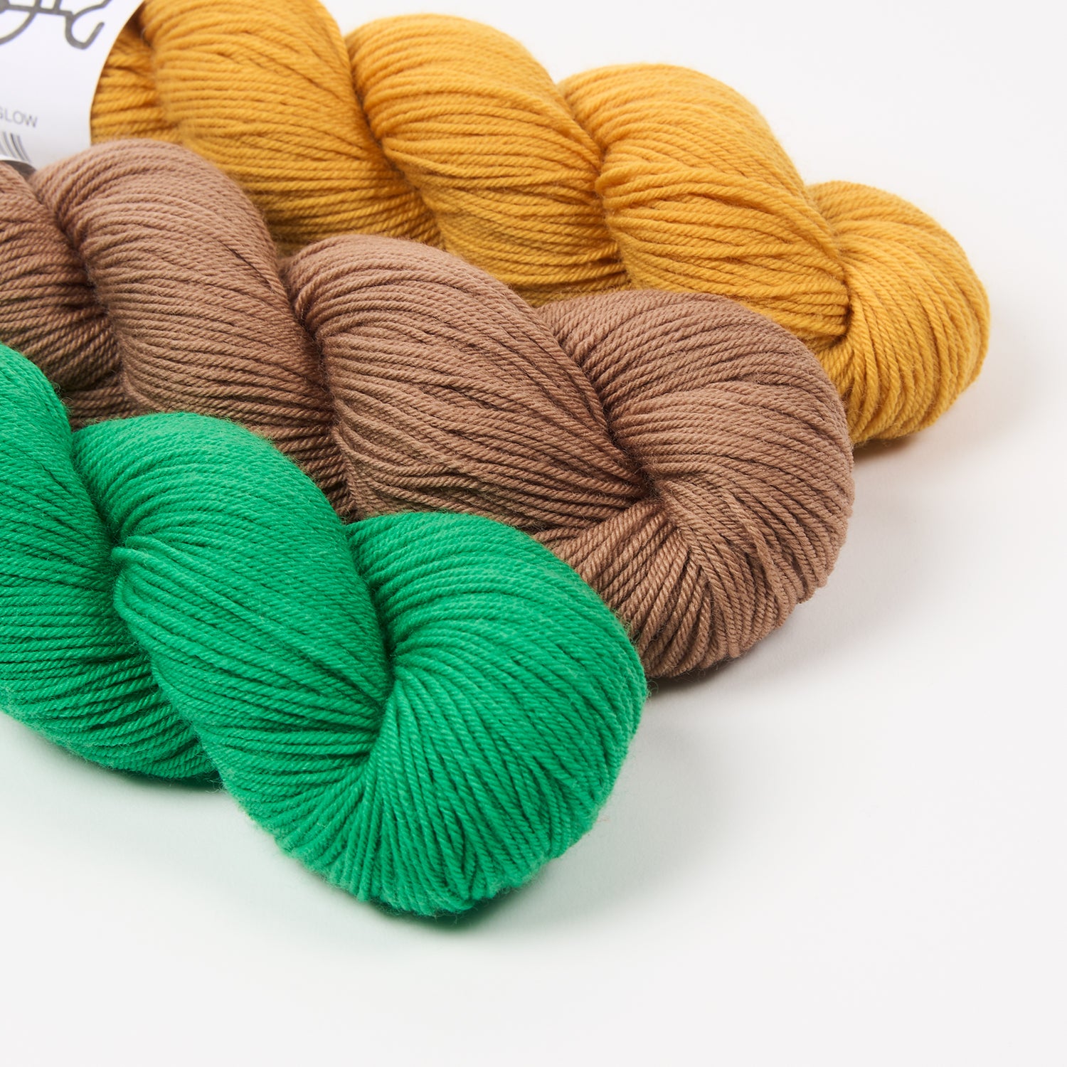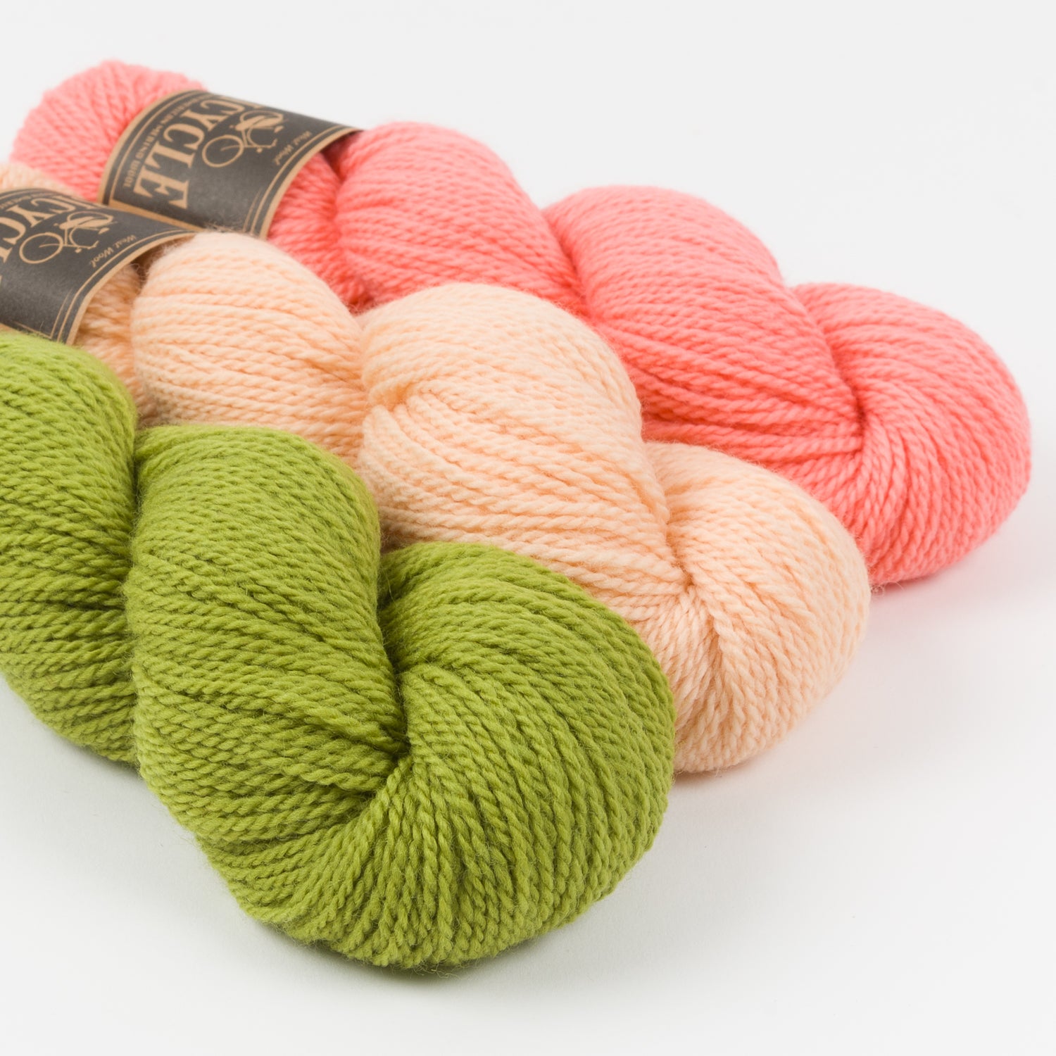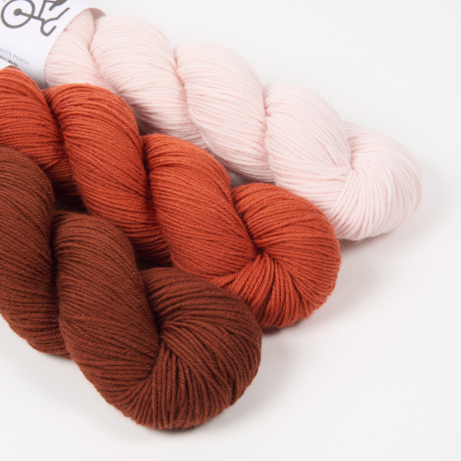 Yarn Requirements: Three skeins of fingering weight yarn in three colours.