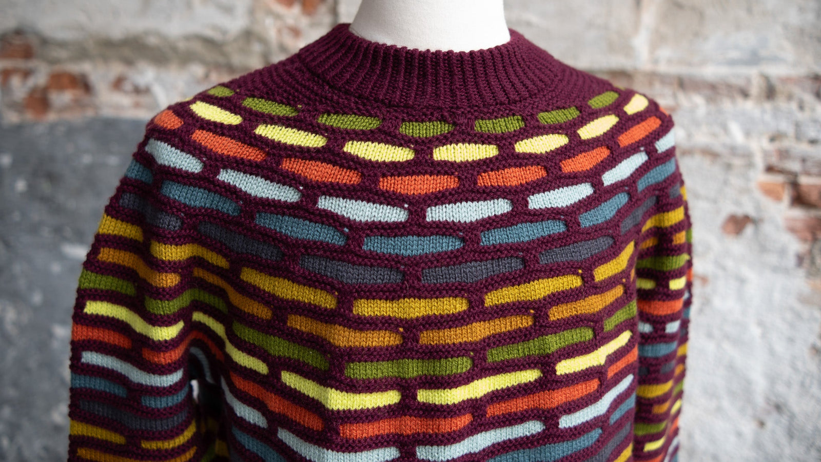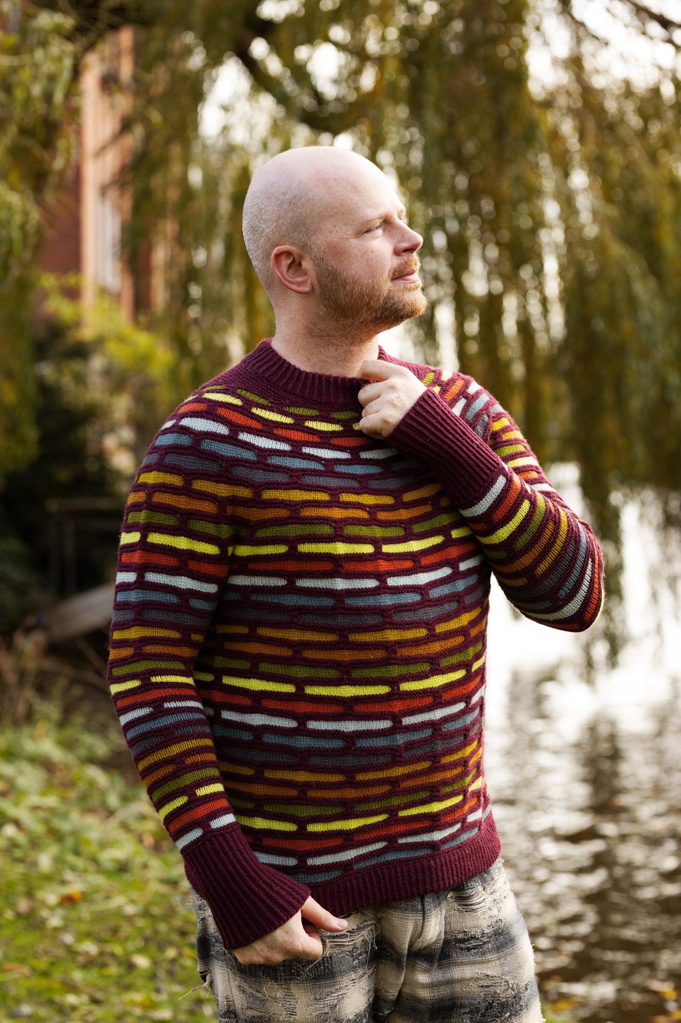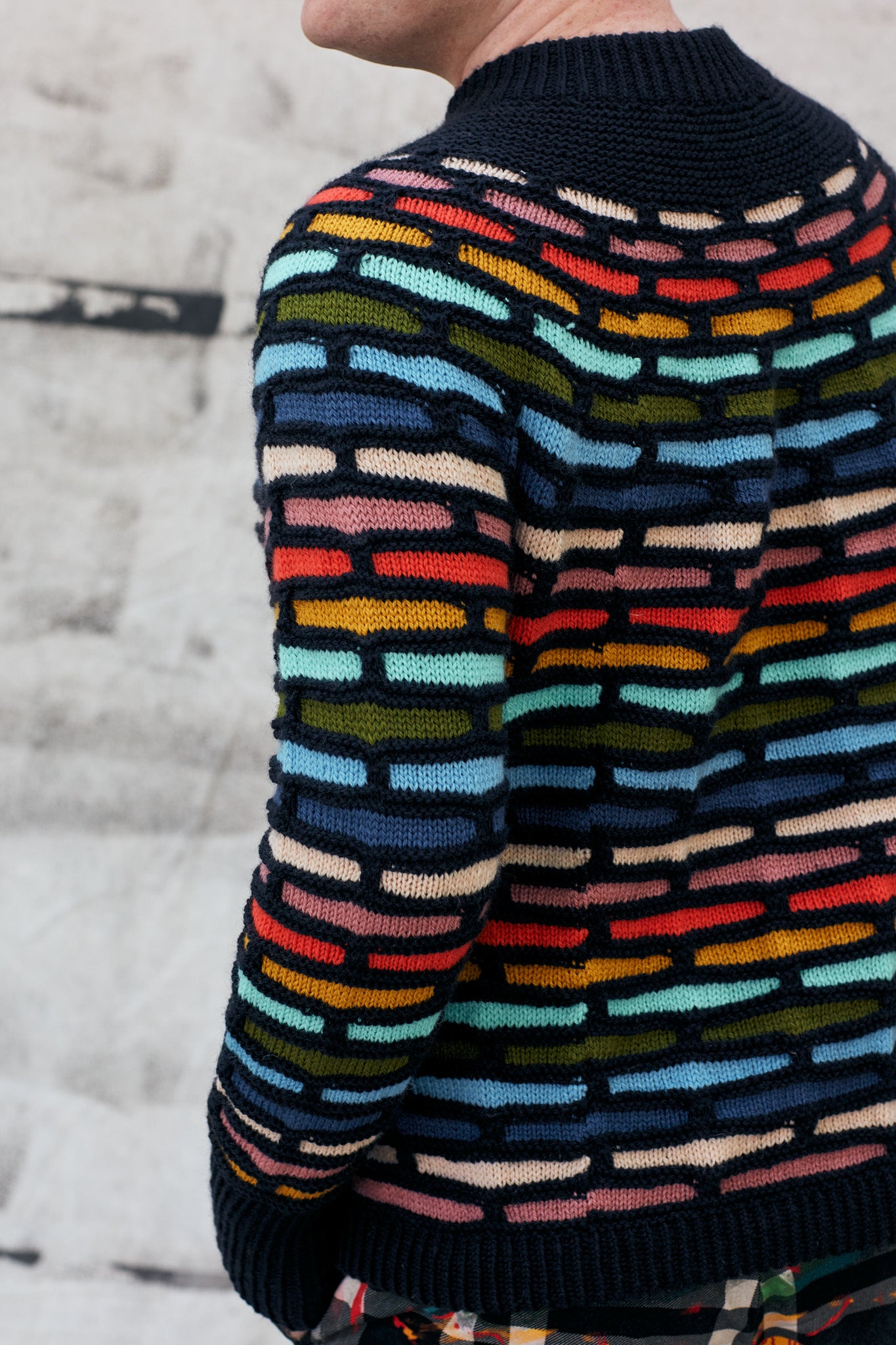 Gather a colourful palette of colours in DK weight to knit this top-down sweater. The pattern is knit seamlessly in the round for easy enjoyable knitting. Stripes and slipped stitches create the graphic brick motif and you only work with one colour at a time. You can use as many contrast colours as you like combined with one main color to frame the painted bricks. Folded hems and ribbed cuffs frame the edges for this modern and stylish sweater.