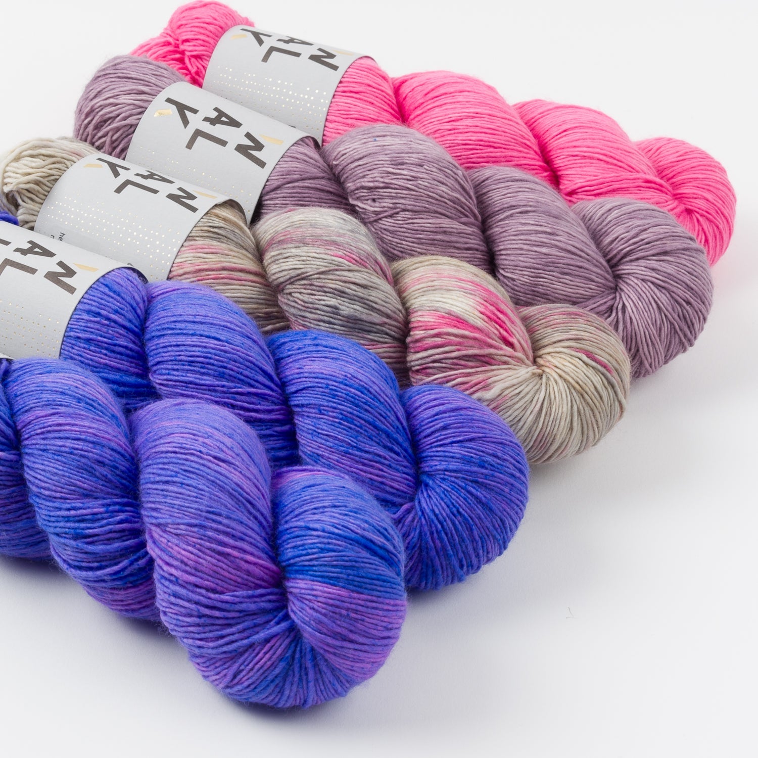 Yarn Requirements: 2 skeins of fingering weight yarn for your main colour and 3 skeins of fingering weight yarn for your contrast colours.This kit includes a Westknits pattern download code that can be redeemed for this or another Westknits pattern of your choice. You will receive your code once your order is shipped and it can then be redeemed on Ravelry!