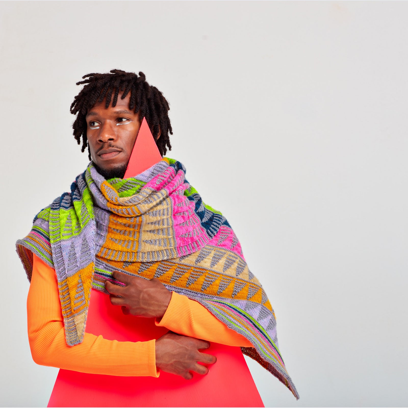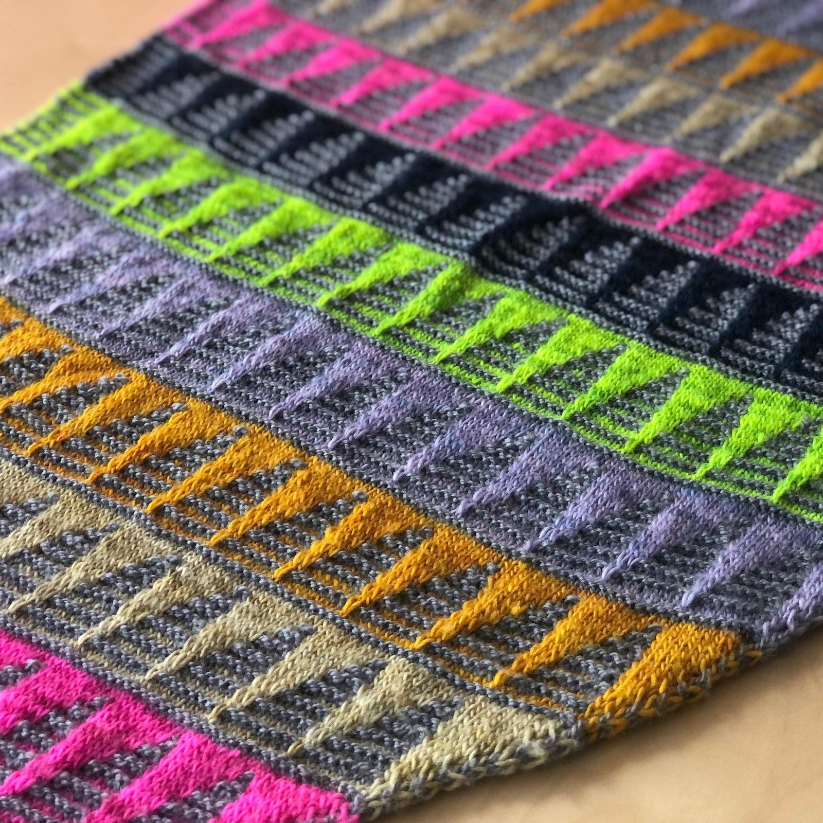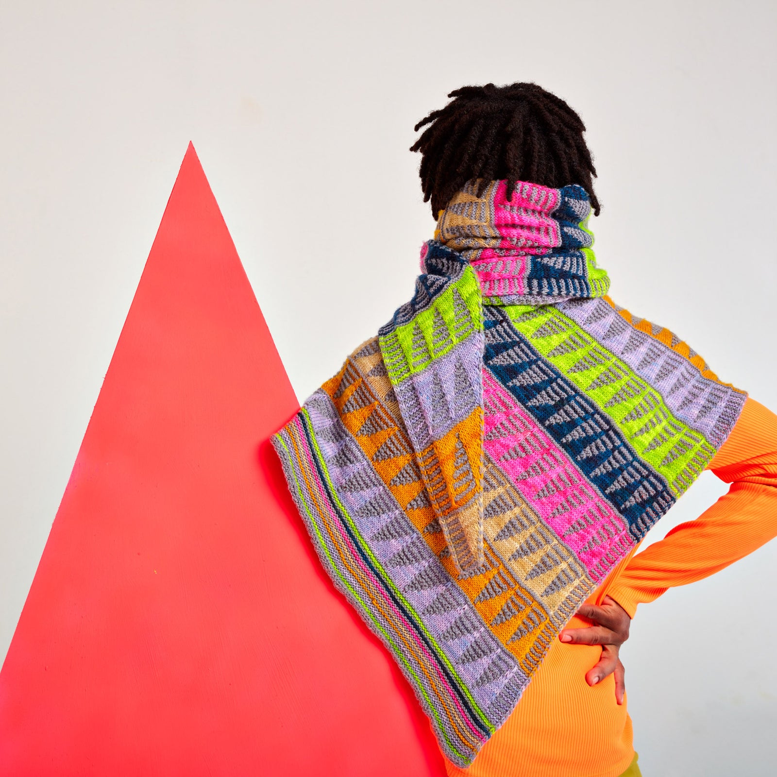 Collect a colourful pile of fingering weight yarns to knit this playfully geometric shawl. Two skeins of the main colour are striped with at least three contrast colours as you work slip stitch triangle motifs. This sideways triangle begins at the small tip and increases gradually toward the wide edge. The overall size is long and not as wide as many other Westknits shawls. You can knit this shawl as large as you want by working more pattern repeats to maximise your yardage amount.