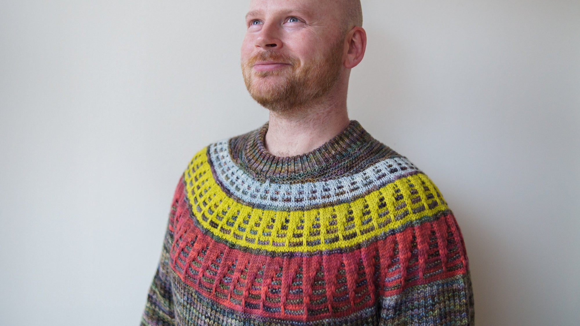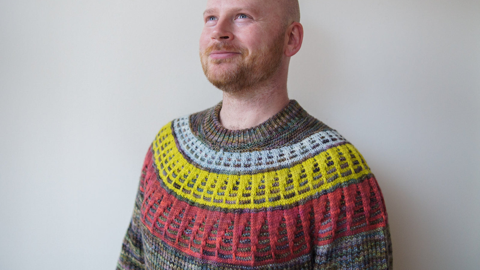This top-down sweater is knit seamlessly in the round in scrumptious broken rib stitch for a beautiful textured effect. The striking triangle motif in the yoke is created by simply slipping stitches. You can easily customise the length of the sleeves, body, and collar with more or less textured pattern repeats. Select one of the gorgeous kits carefully curated by Stephen featuring a dominant colour of DK weight yarn for the body and three contrasting shades for the colourwork yoke to cast on the Painting Triangles Sweater!
