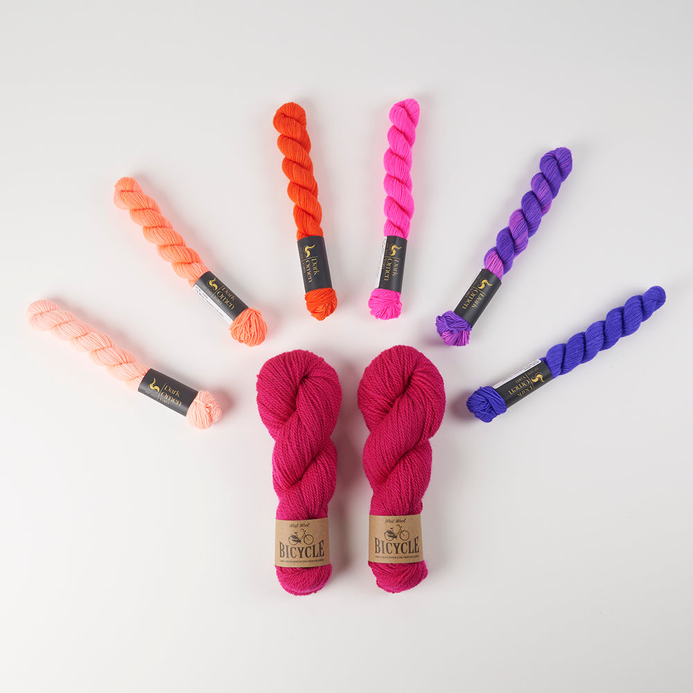 Have a look at this gorgeous Dark Omen Yarn kit! It contains two 50g skeins of West Wool Bicycle and eight Merino Sock Mini skeins of fingering weight yarn in seven beautiful colours. In case you need inspiration, it works perfectly for the Daybreak Shawl from Westknits!