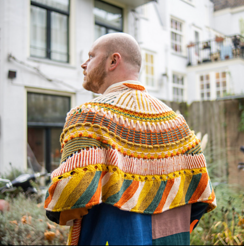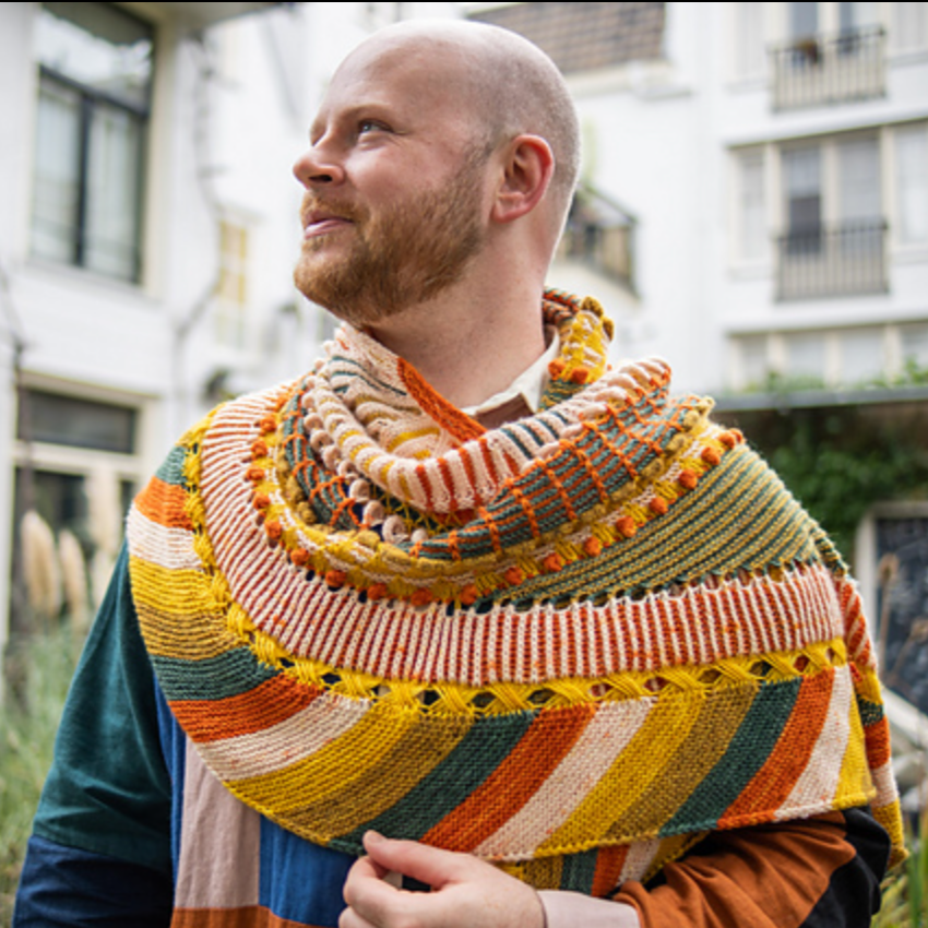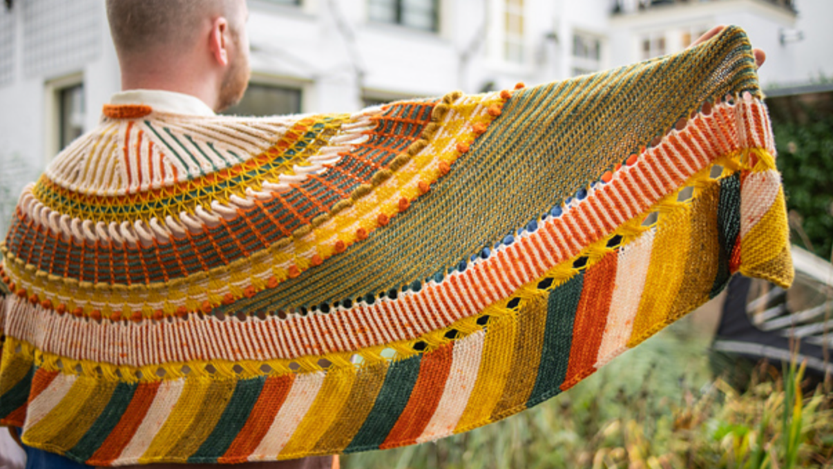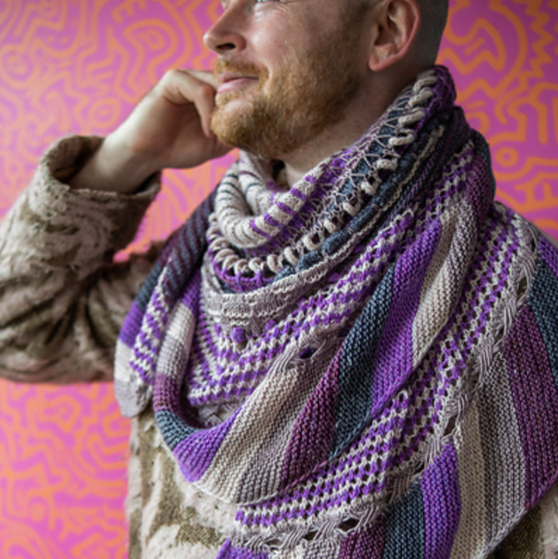 This semi-circular shawl was originally published as the Westknits Mystery Shawl Knit Along in 2021. Choose five contrasting colours of fingering weight yarn and enjoy all of the fun textures throughout this shawl. Stripes, short rows, slip stitches, I-cord loops, bobbles, and welts all contribute to the colorful collage of knitted fabric.