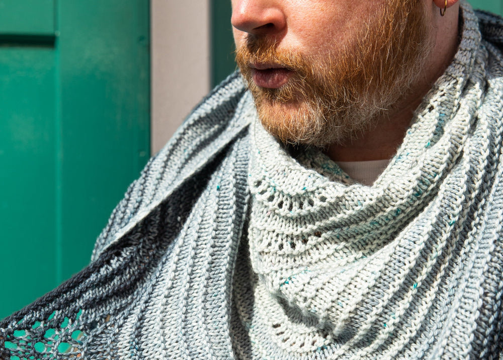 Choose four colours of worsted or aran weight yarn and fade them together for this simple top-down shawl. Textured stripes flow into a wavy border that is easy and quick to knit.