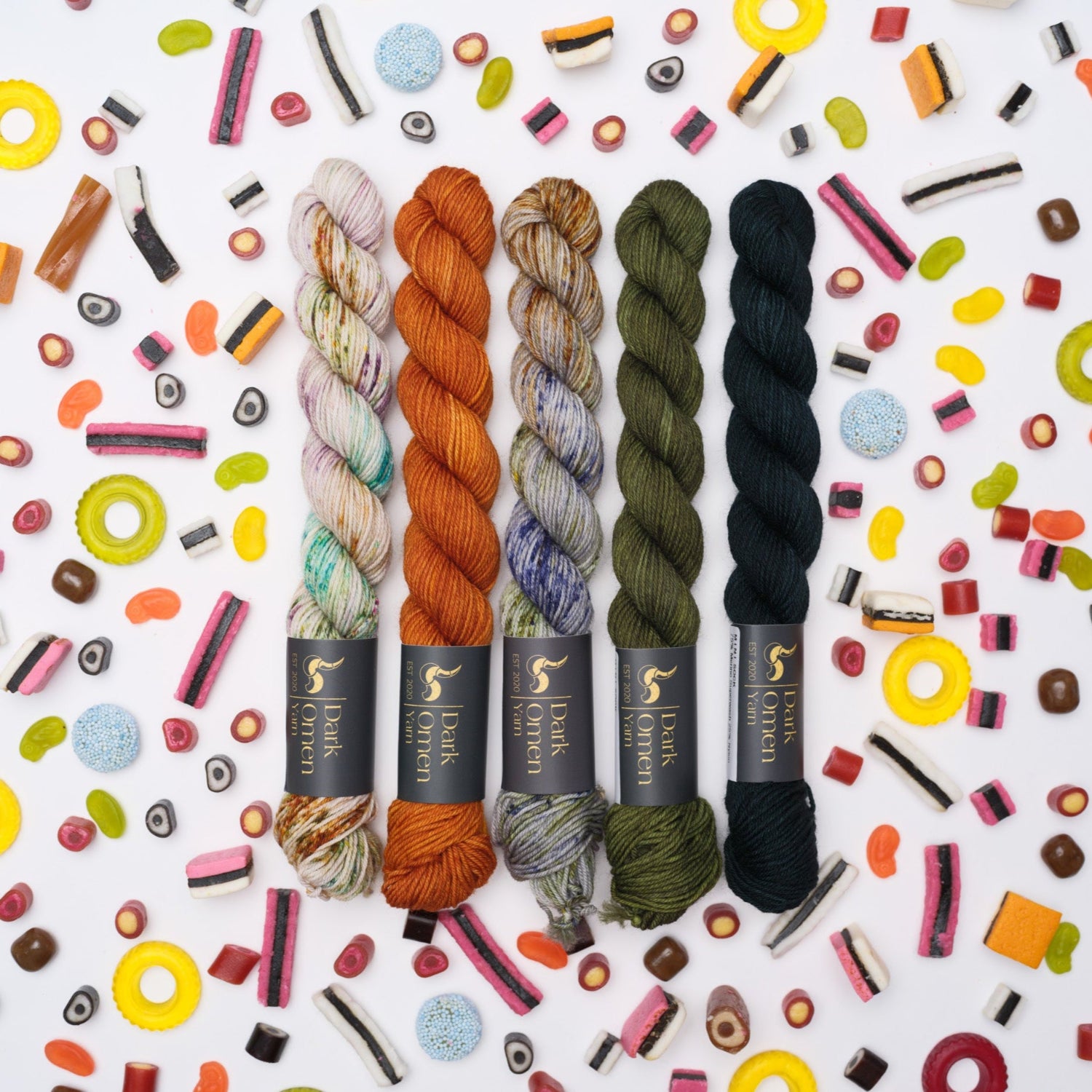 This stunning kit fromDark Omen Yarncontains five mini skeins of Merino Sock Mini in five different colours.