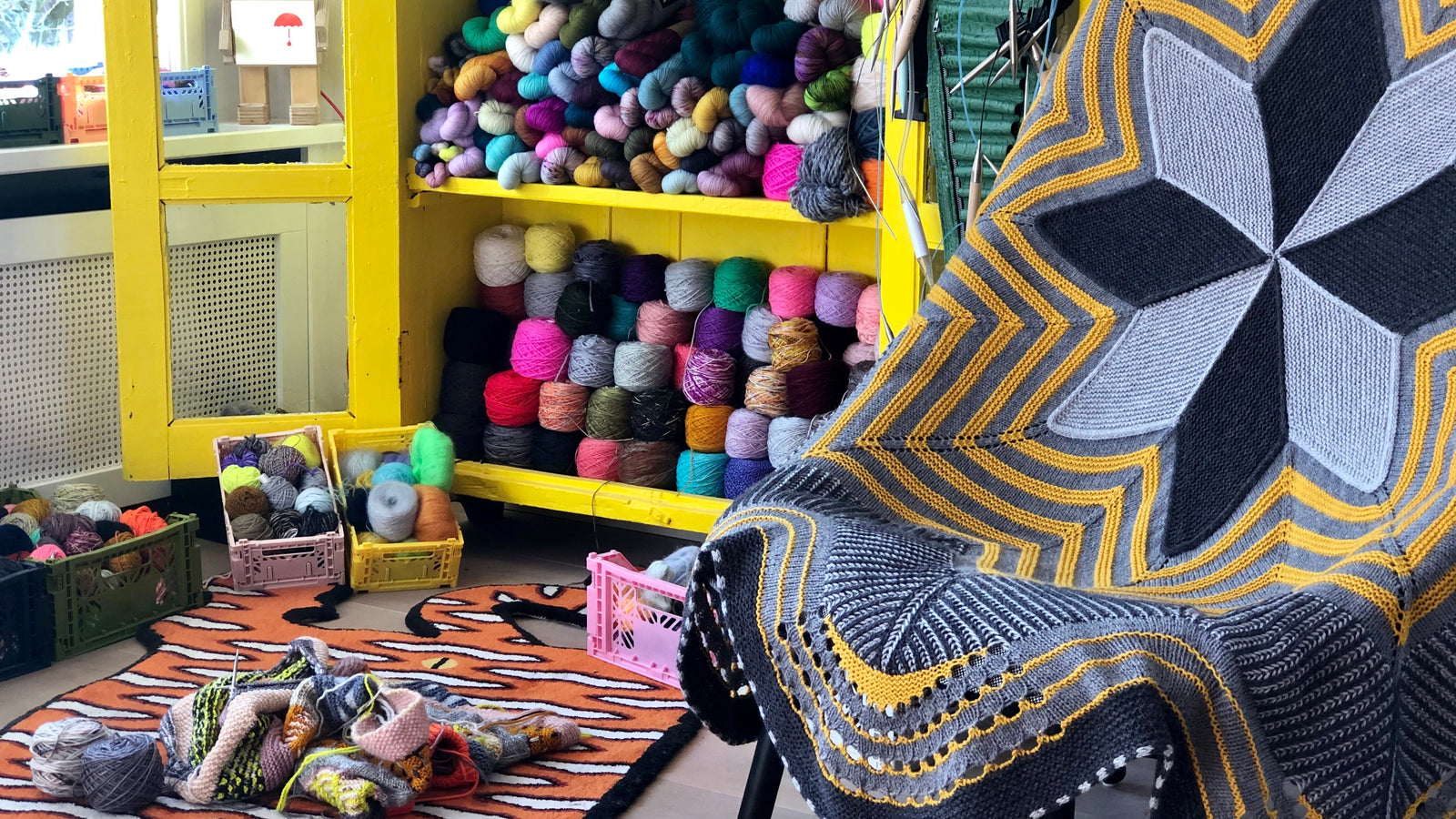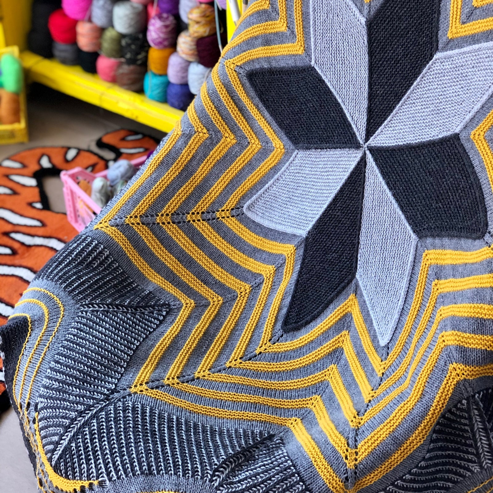 Inspired by the tenth annual Westknits Mystery Knit Along: Starflake, this circular blanket makes a graphic statement in every room. Stripes, brioche, short rows, and eyelets frame a beautiful modular centrepiece. Choose your favourite DK weight kit to knit a stellar blanket that dazzles.