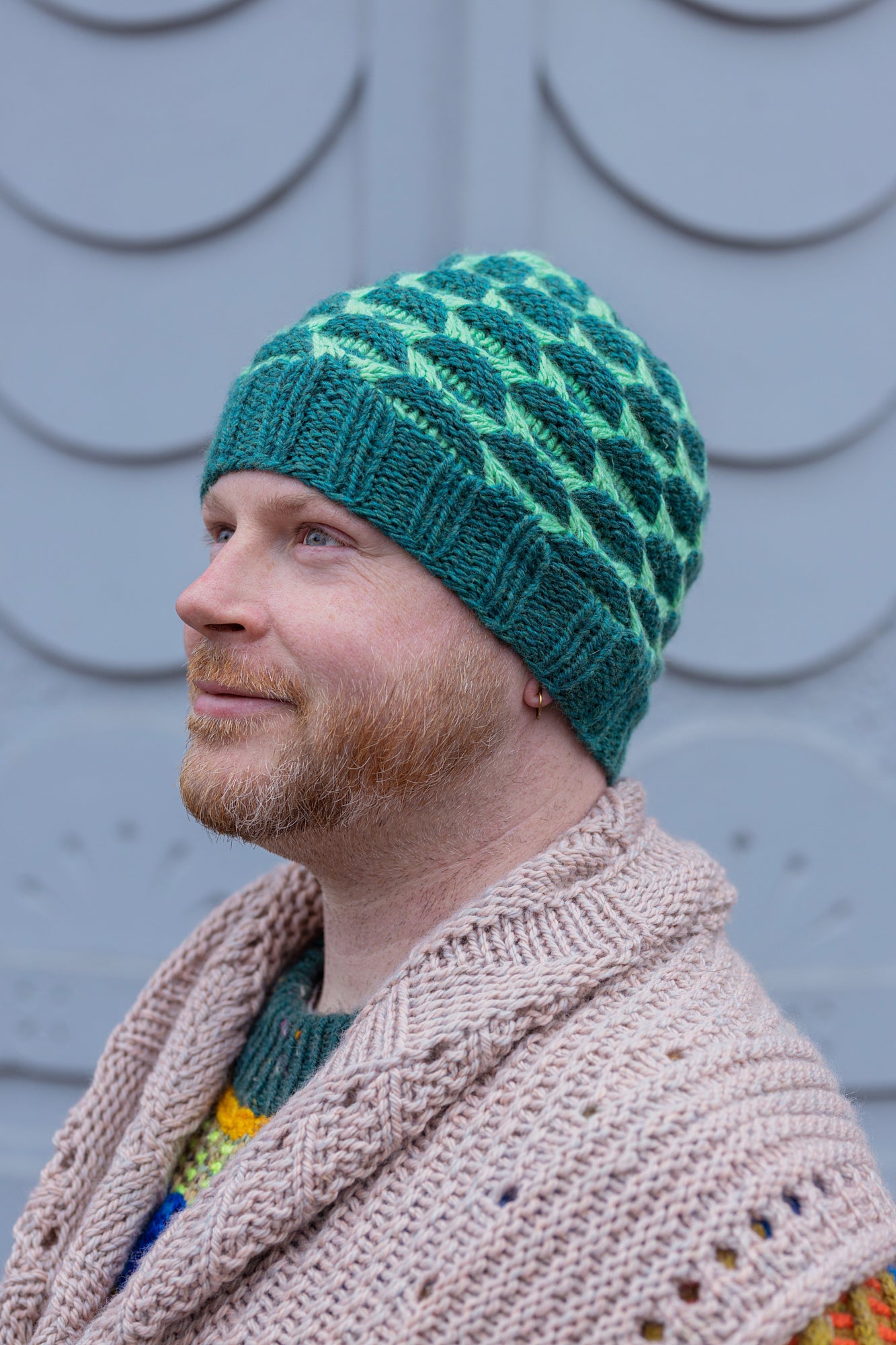 The fantastic Stony Stream Hat is a cosy textured hat, ideal for beginner cable knitters or a quick last-minute gift. The brim of the hat begins with 2x2 ribbing, followed by stripes and cabled slip stitches. The main colour is worked for four rows as you slip the contrast colour stitches. The contrast colour is worked for two rows with a simple cable cross to form the meandering stony stream pattern. Thechunky yarn yields a plush fabric that is quick to knit and warm to wear. You can choose your favourite two-colour combination of West Wool chunky weight Cargo and enjoy knitting the bold stripes and textured stitches of this satisfying hat!