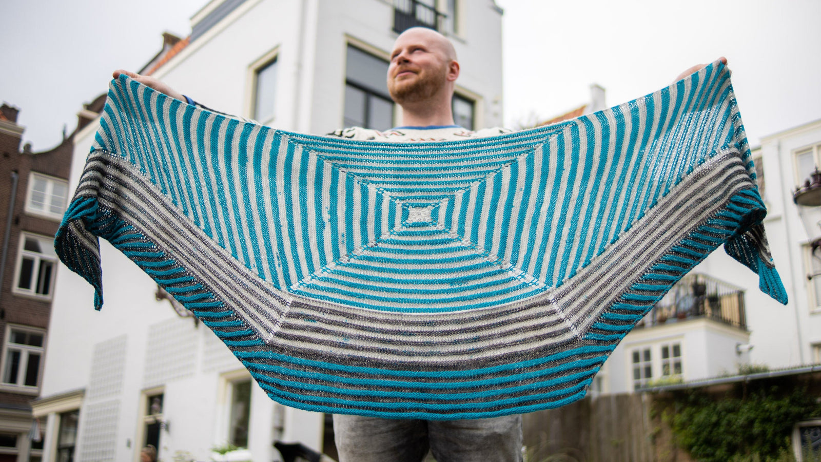 Yarn Requirements: 300g of fingering weight yarn in three coloursThis graphic striped shawl features three colours of fingering weight yarn. Begin in the centre and knit outward with eyelet increases for the square shape in Section 1. Continue to knit the wingtips for bold stripes. The other sections are knit by picking up stitches, so you don’t have to do any seaming. The angular stripes converge into a striking geometric shawl with simple clean lines and easy to knit rows.