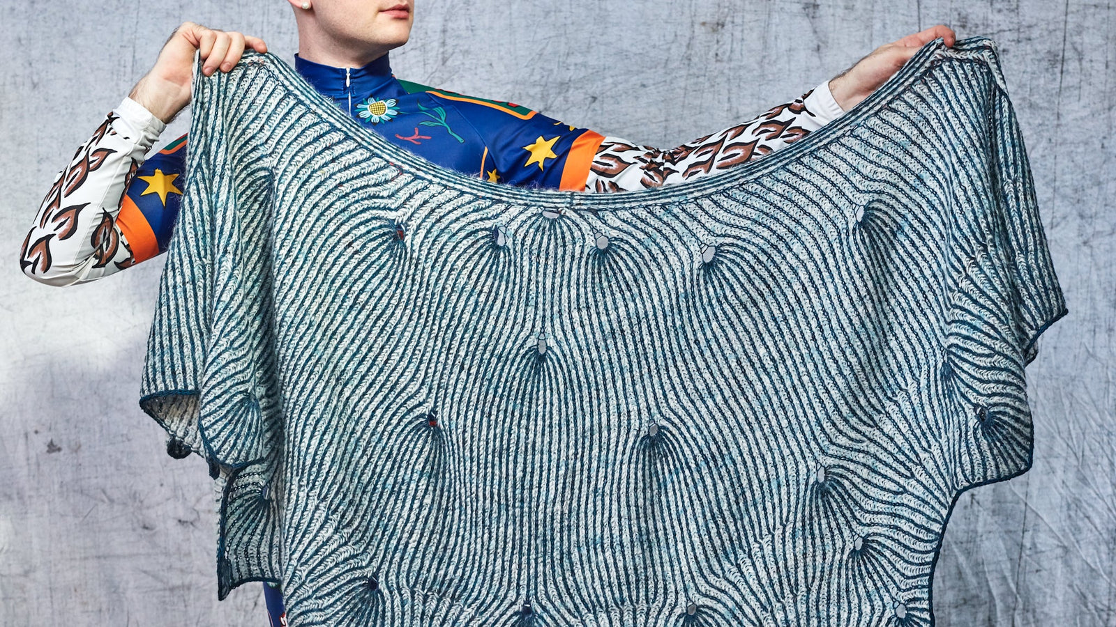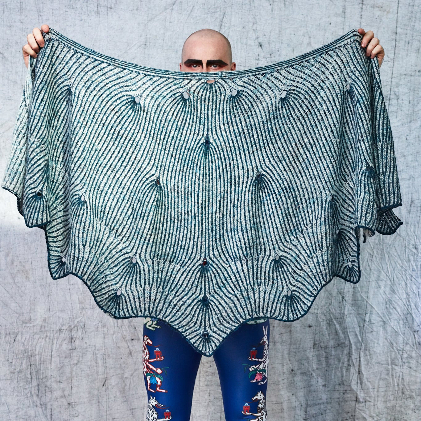 Choose two colours of yarn for this top-down brioche shawl. Massive increases shape the semi-circular fabric as they suddenly explode and create a big hole from a single stitch. Increases and decreases form the final wavy border.