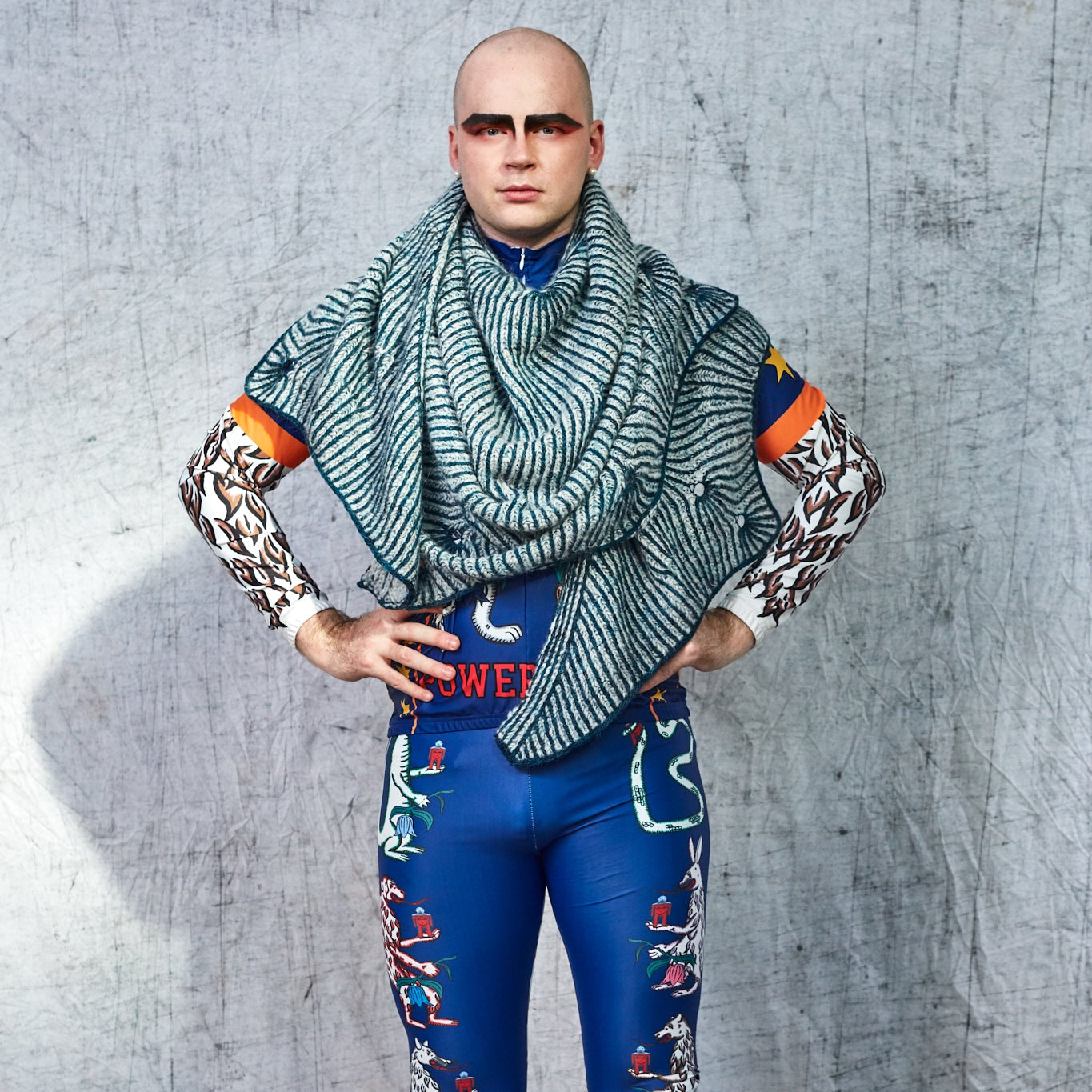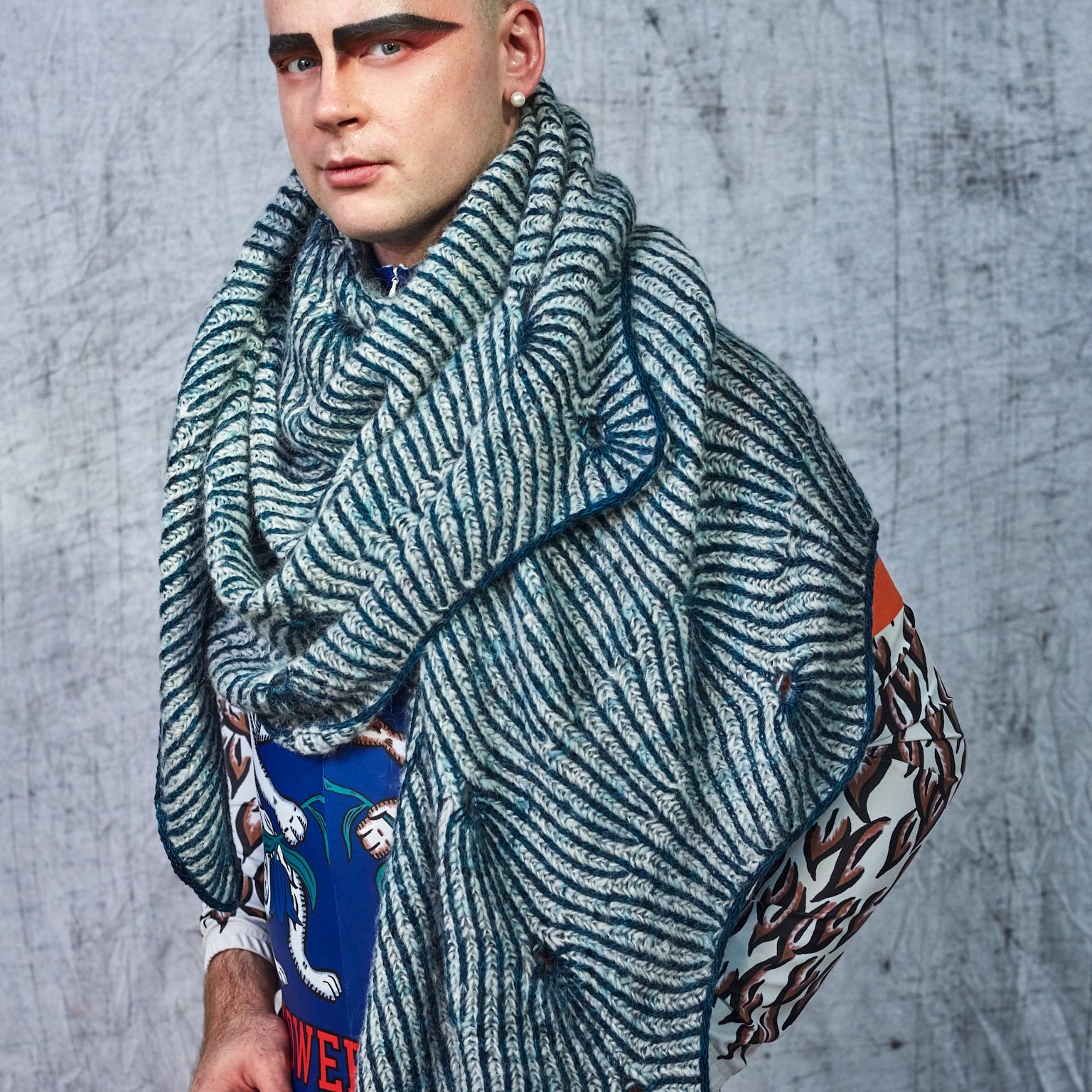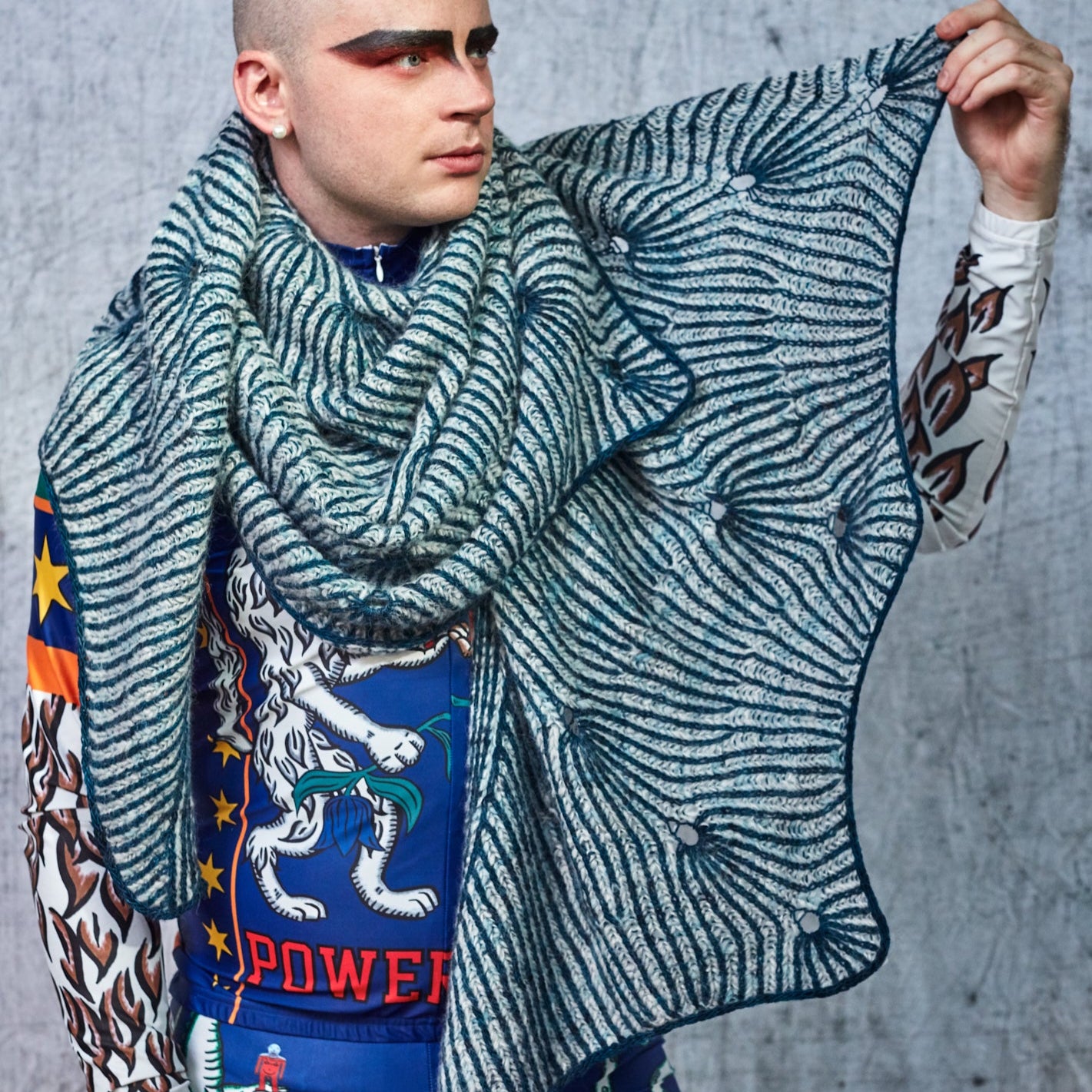 • This image shows Stephen West wearing the  Aurora Cabin Triangle The shawl is knitted with green, yellow, and blue tones. The background shows a street in Amsterdam centre.