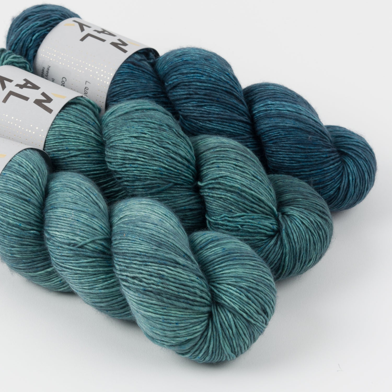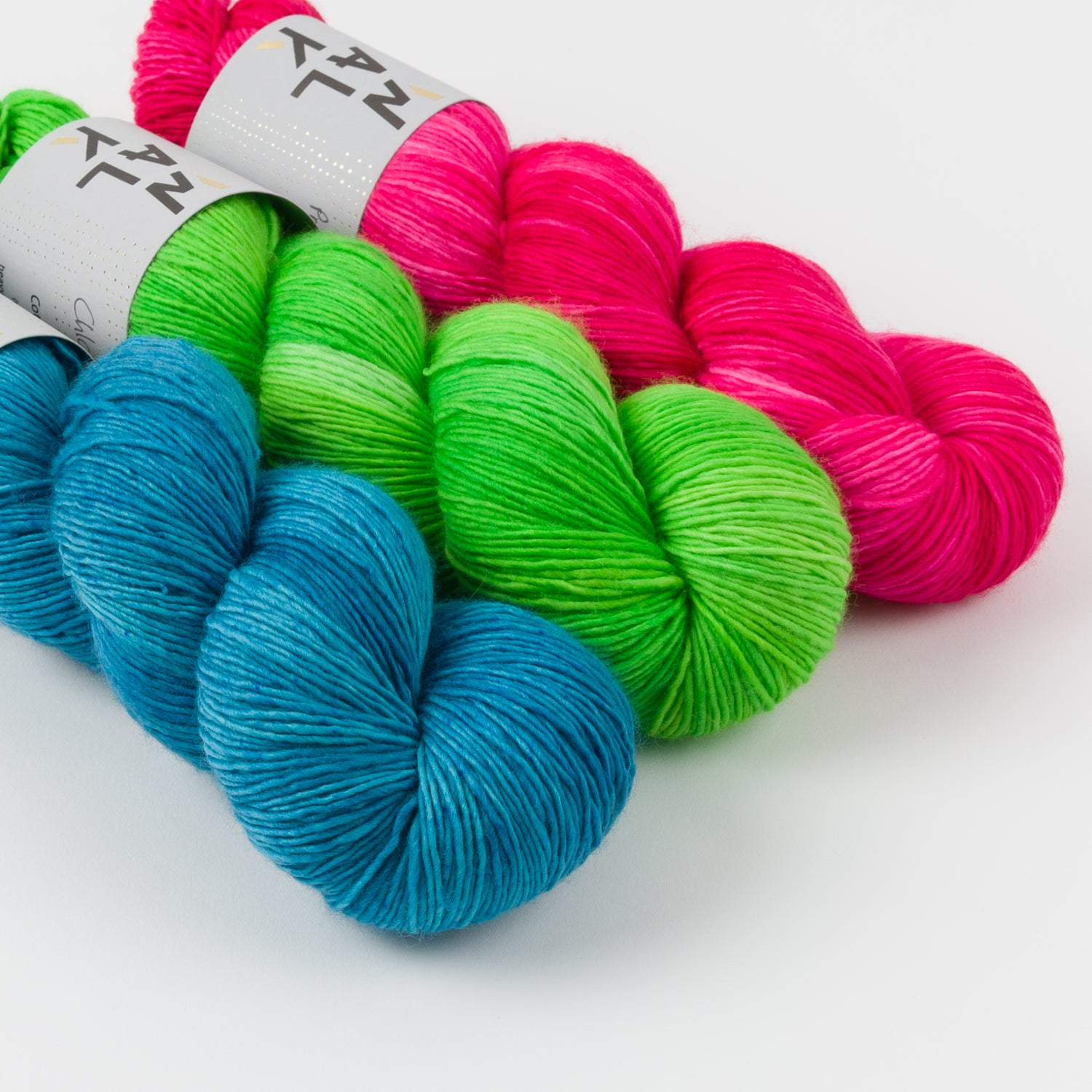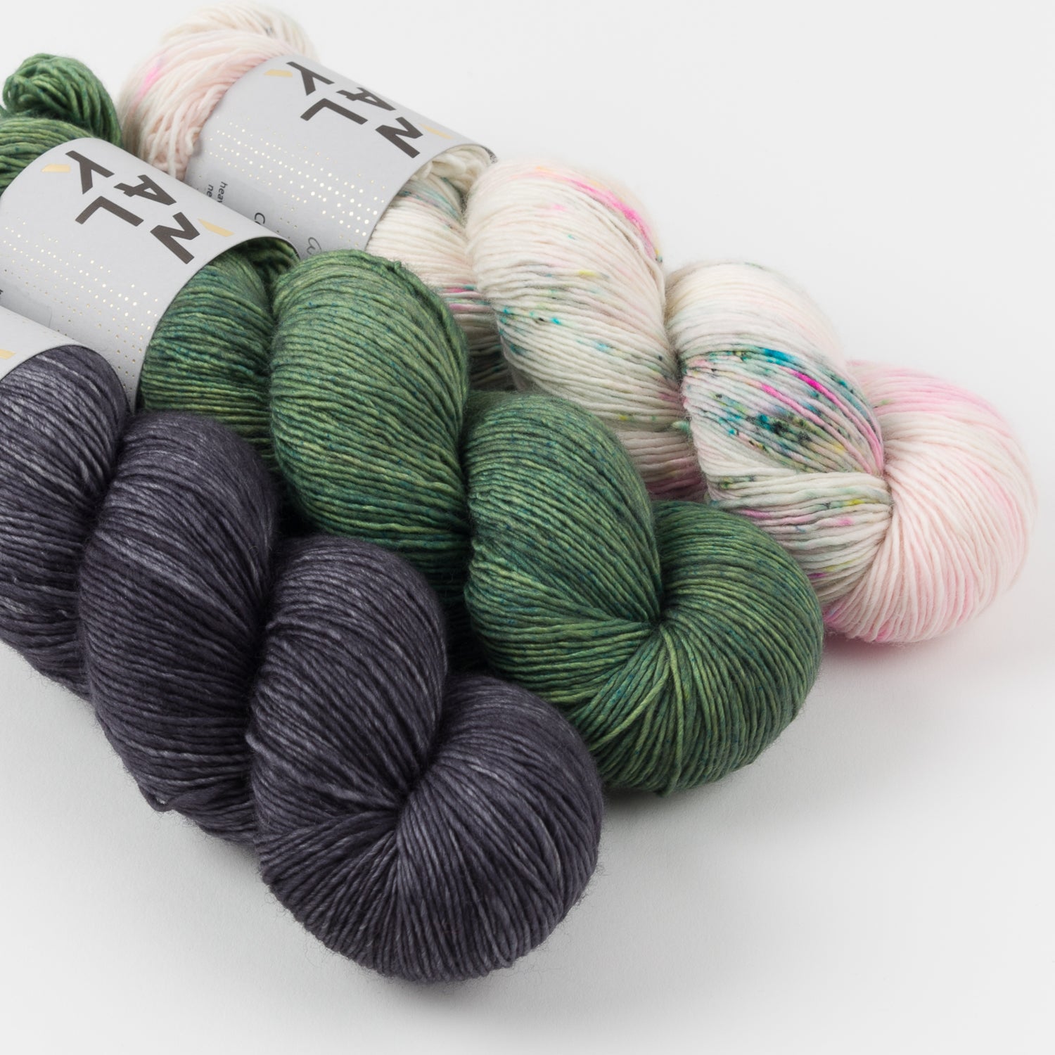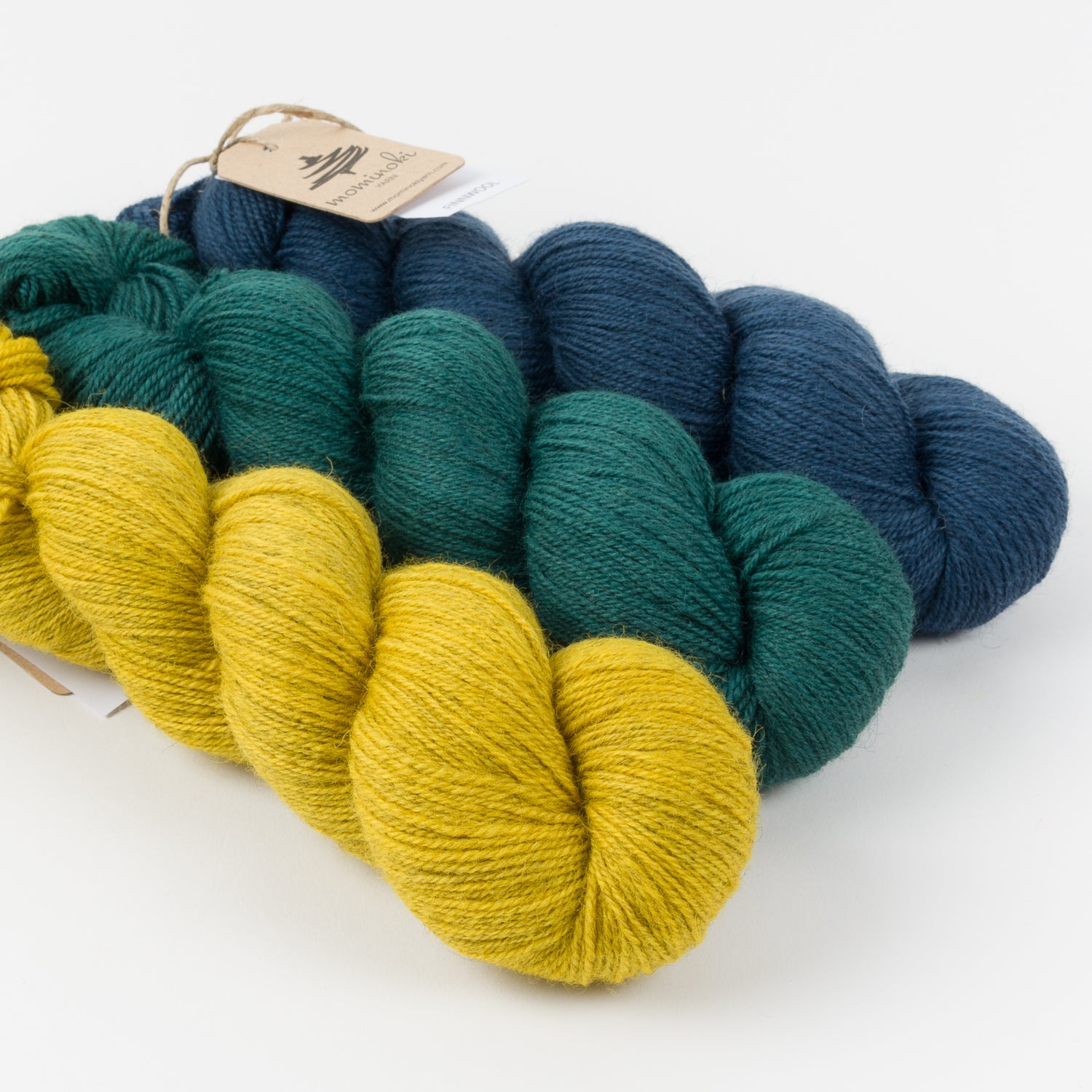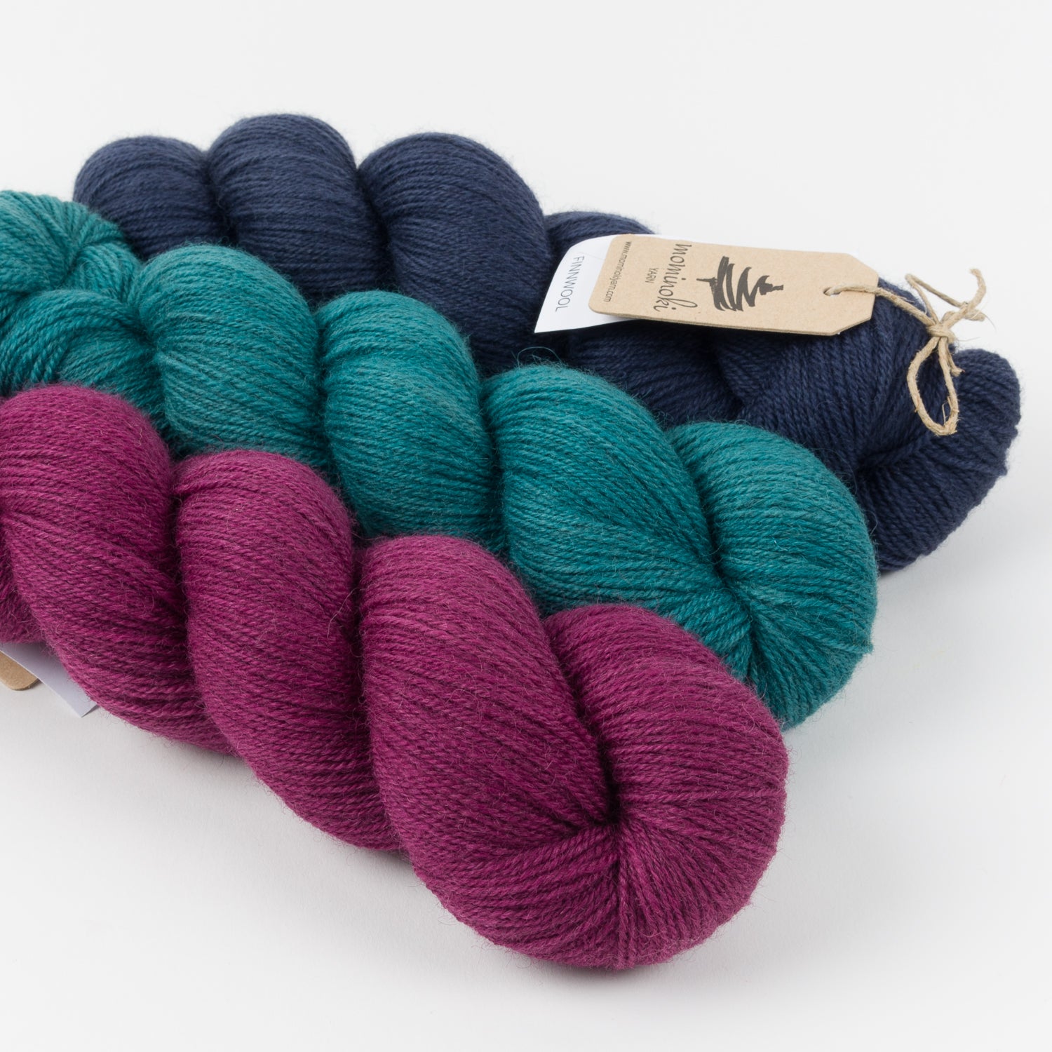 Yarn Requirements: Three skeins of fingering weight yarn in three colours.