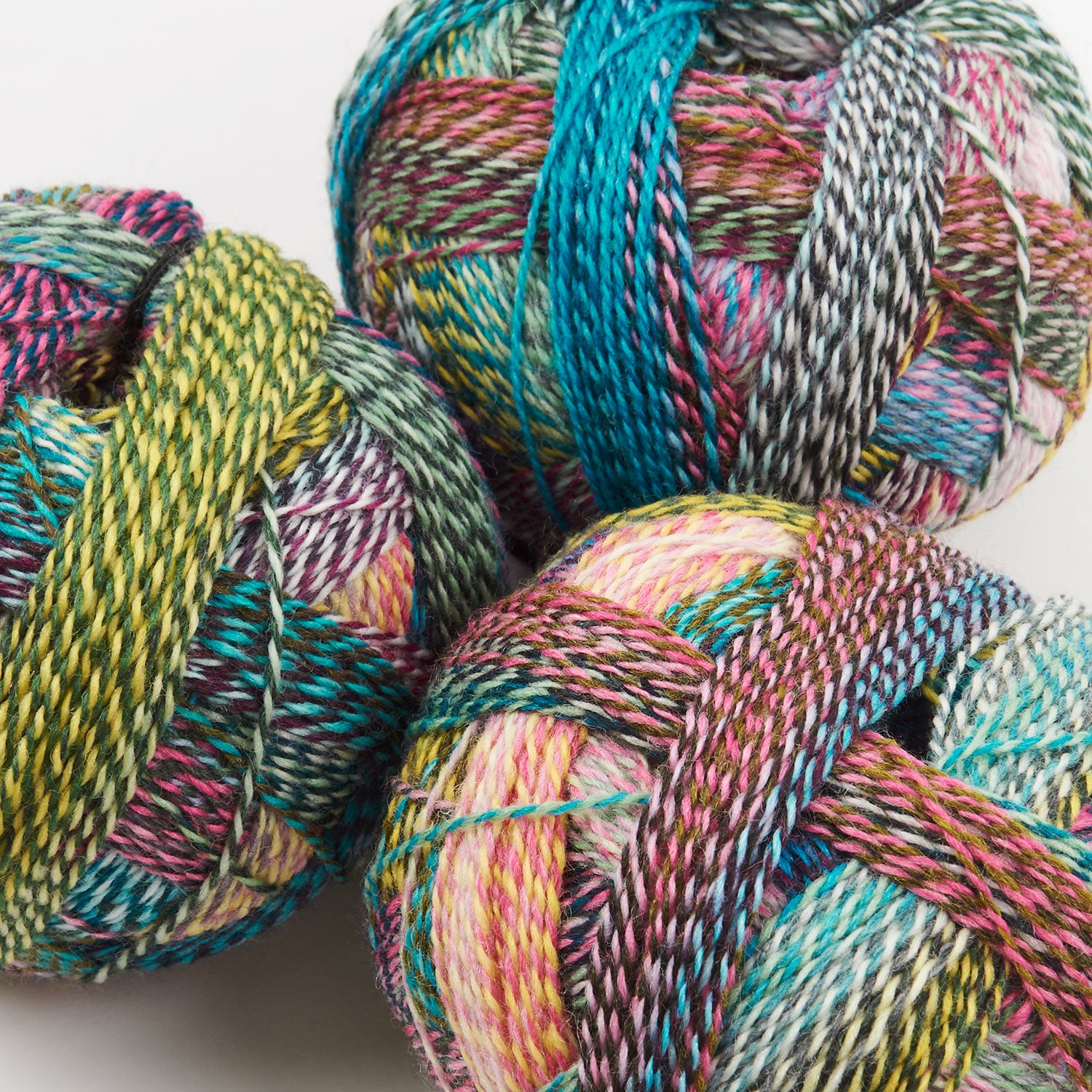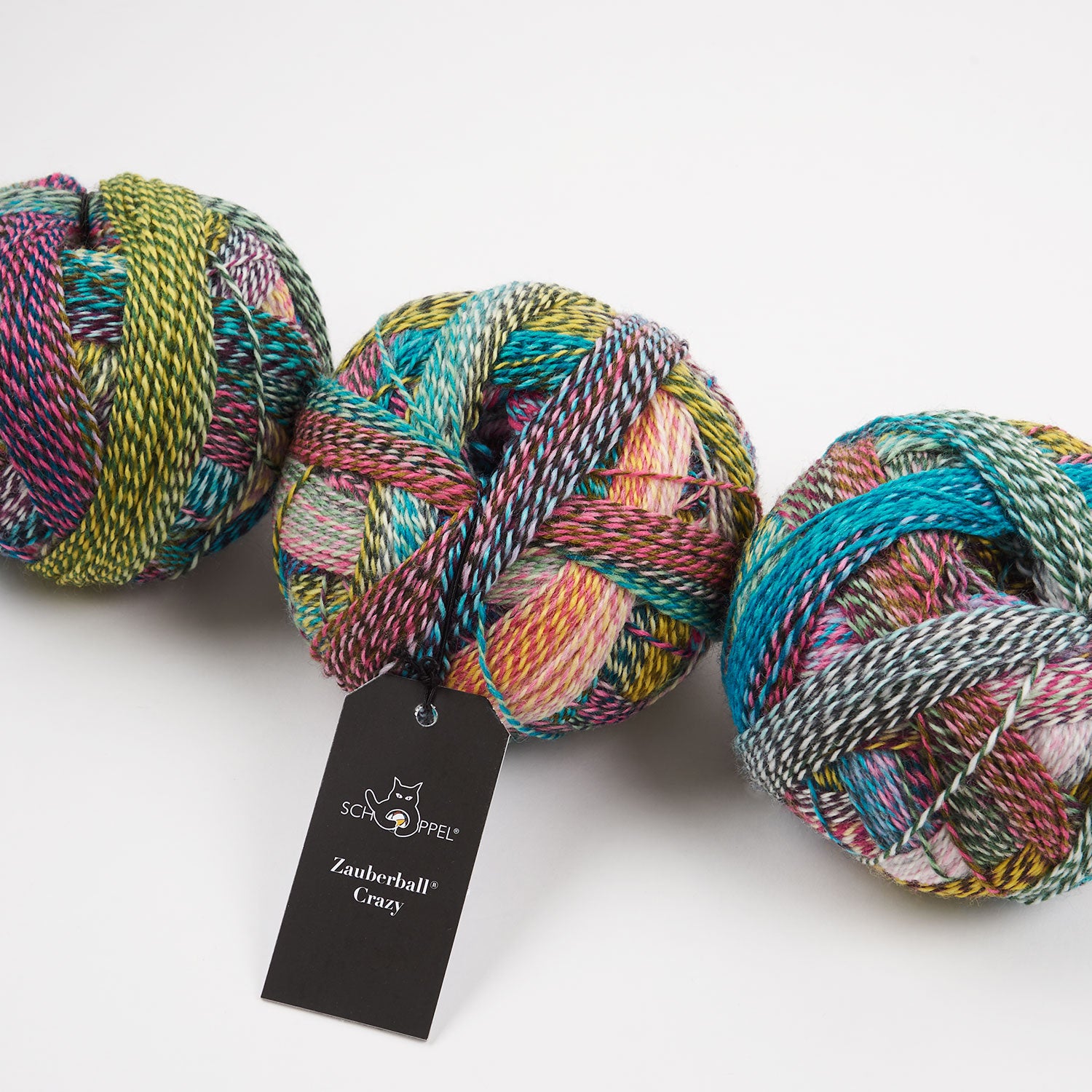 Self-striping Zauberball Crazy by Schoppel Wolle is a versatile fingering weight yarn that produces unique, non repeating colour blocks, perfect for fun accessories and shawls.