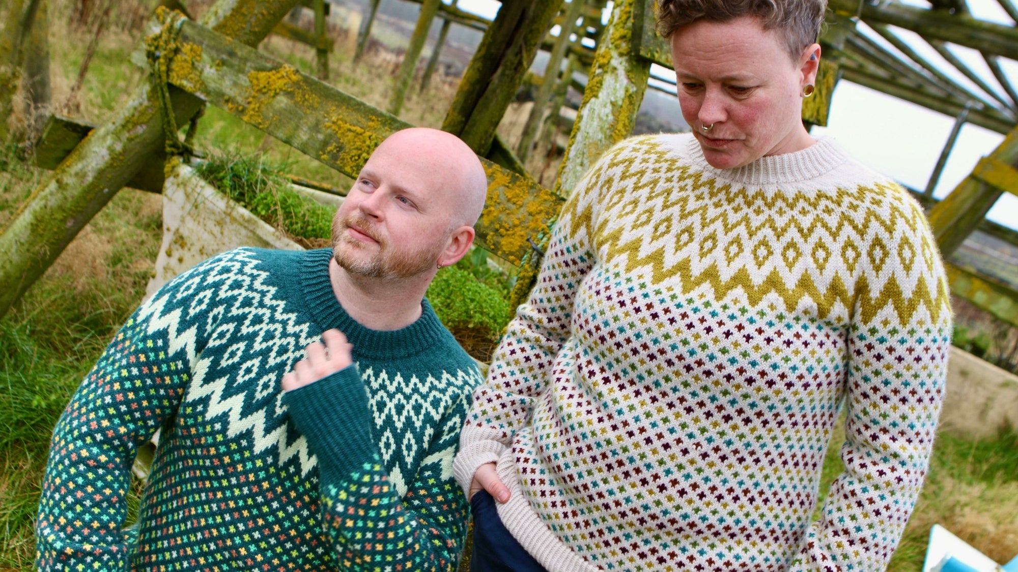 Stack of Painting Shawl books by Stephen West. Green books piled up and stools with a knitted shawls brightly displayed in the background.